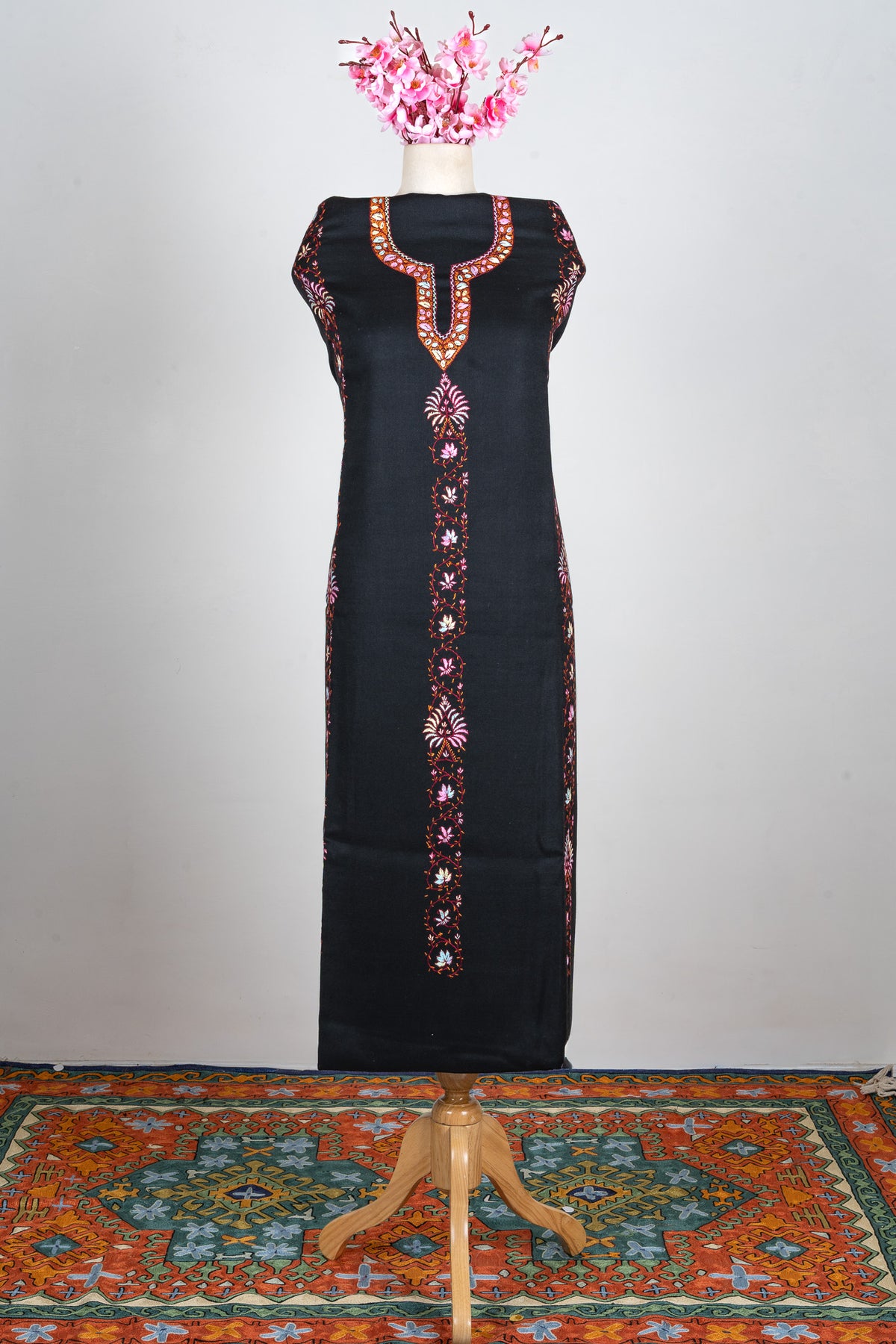 Classic yet bold, this black wool blend suit is elevated with meticulous Sozni hand embroidery in tones of coral, ivory, and maroon. The vertical embroidered panel and detailed neckline exude refined sophistication.