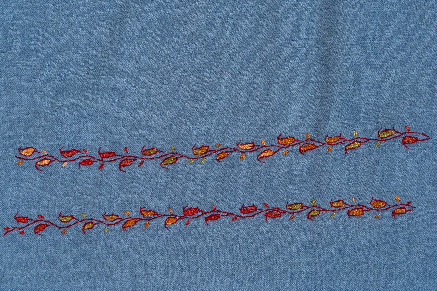Soft and serene, this sky blue wool blend suit is adorned with exquisite Sozni hand embroidery in shades of crimson and saffron. The cascading vertical patterns elongate the silhouette, adding a sense of poise and sophistication.