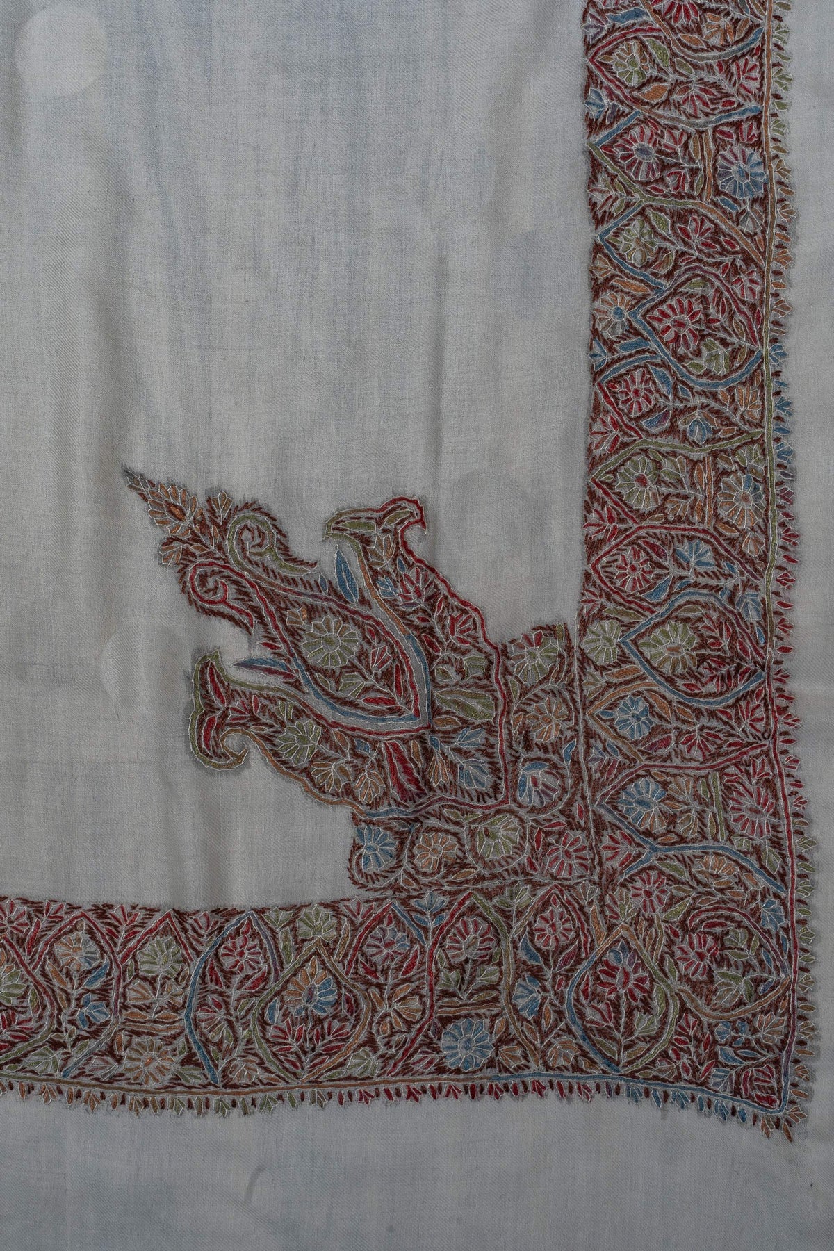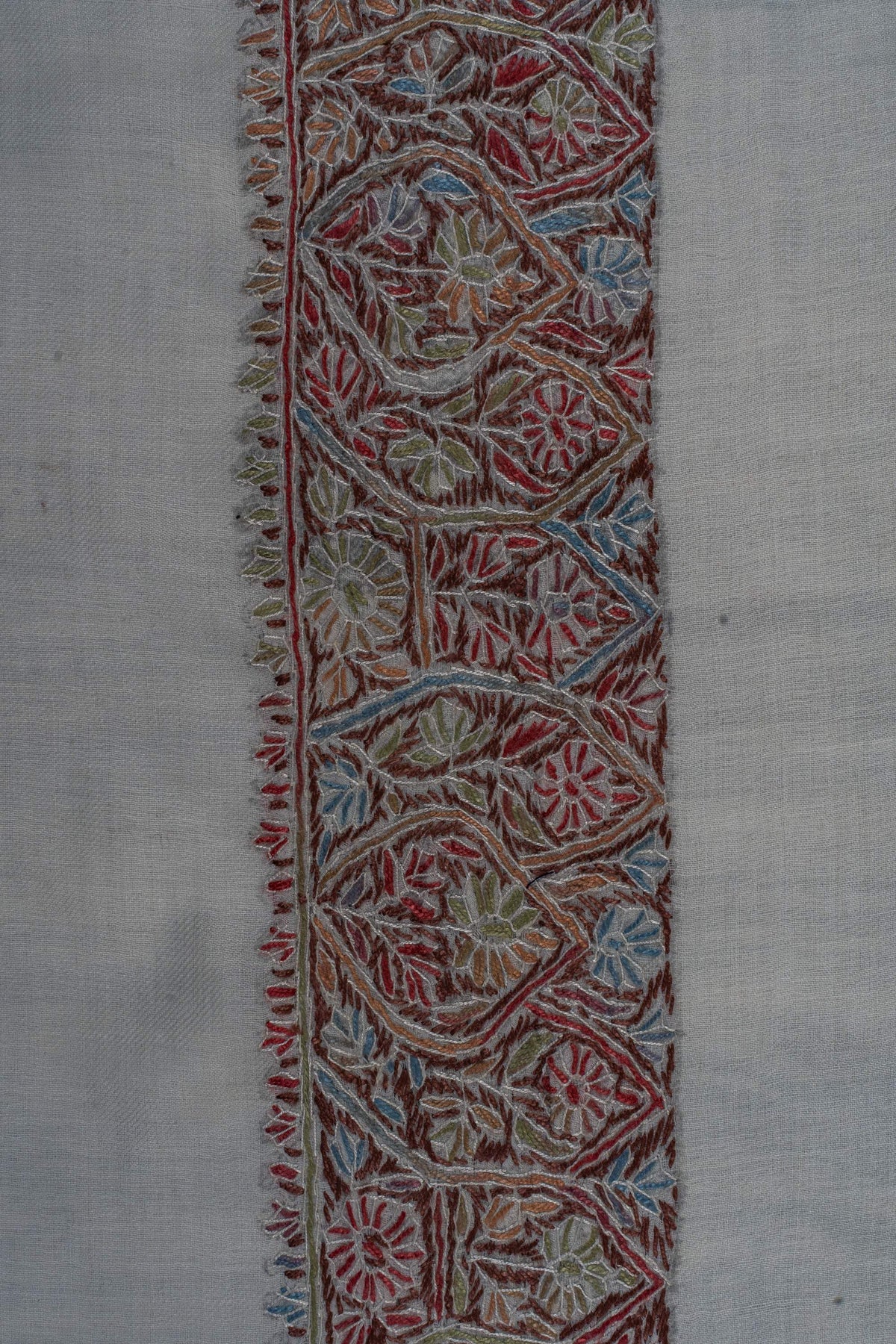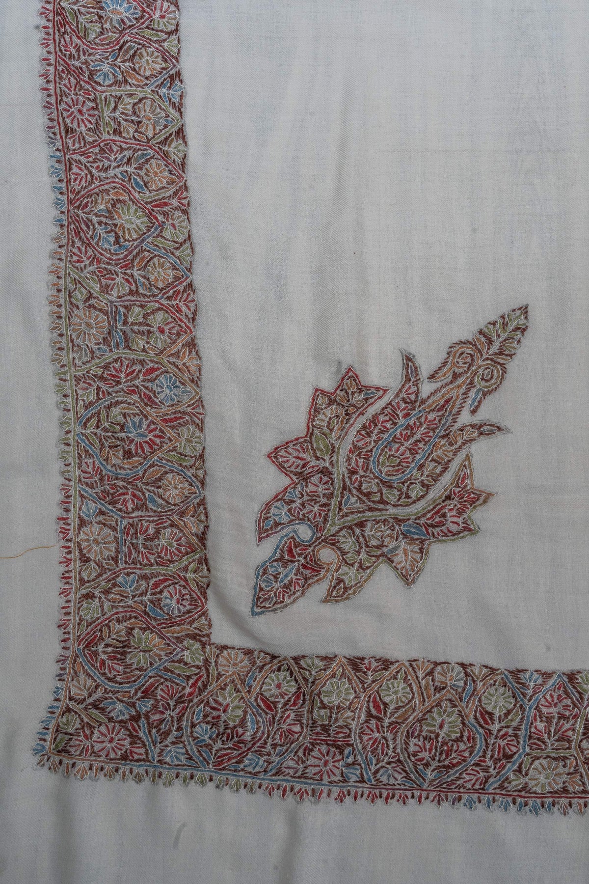 The embroidery is Sozni, showcasing dense handwork in earthy reds, moss green, muted blue, and warm ochre tones. An intricate corner paisley flows into a richly patterned border, reflecting the rhythm and depth of Kashmiri floral artistry. The result is a vibrant yet balanced piece that adds character and timeless charm to both ethnic and modern attire.