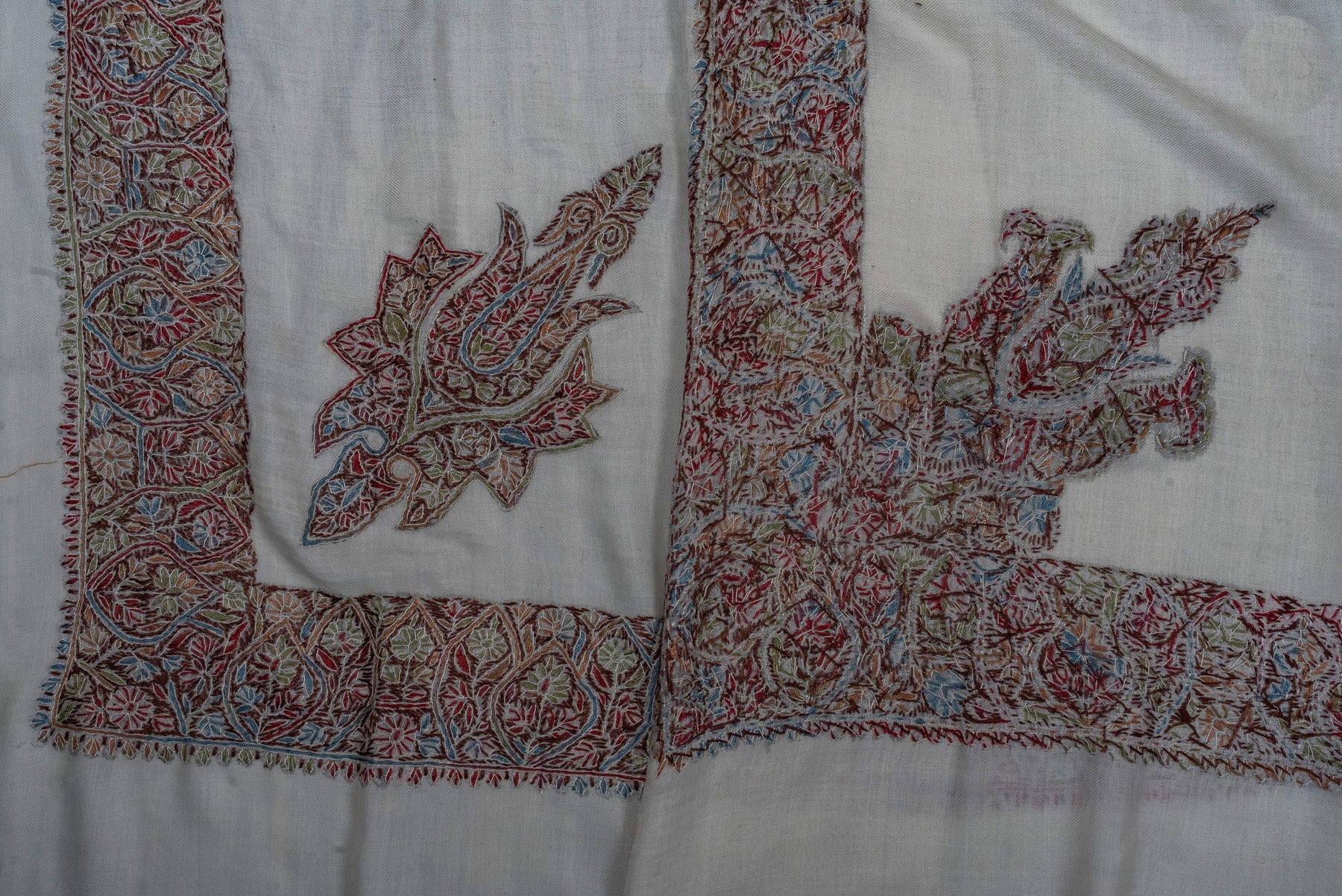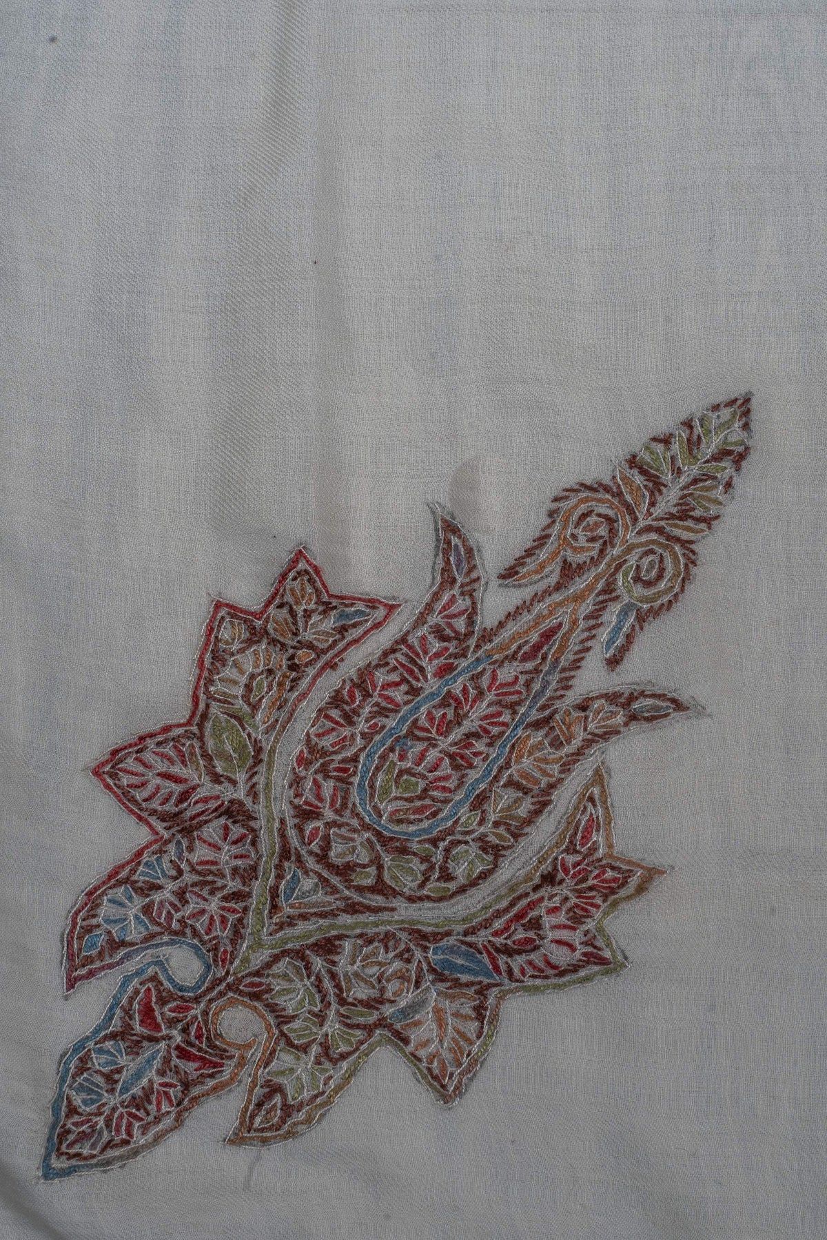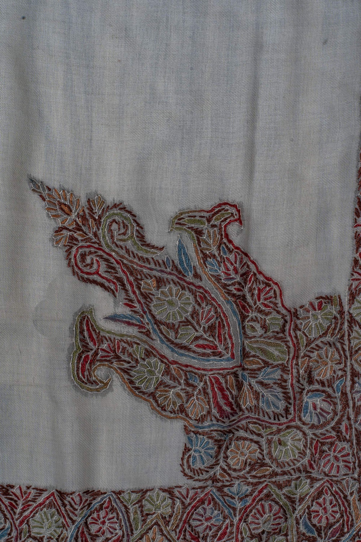 The embroidery is Sozni, showcasing dense handwork in earthy reds, moss green, muted blue, and warm ochre tones. An intricate corner paisley flows into a richly patterned border, reflecting the rhythm and depth of Kashmiri floral artistry. The result is a vibrant yet balanced piece that adds character and timeless charm to both ethnic and modern attire.
