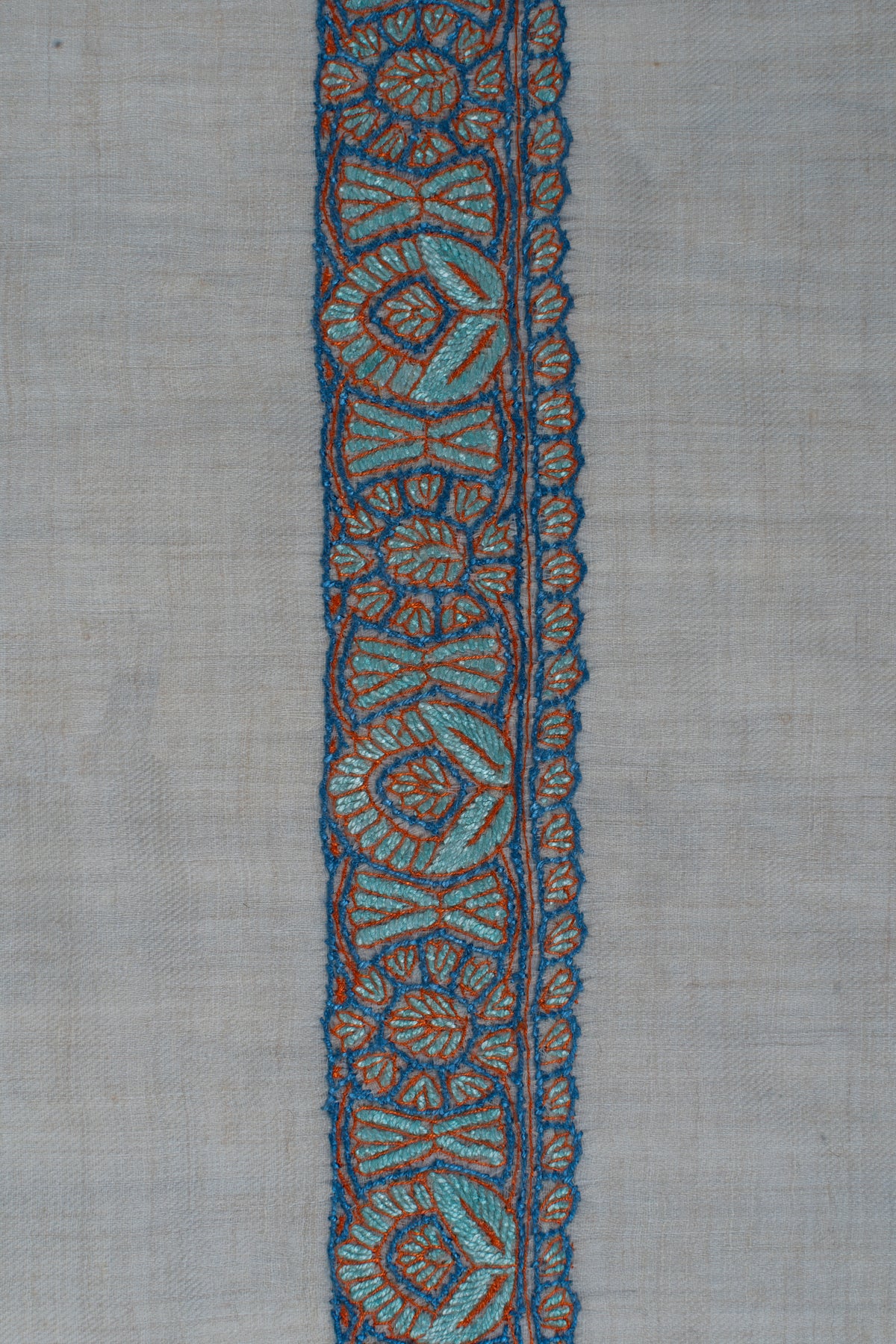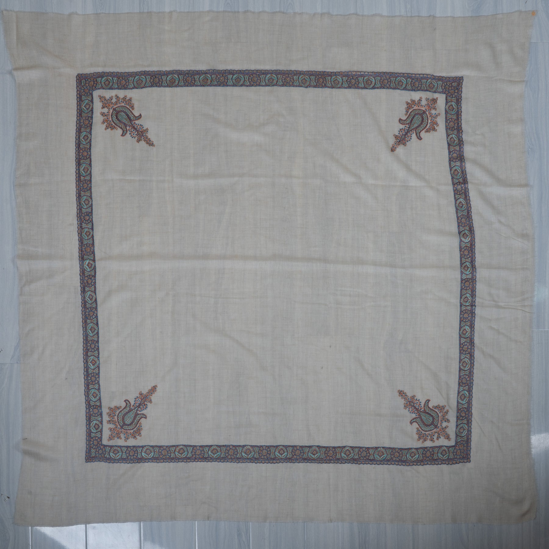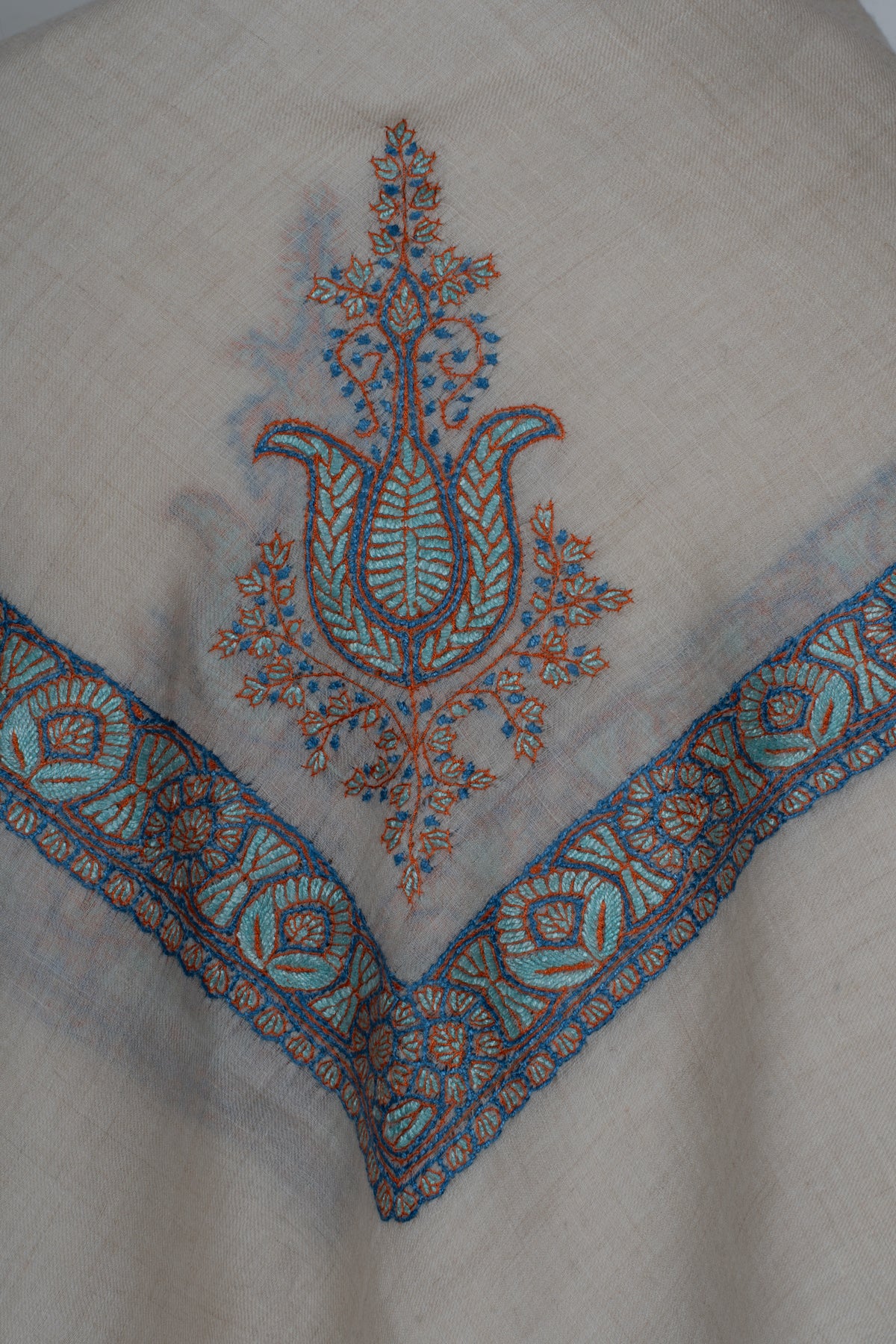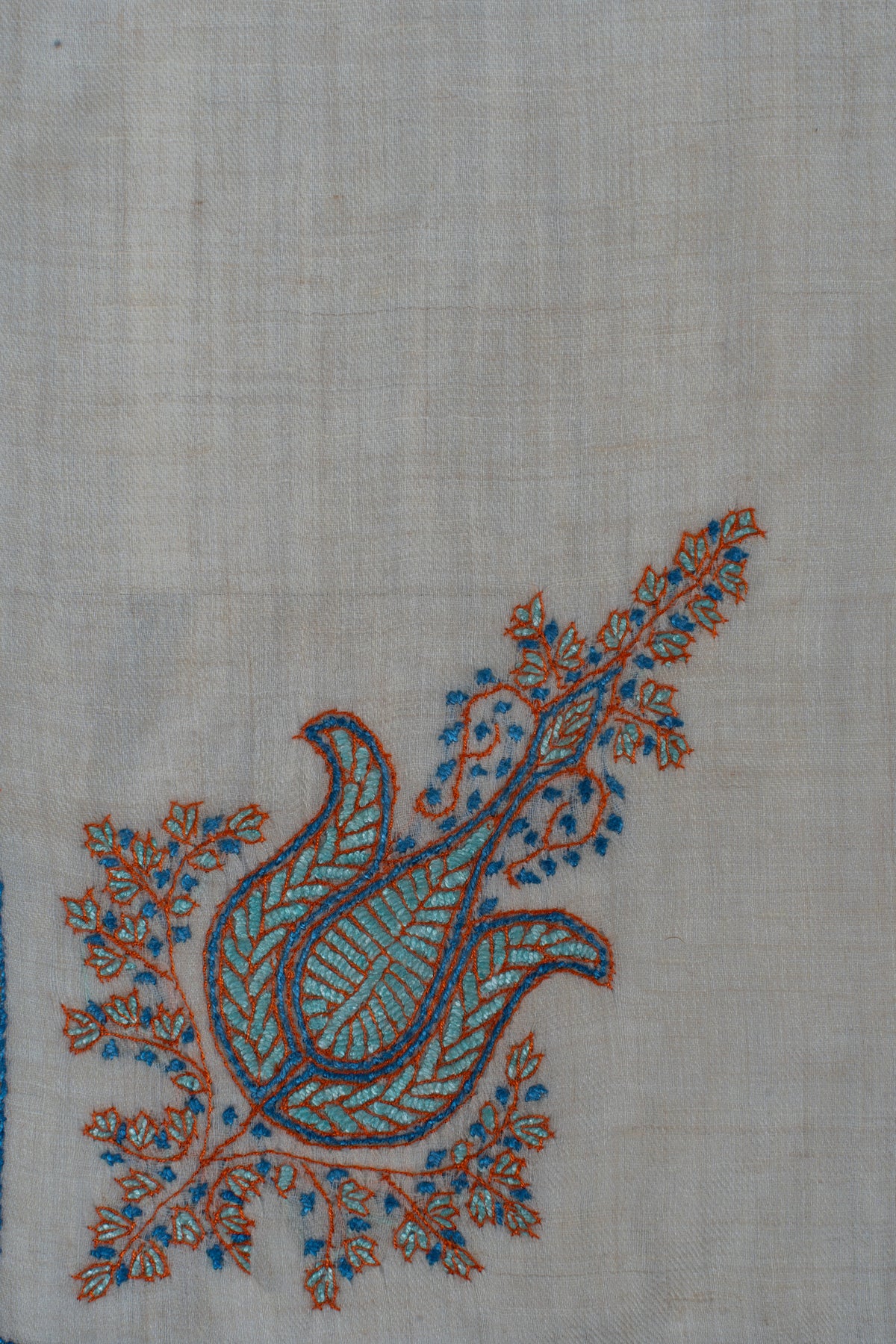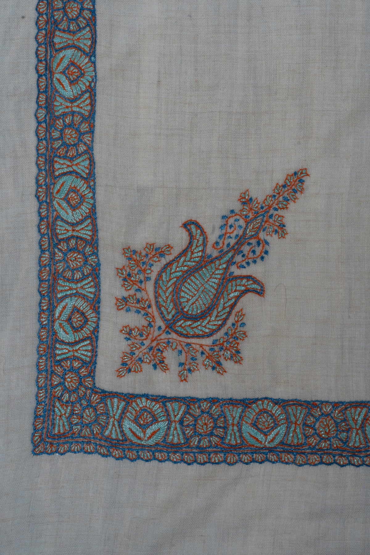 The embroidery is Sozni, the most intricate of Kashmiri needlework, executed entirely by hand. A bold paisley motif glows at the center, stitched in warm ember orange and teal blue, framed by a rhythmic V-shaped border. The contrast against the soft ivory base gives this Rumal a vibrant yet balanced character.