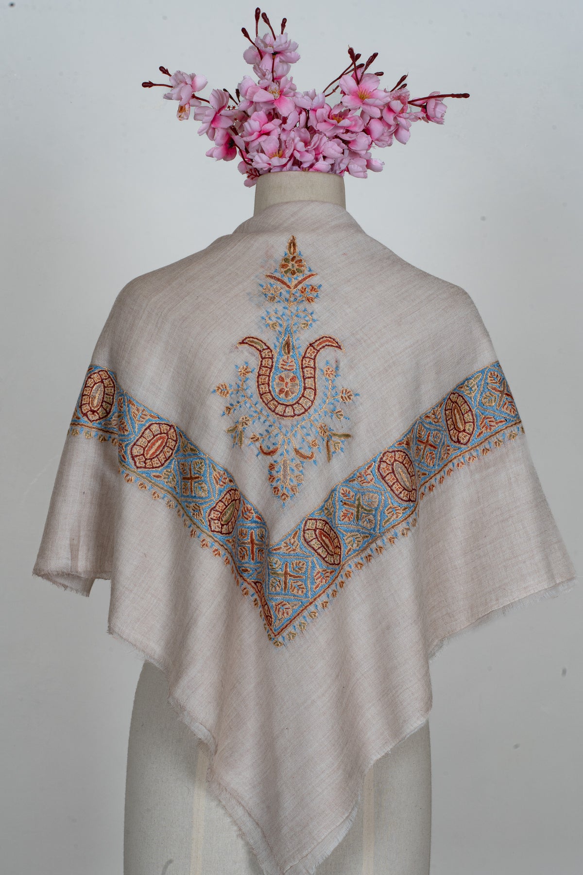 The embroidery is Sozni, the most intricate of Kashmiri needlework, executed entirely by hand. An elegant central paisley rises above a geometric border lattice, accented with four floral corner motifs. Delicate shades of sky blue, muted rust, ivory, and warm sand unfold over a soft neutral base, creating a calm yet striking composition that pairs effortlessly with abayas, kaftans, or contemporary attire.