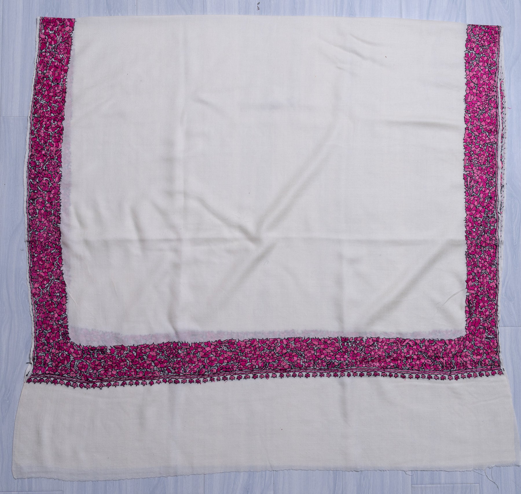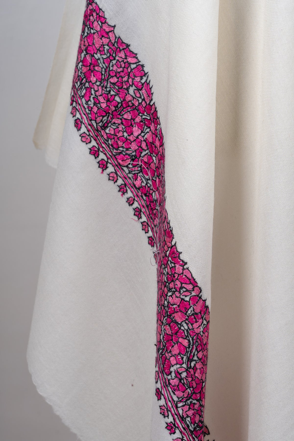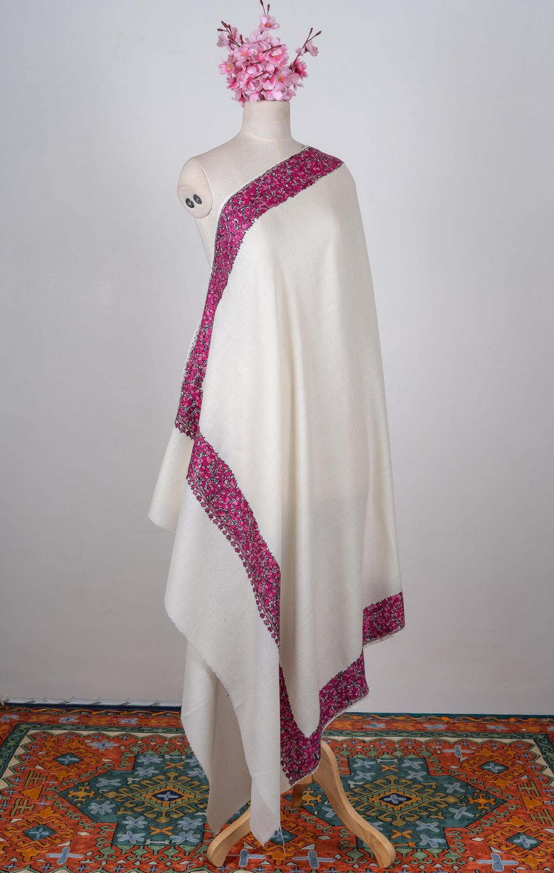 A pure Merino Wool canvas meets the richness of traditional Sozni Hand Embroidery in this stunning border-work shawl. The vivid fuchsia embroidery adds a bright yet graceful contrast to the soft ivory wool, creating a striking but balanced visual appeal.