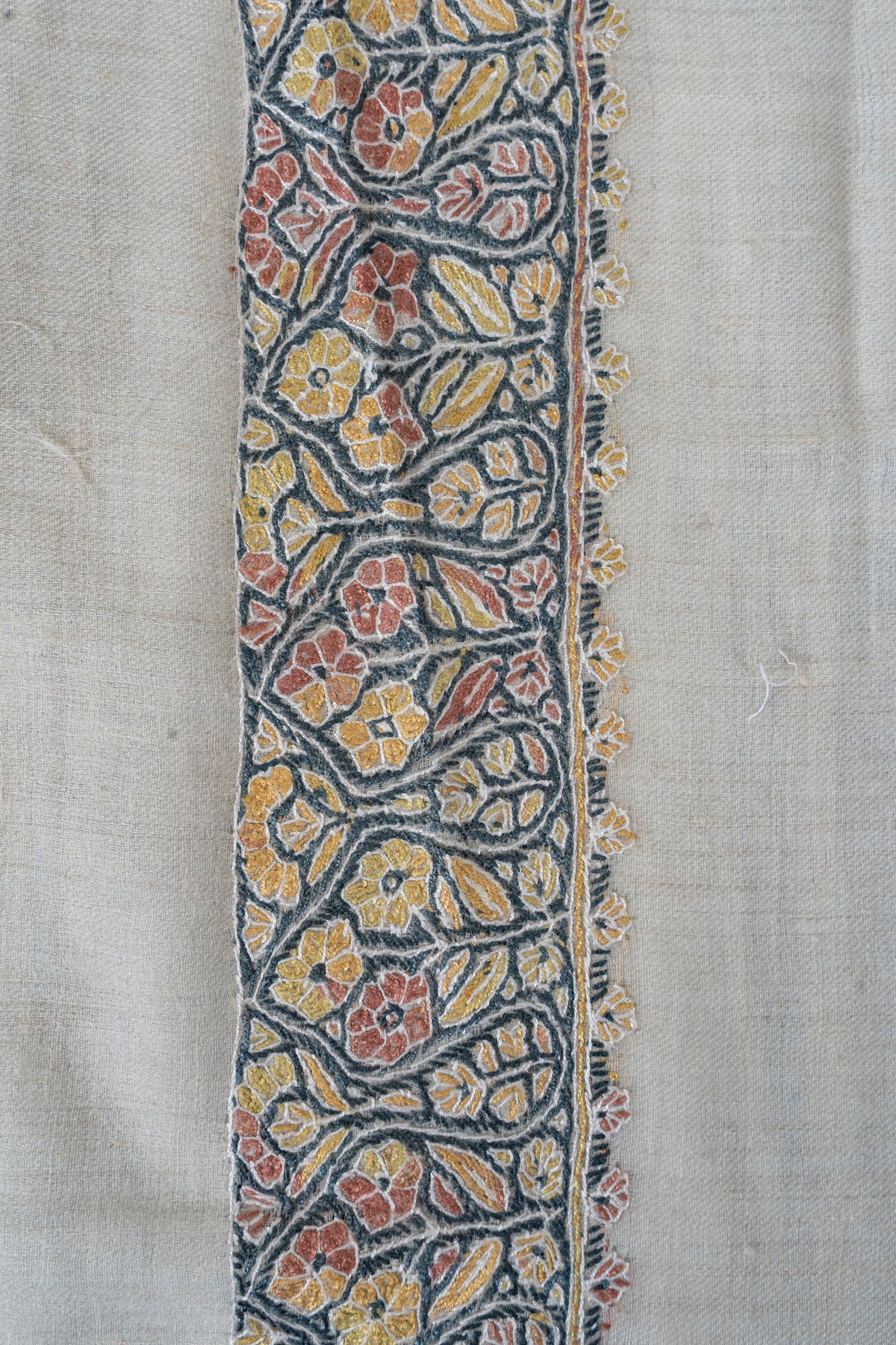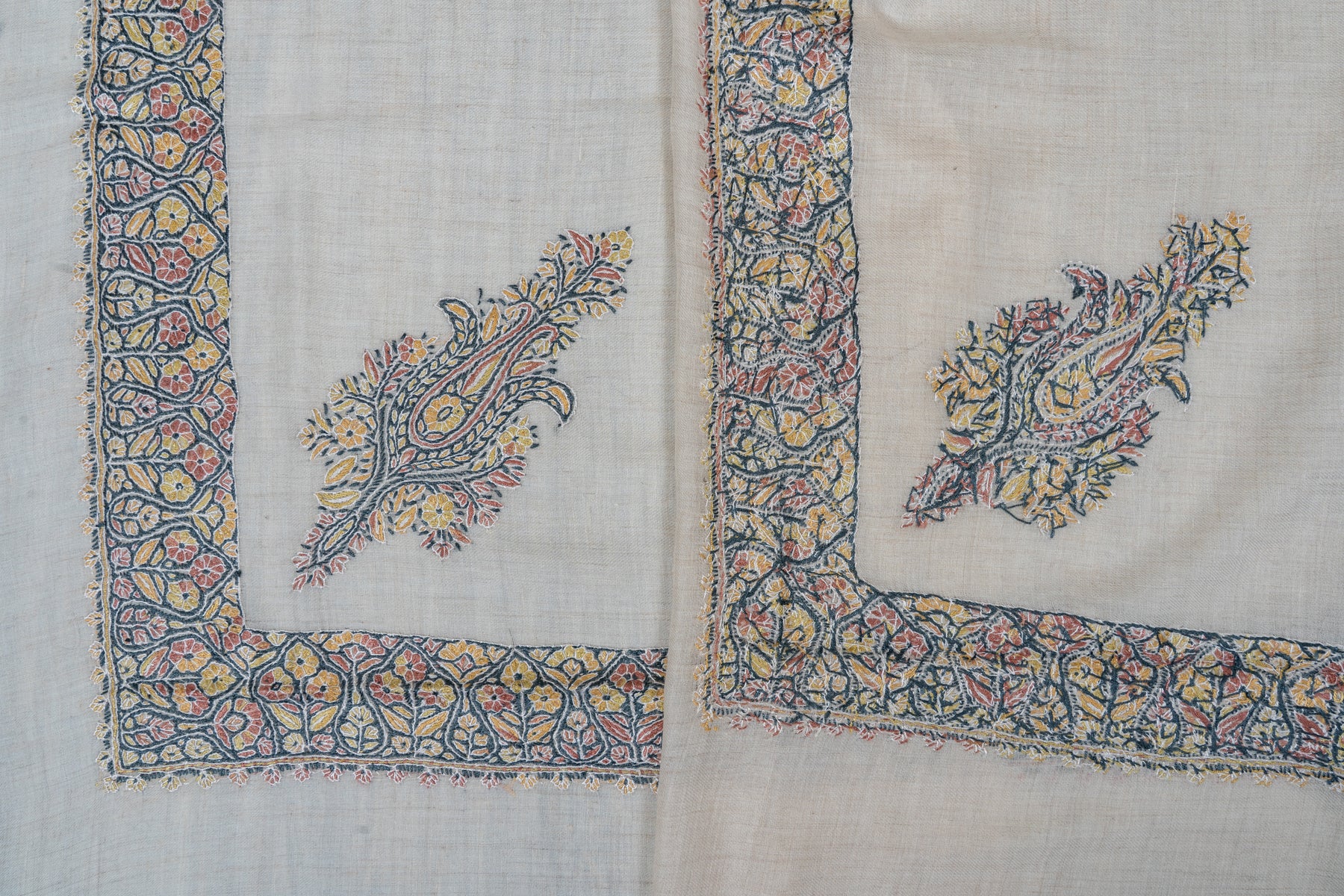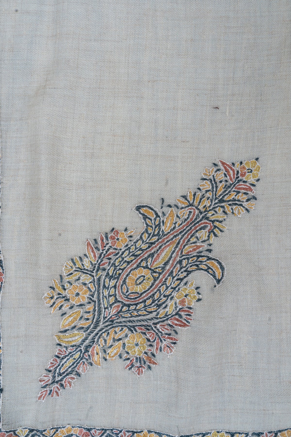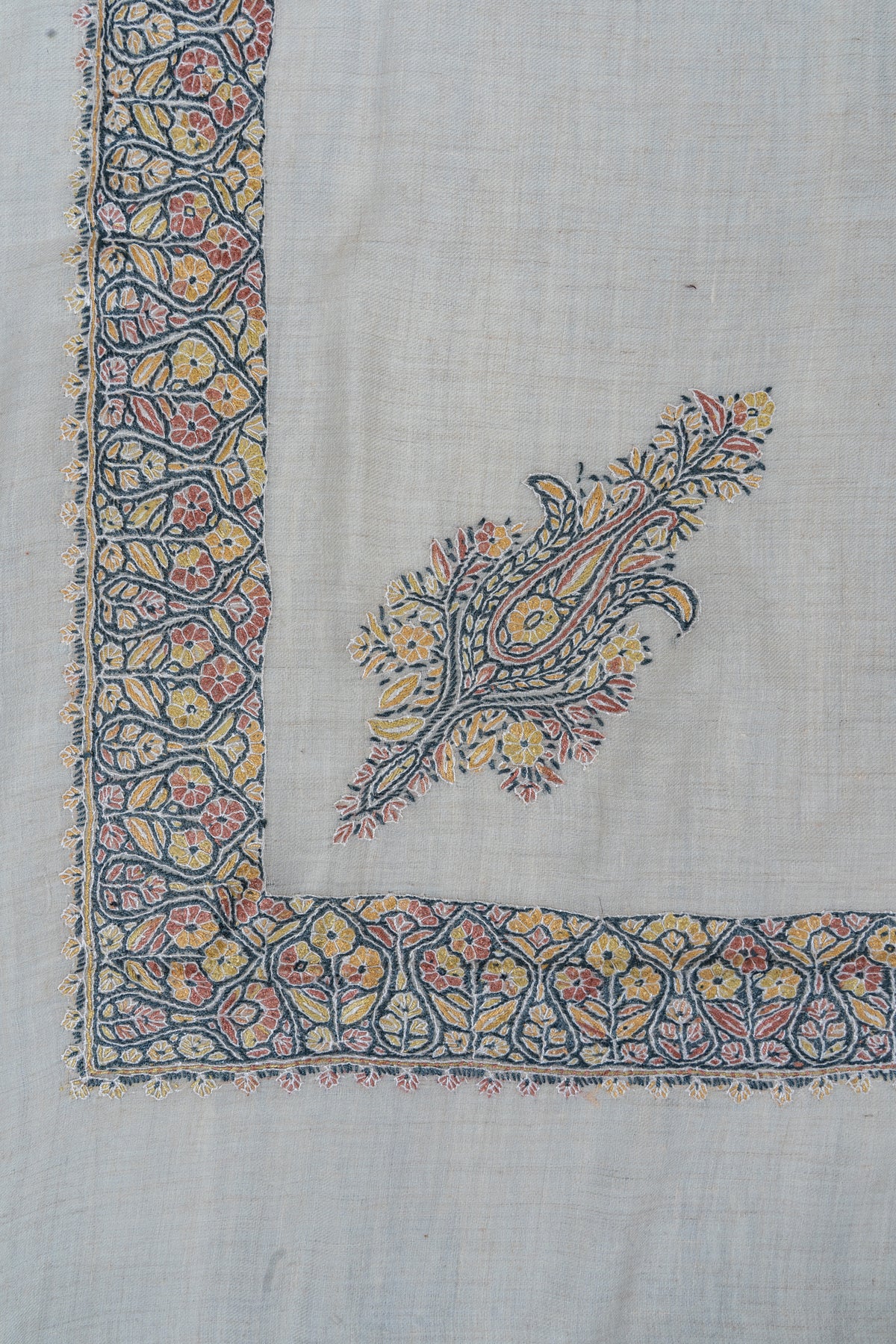 Woven in a warm ivory base, this is adorned with hand-embroidered floral and paisley motifs arranged in a graceful V-shaped border, complemented by a central medallion. Shades of muted coral, soft yellow, slate blue, and antique grey are stitched delicately by hand, giving the piece a calm, luminous presence.