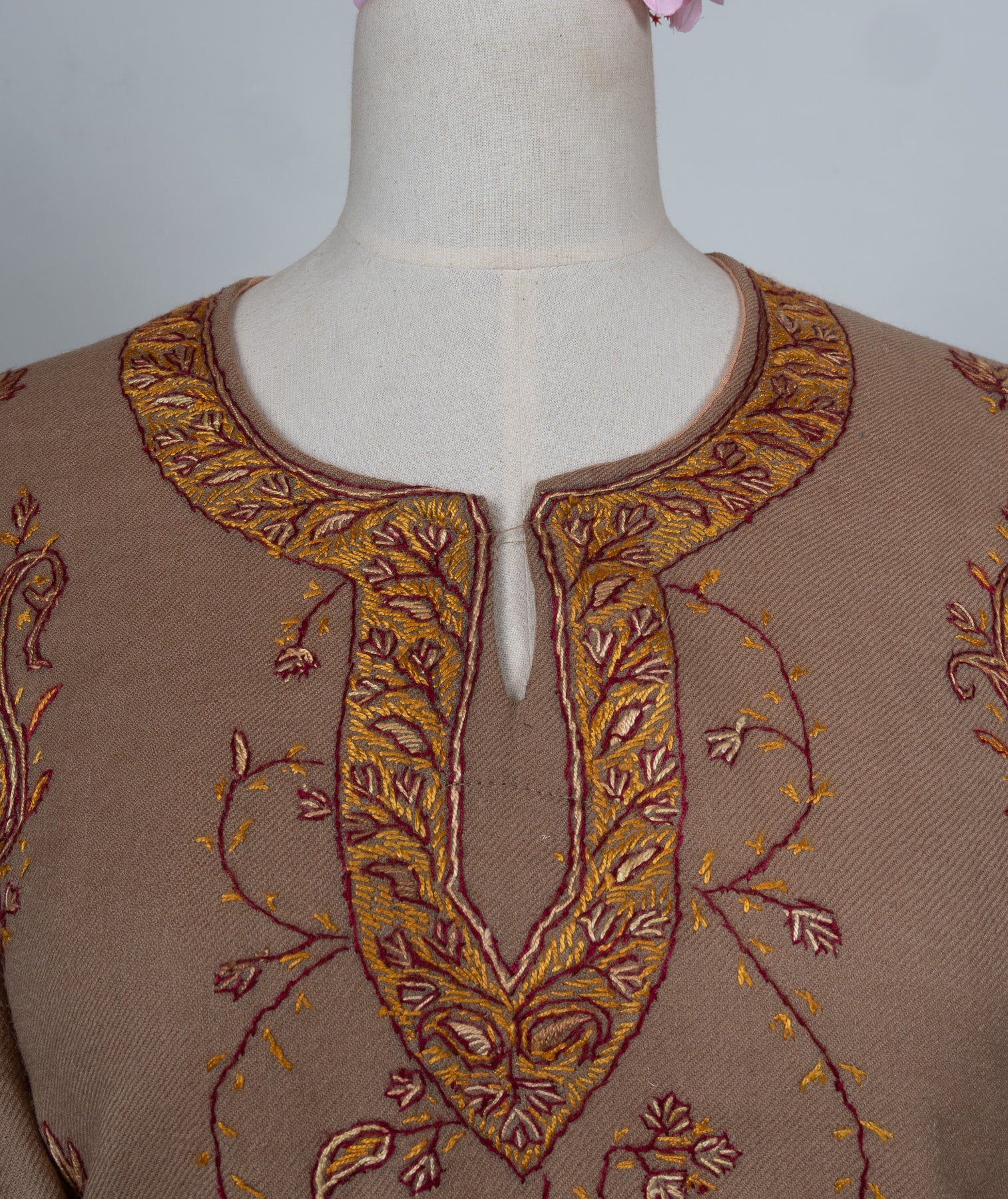 This soft mocha-toned Pheran features minimal yet expressive Sozni Hand Embroidered motifs placed across the back and sleeves, giving it a composed and refined aesthetic. The scattered embroidery maintains balance without overpowering the fabric’s natural elegance.