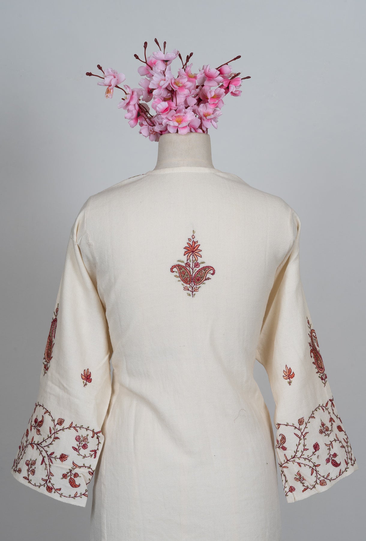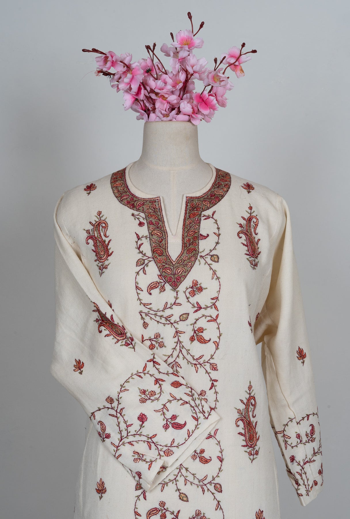 This pearl-white Pheran is adorned with flowing Sozni Hand Embroidered vine and paisley motifs that travel gracefully across the front, sleeves, and neckline. The soft contrast of warm rust and muted olive threads creates a design that feels delicate yet deeply expressive.