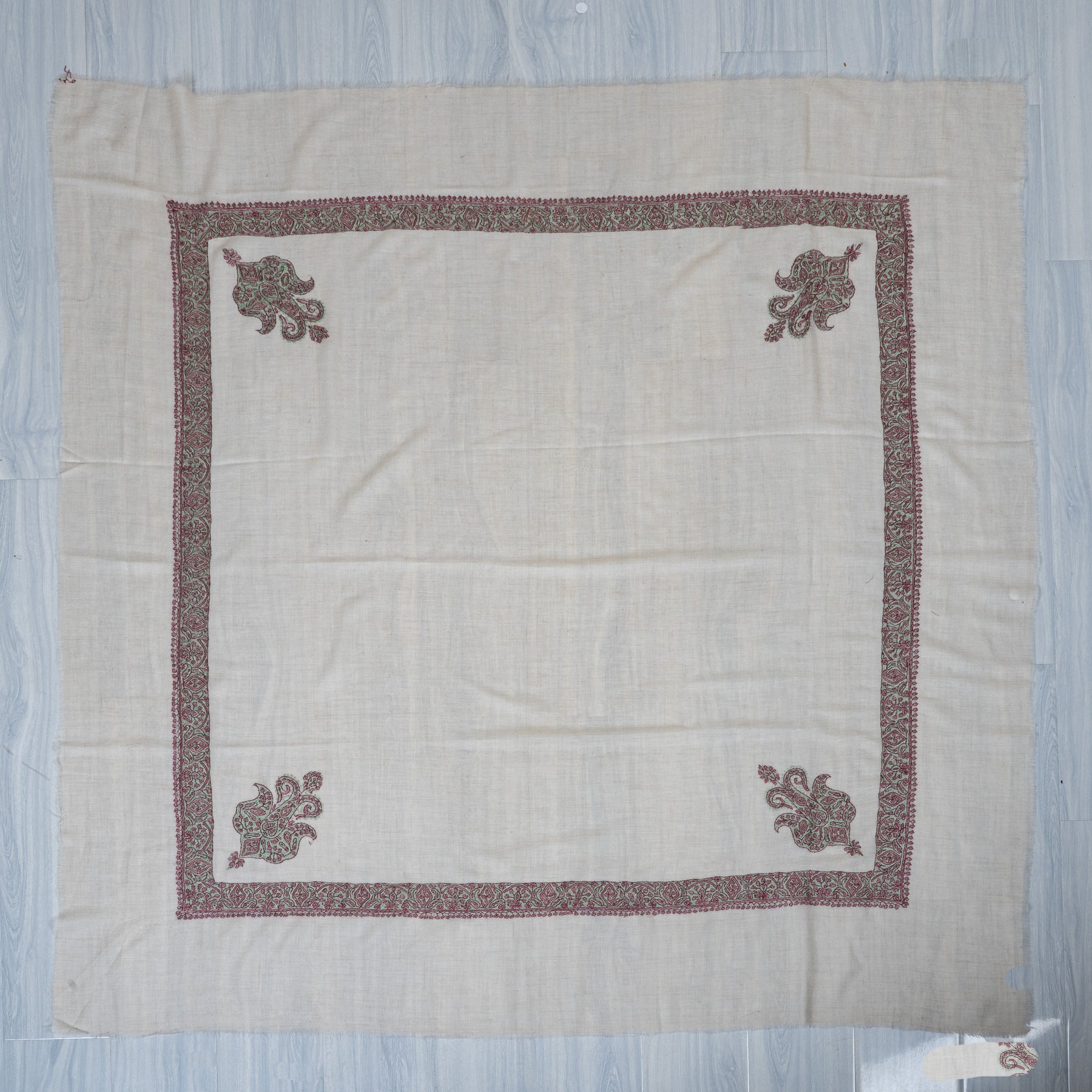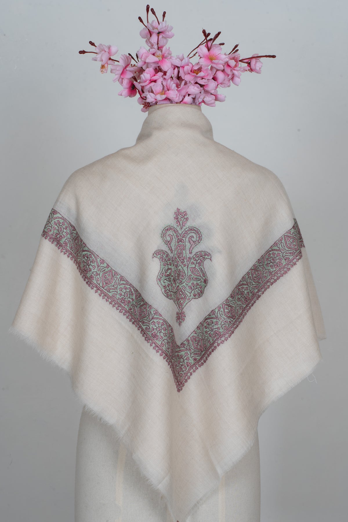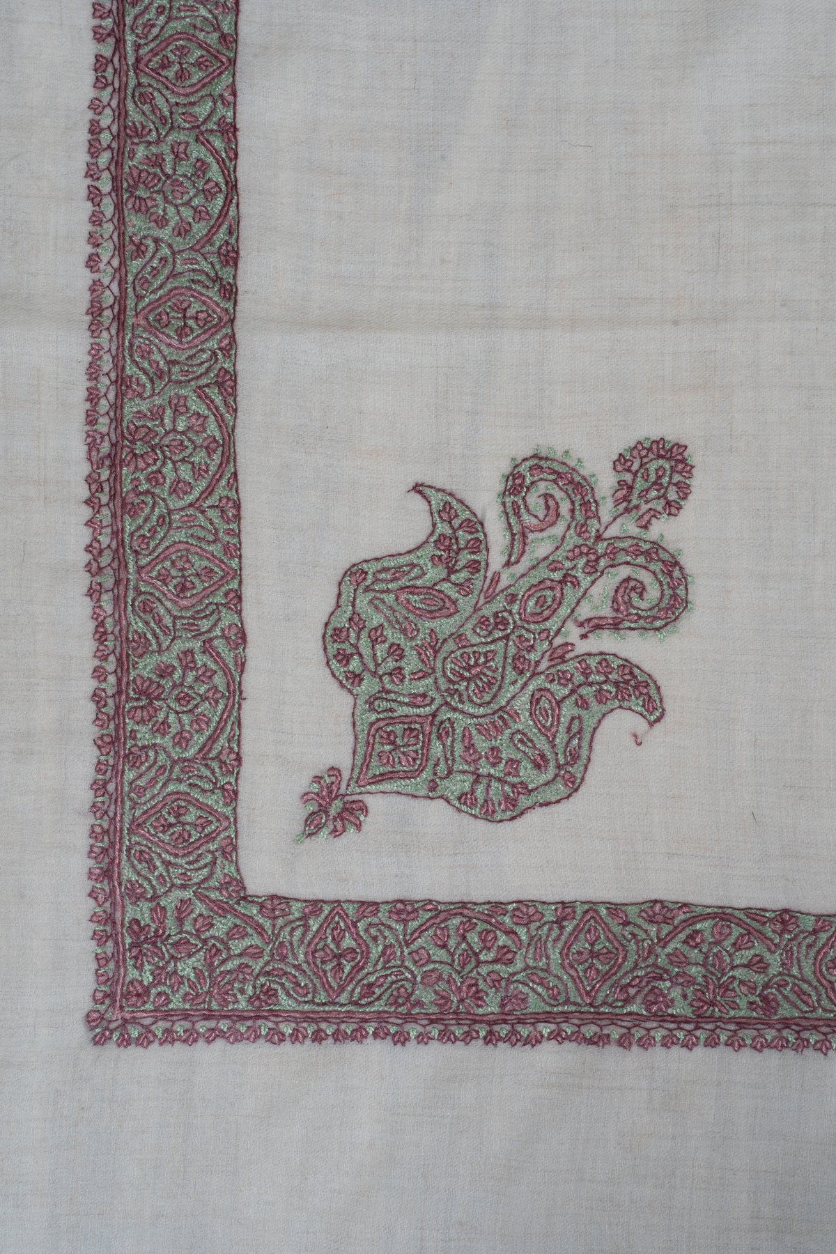 The embroidery is Sozni, the most intricate of Kashmiri needlework, executed entirely by hand. A fluid paisley motif is paired with a delicate V-shaped border, stitched in dusty rose and soft sage green hues. Balanced against a creamy base, the overall effect is gentle, refined, and quietly romantic.