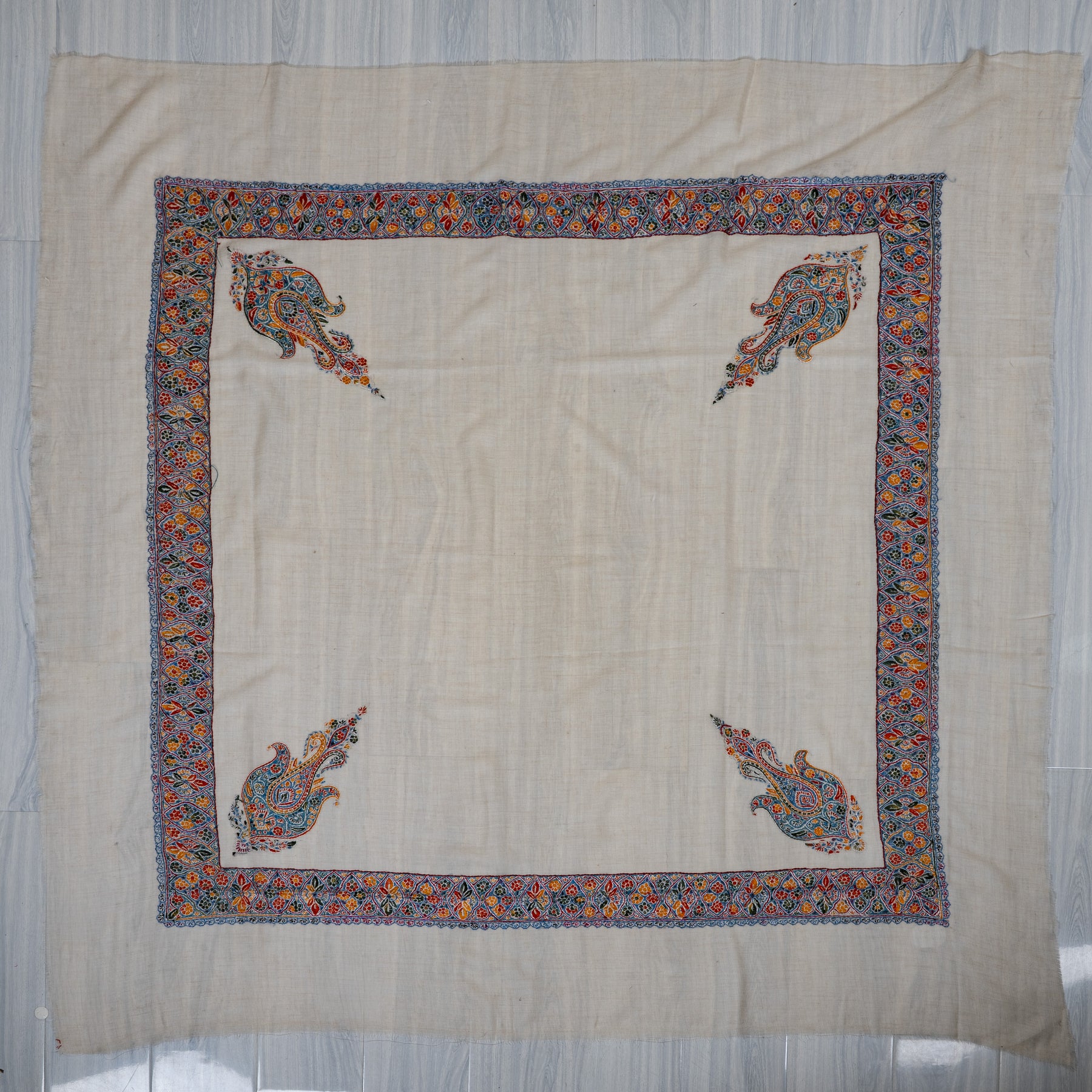 The embroidery is Sozni, the most intricate of Kashmiri needlework, executed entirely by hand. A vibrant central paisley blooms into an elaborate border of floral tiles, worked in shades of saffron gold, teal blue, ember red, and soft charcoal. Balanced against a creamy base, this Rumal feels lively yet refined, celebrating the expressive side of Kashmiri artistry.