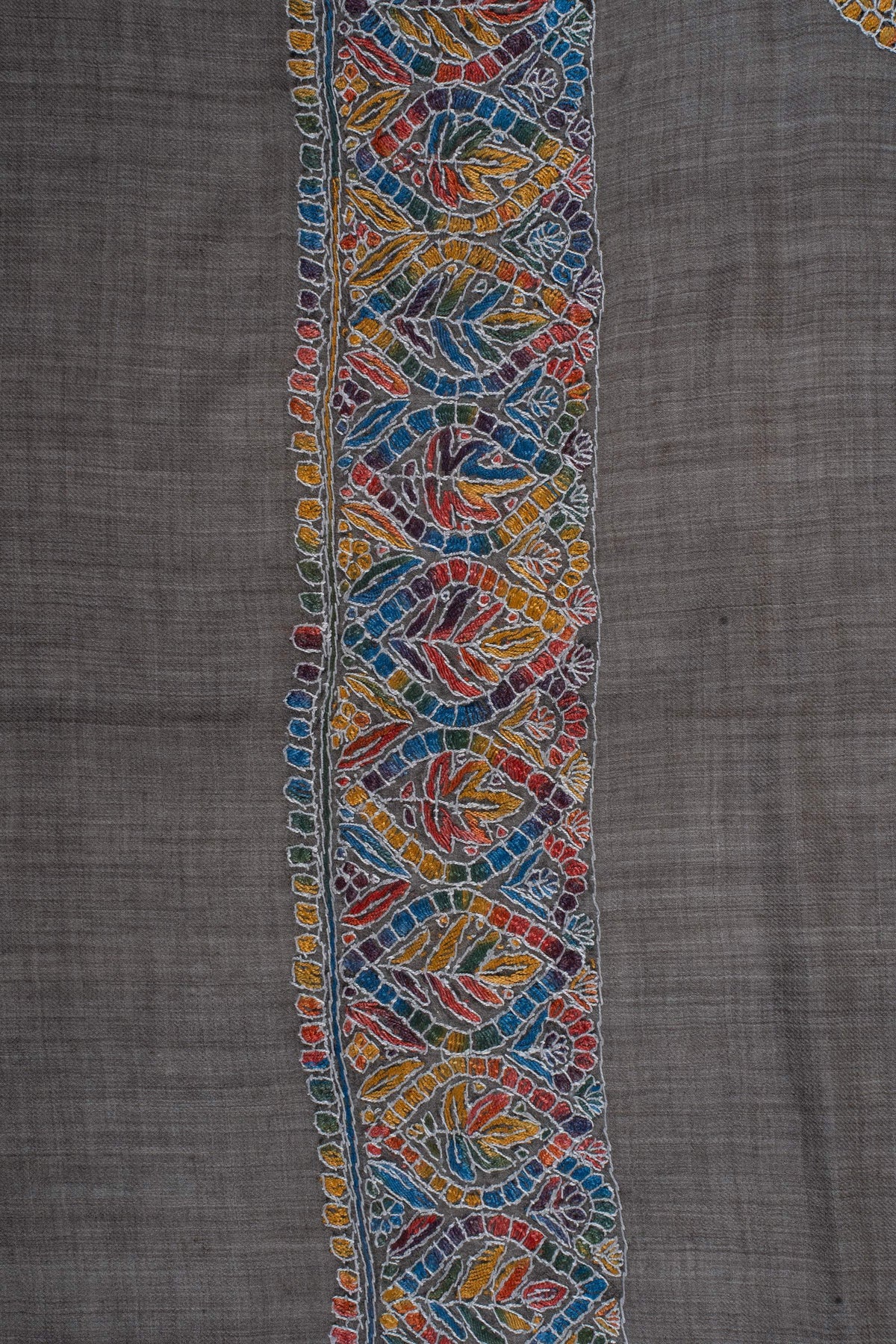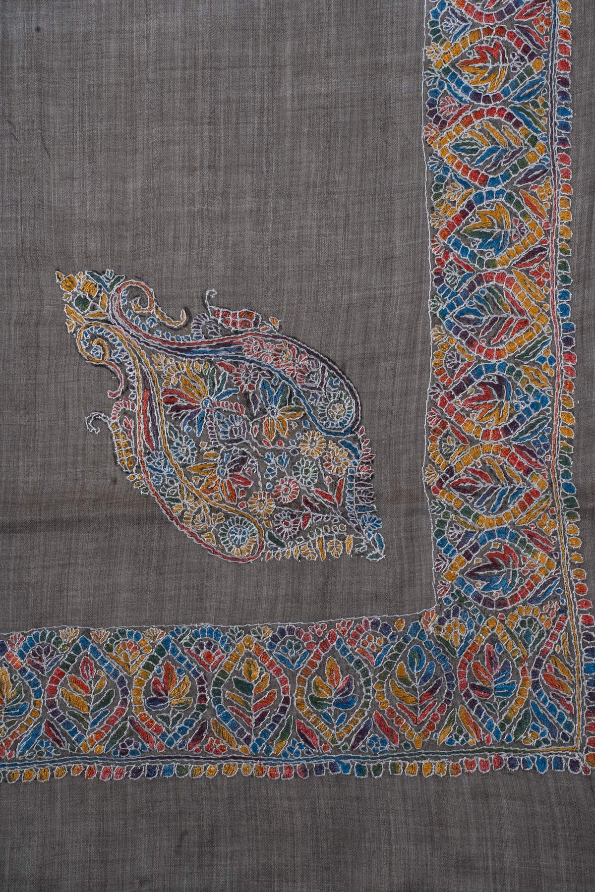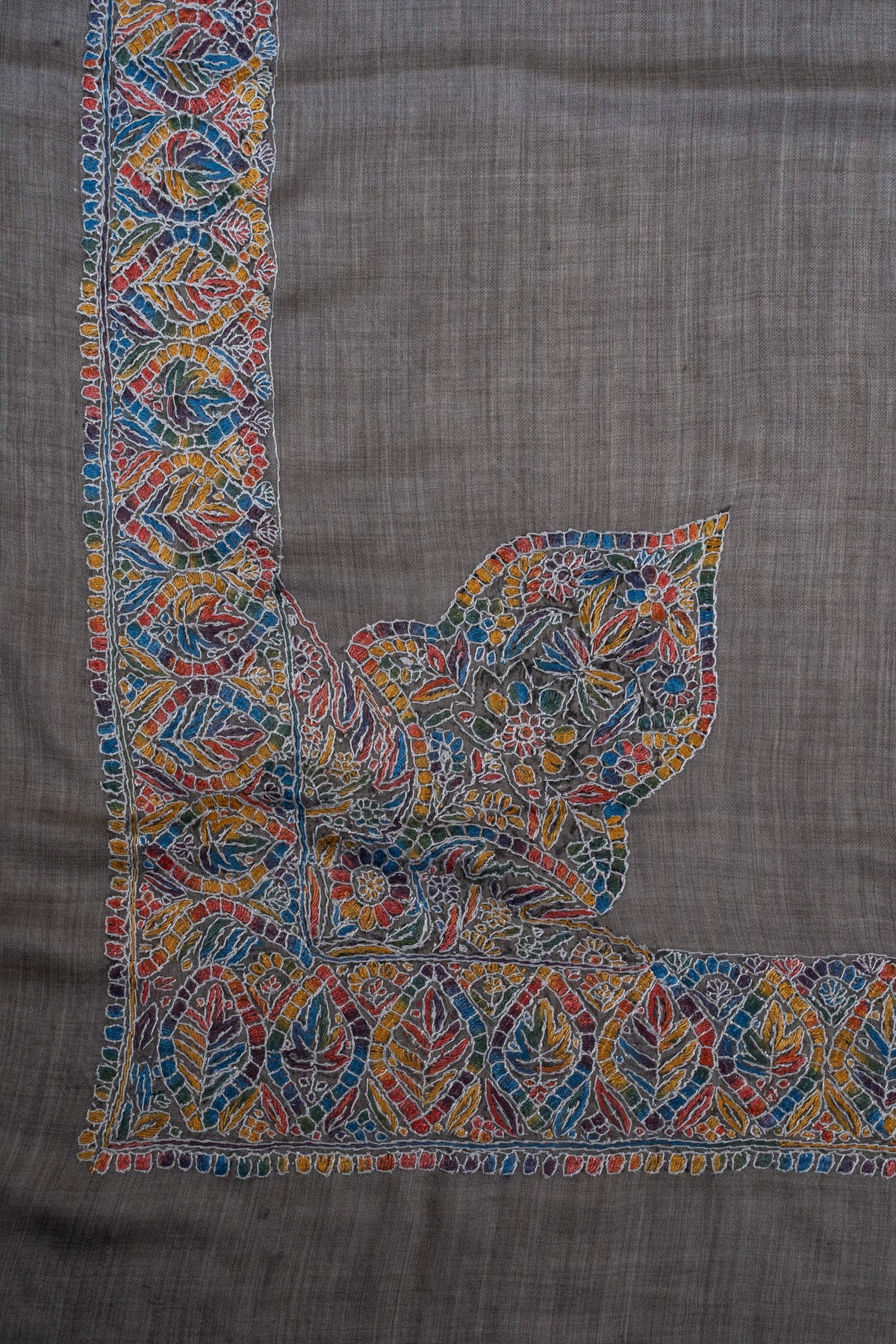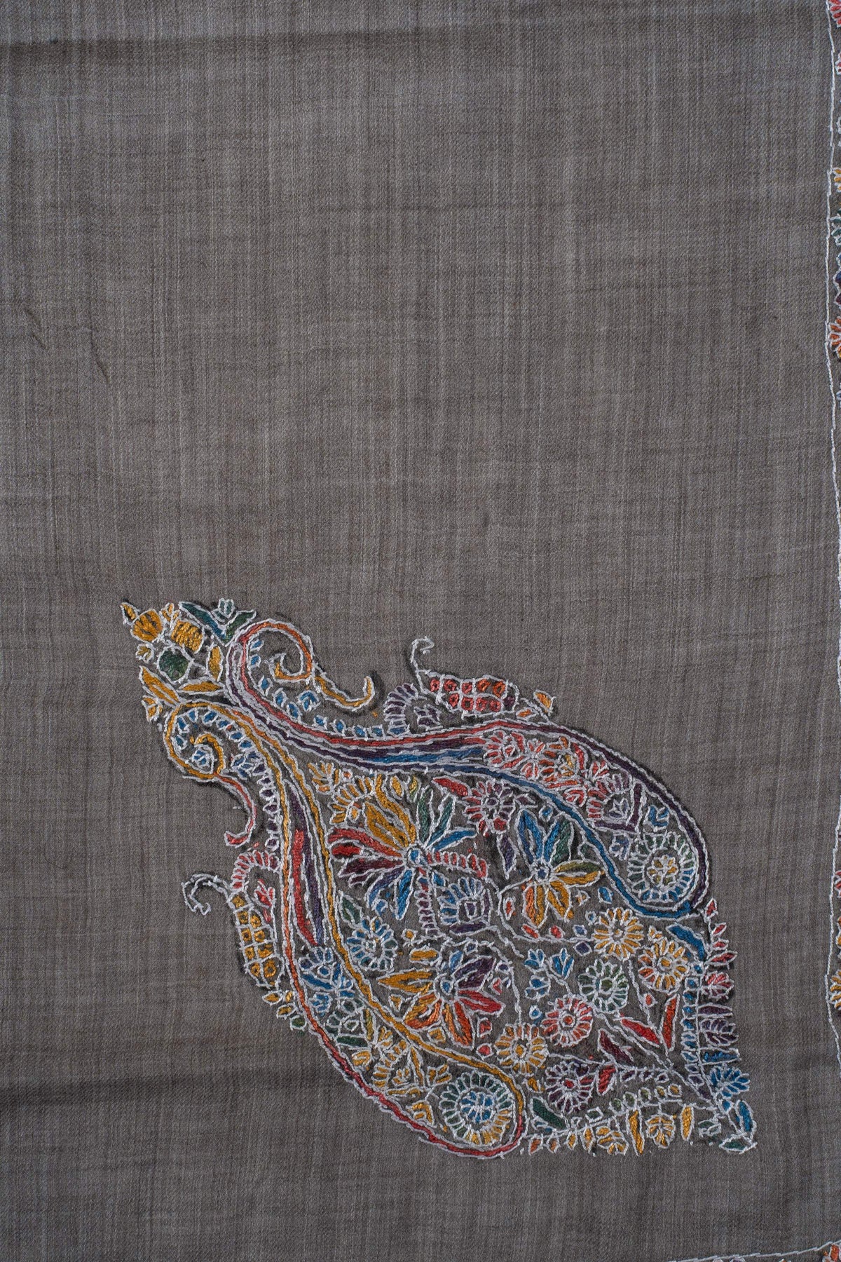 The embroidery is Sozni, the most intricate form of Kashmiri needlework, executed entirely by hand. A richly detailed border in warm rust, ochre, teal, and muted blue unfolds over a deep slate-grey base, anchored by an ornate central motif. The multicolored palette lends depth and character, making this Rumal a striking yet versatile statement for both traditional and contemporary wardrobes.