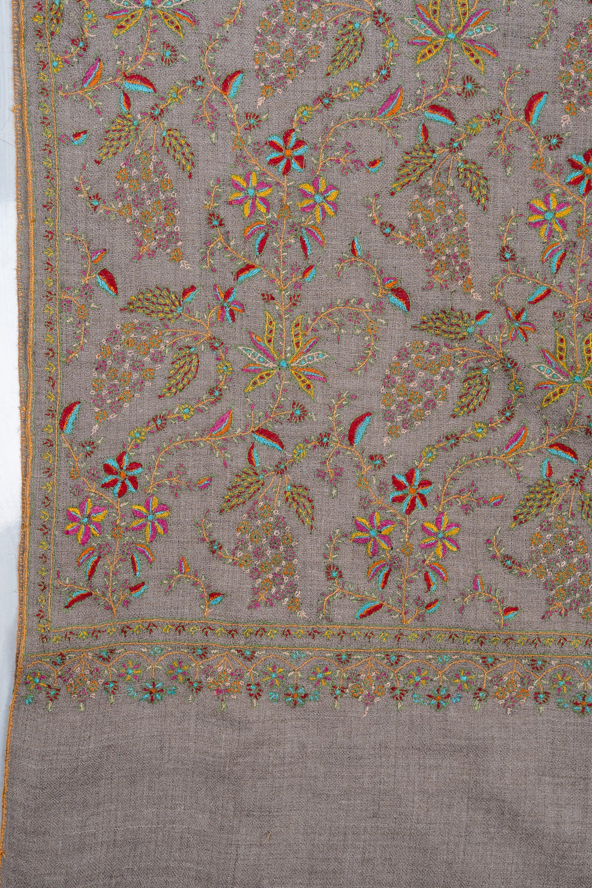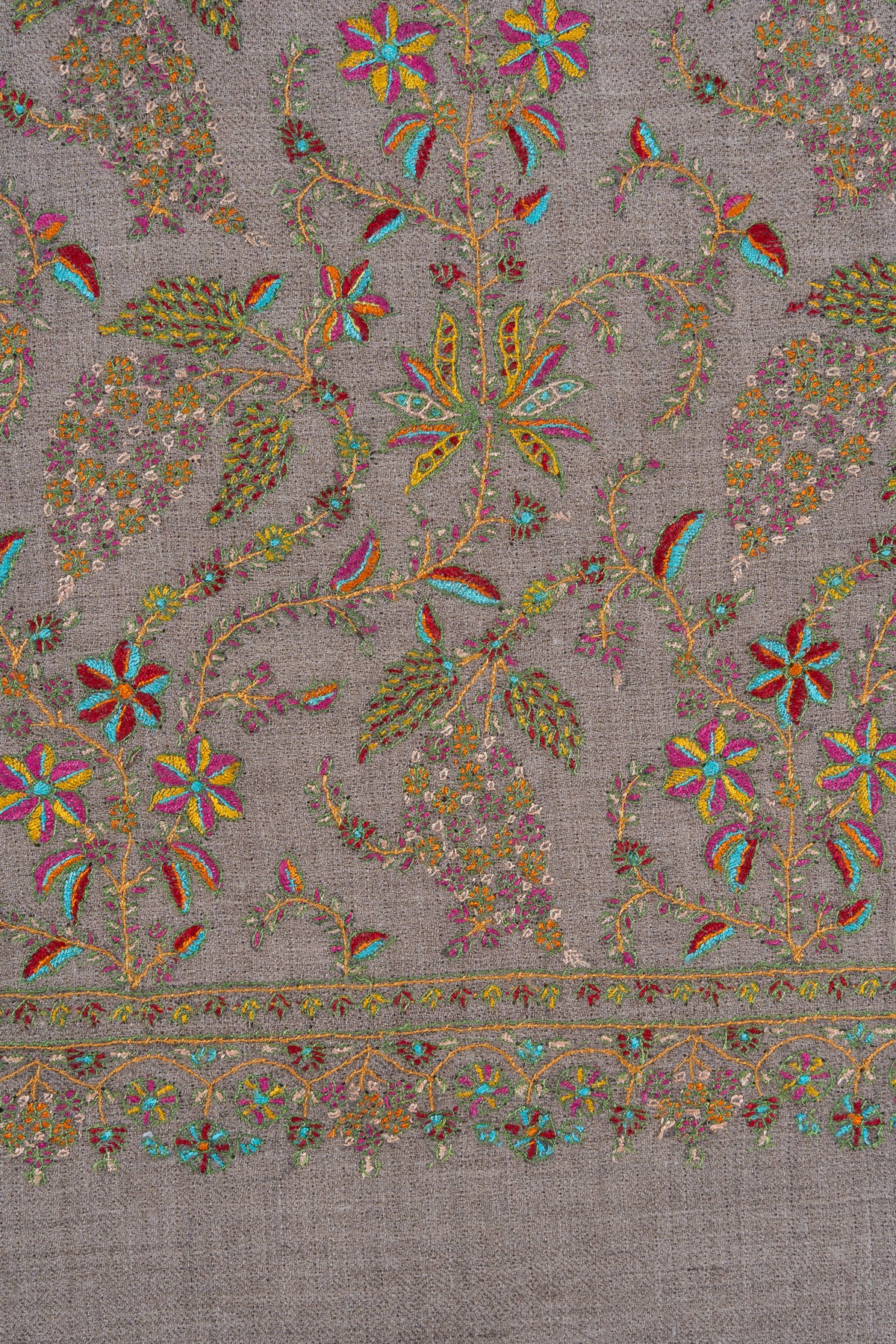 Sozni Hand Embroidered Pashmina: Taupe Multicolour Garden Spread