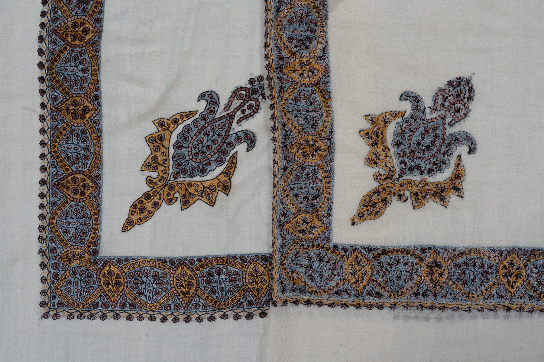 Woven in pure cashmere with a soft ivory base, the shawl features a delicately embroidered border enclosing the piece, with paisley motifs placed thoughtfully at each corner. Shades of muted blue, antique gold, and soft rust are layered by hand, creating a balanced contrast that feels composed, elegant, and quietly distinctive.
