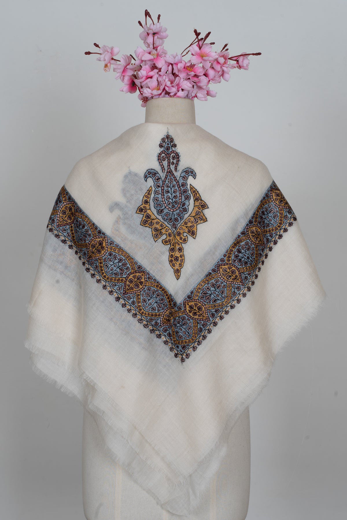 The embroidery follows traditional Kashmiri techniques, giving the motifs depth and definition while preserving the natural lightness of the fabric. Its square form allows for versatile draping—over the shoulders, folded traditionally, or styled with modern restraint.