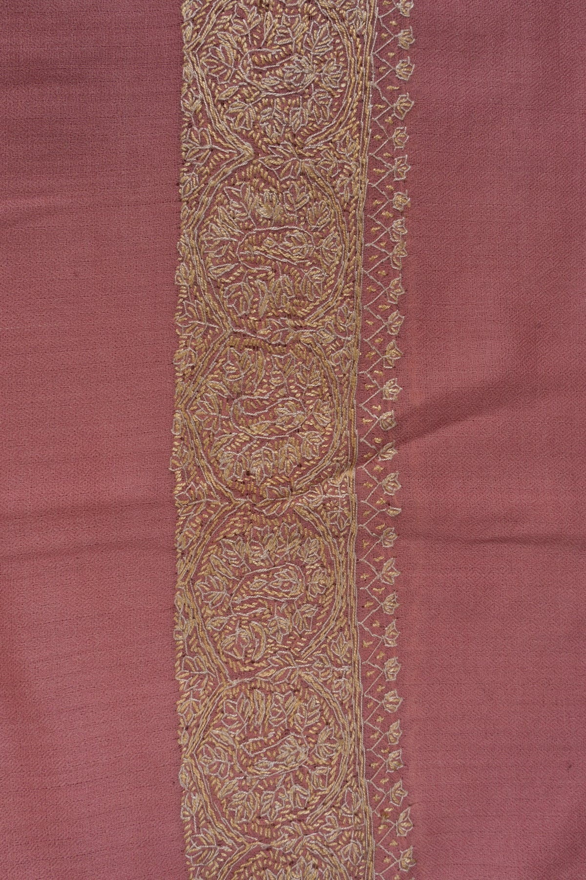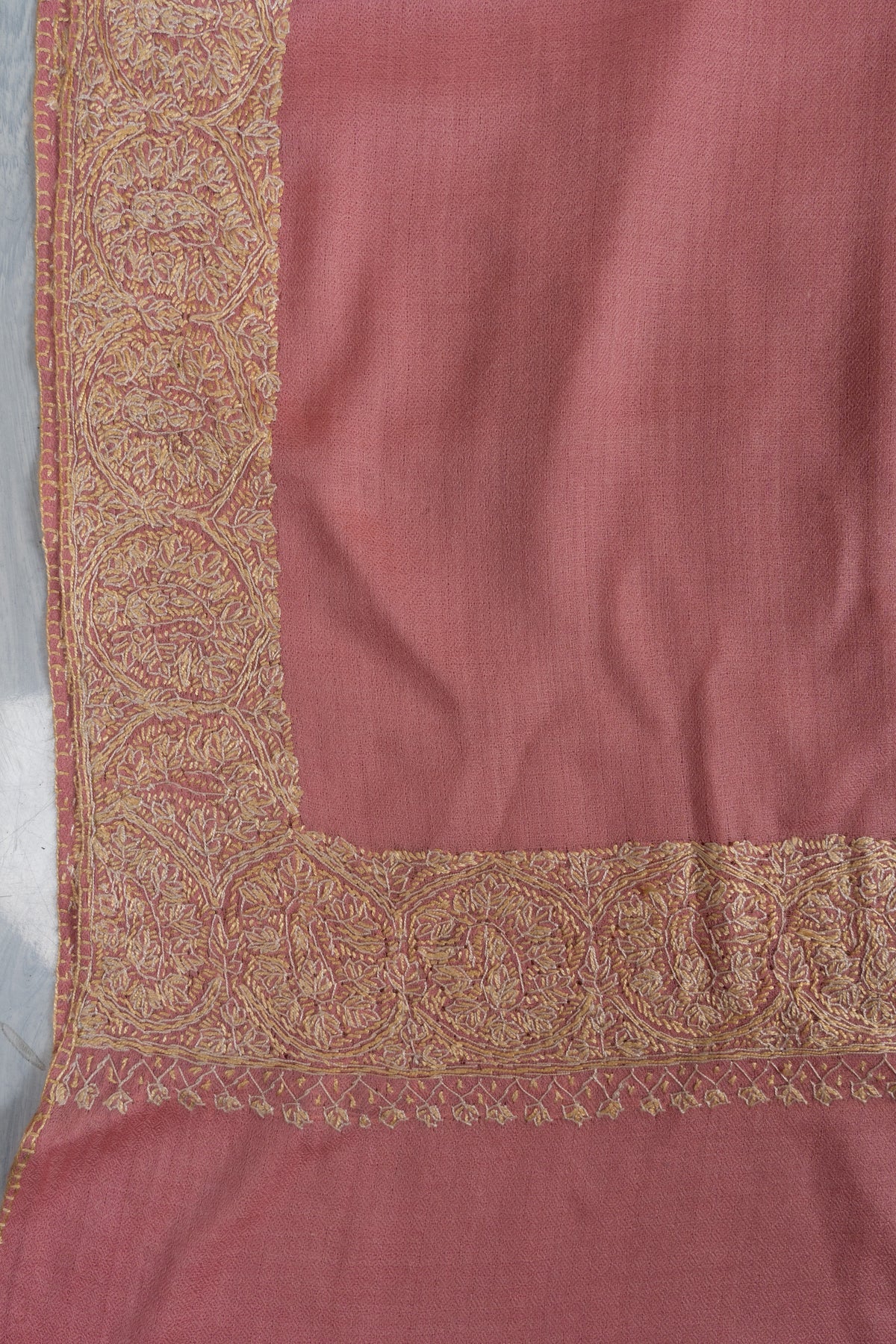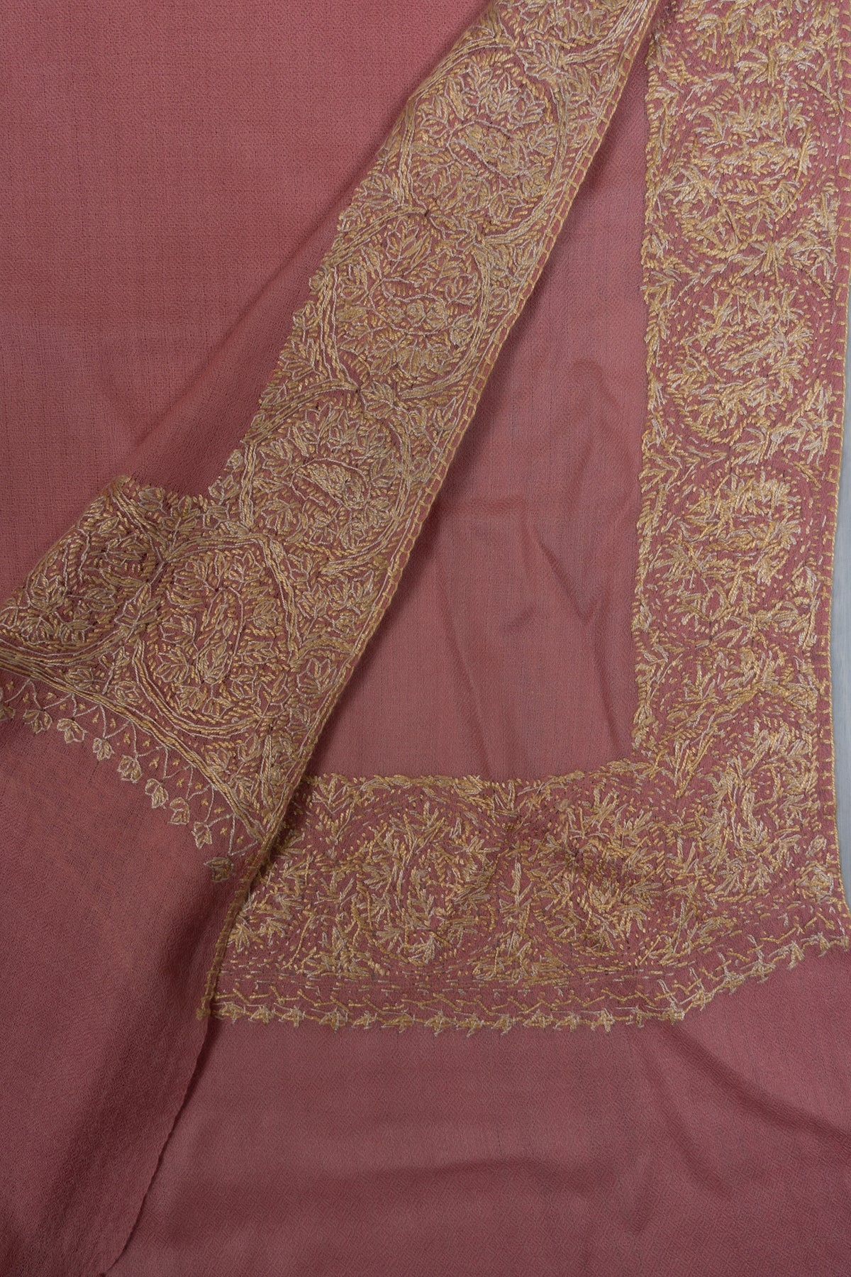 Soft rose tones meet shimmering golden Sozni embroidery in this Merino wool 2.5 Yards Sozni Hand Embroidered Shawl. The luminous border detailing enhances the delicate base color, creating a graceful statement that feels both festive and feminine.