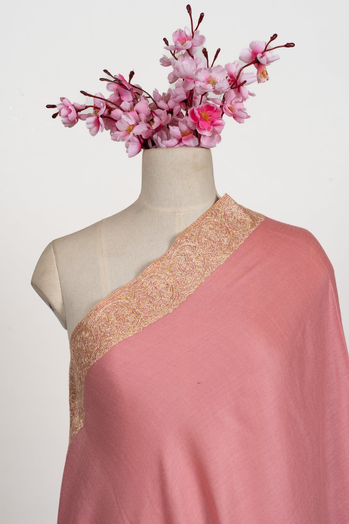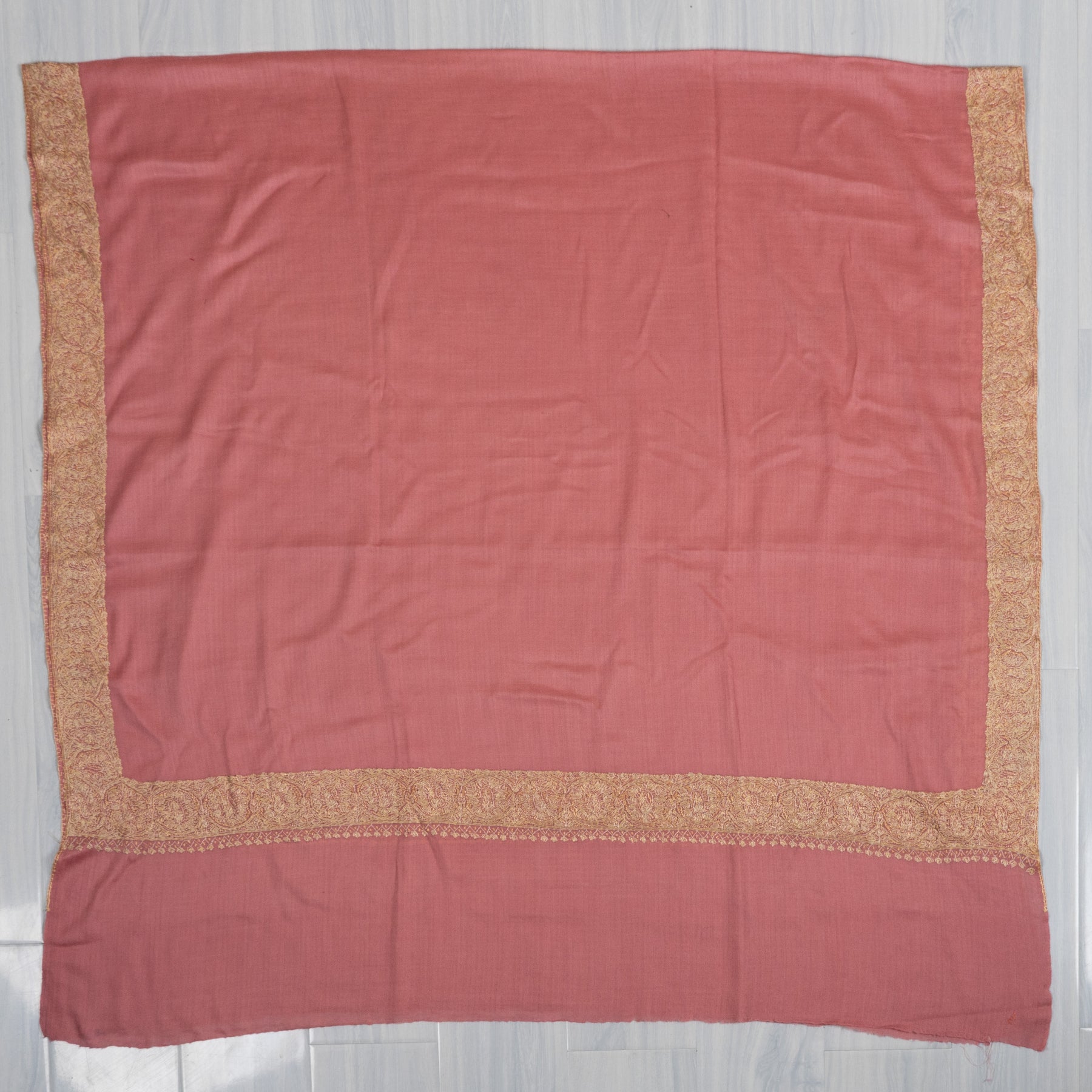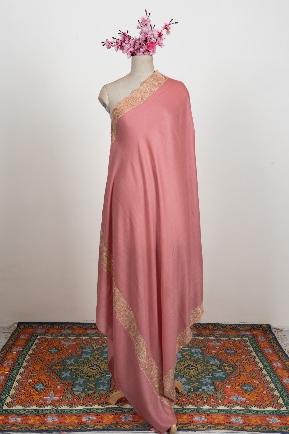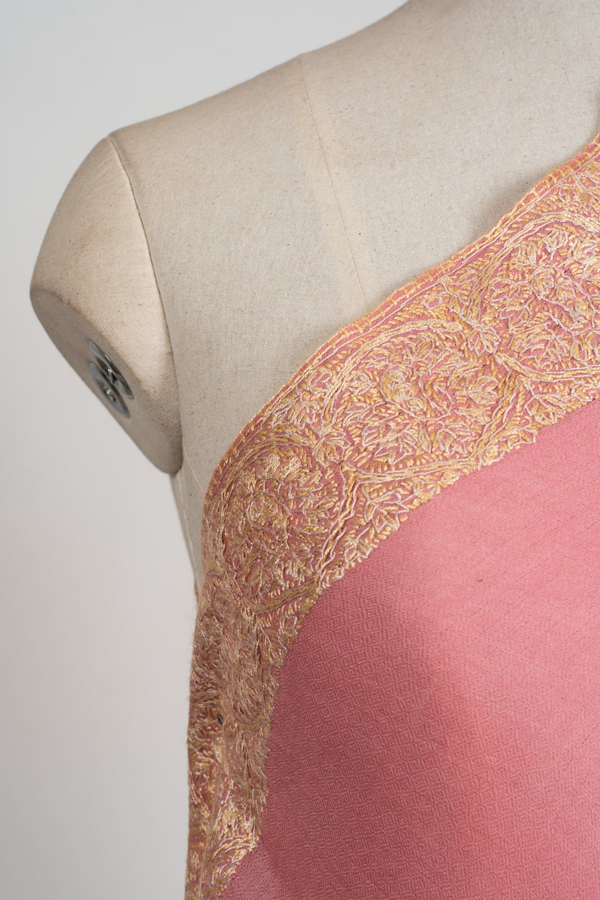 Soft rose tones meet shimmering golden Sozni embroidery in this Merino wool 2.5 Yards Sozni Hand Embroidered Shawl. The luminous border detailing enhances the delicate base color, creating a graceful statement that feels both festive and feminine.