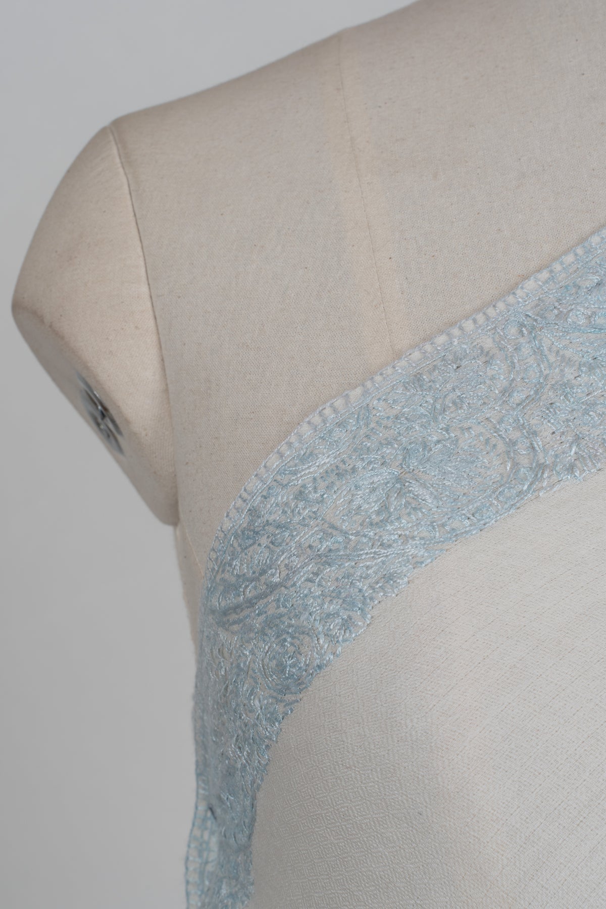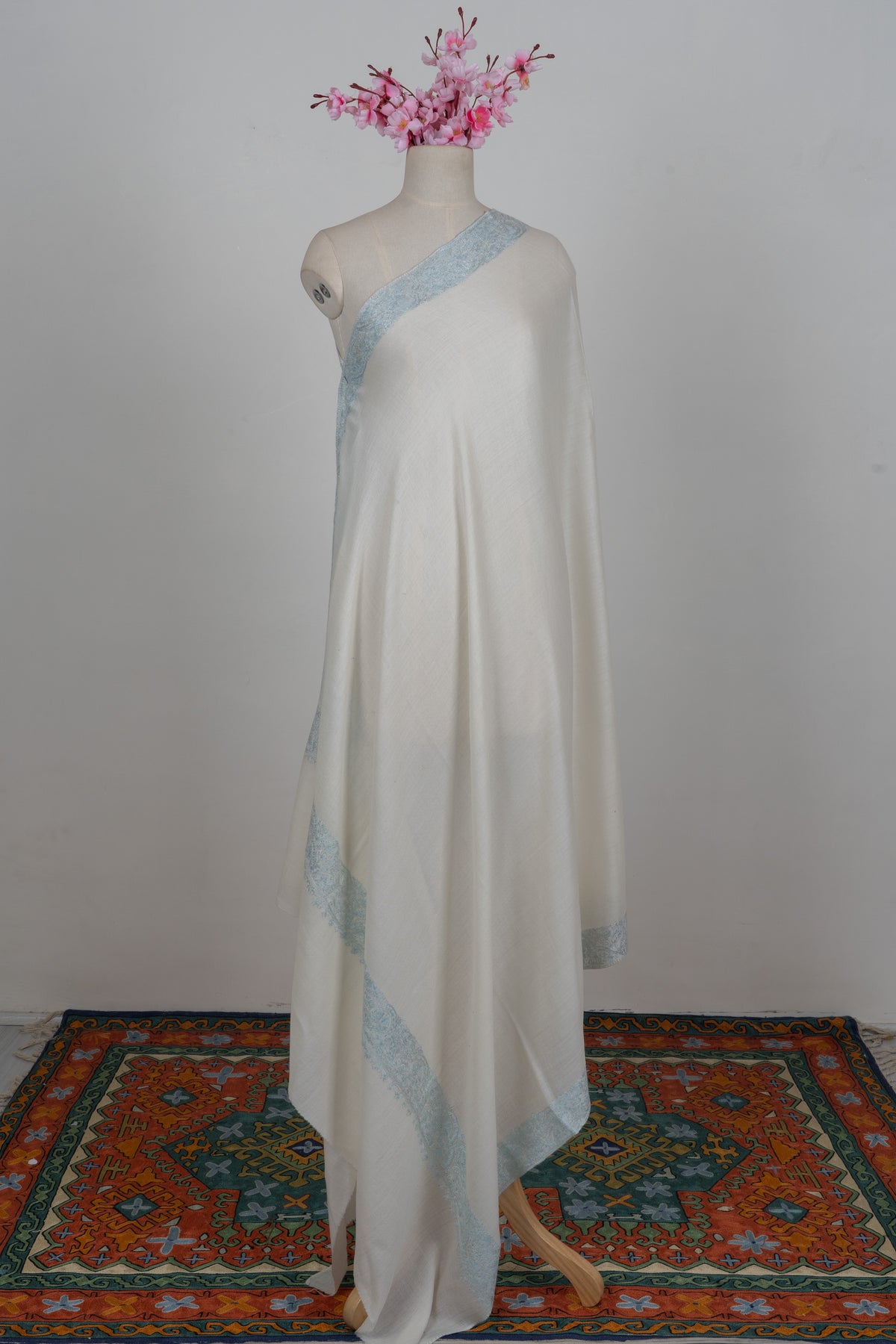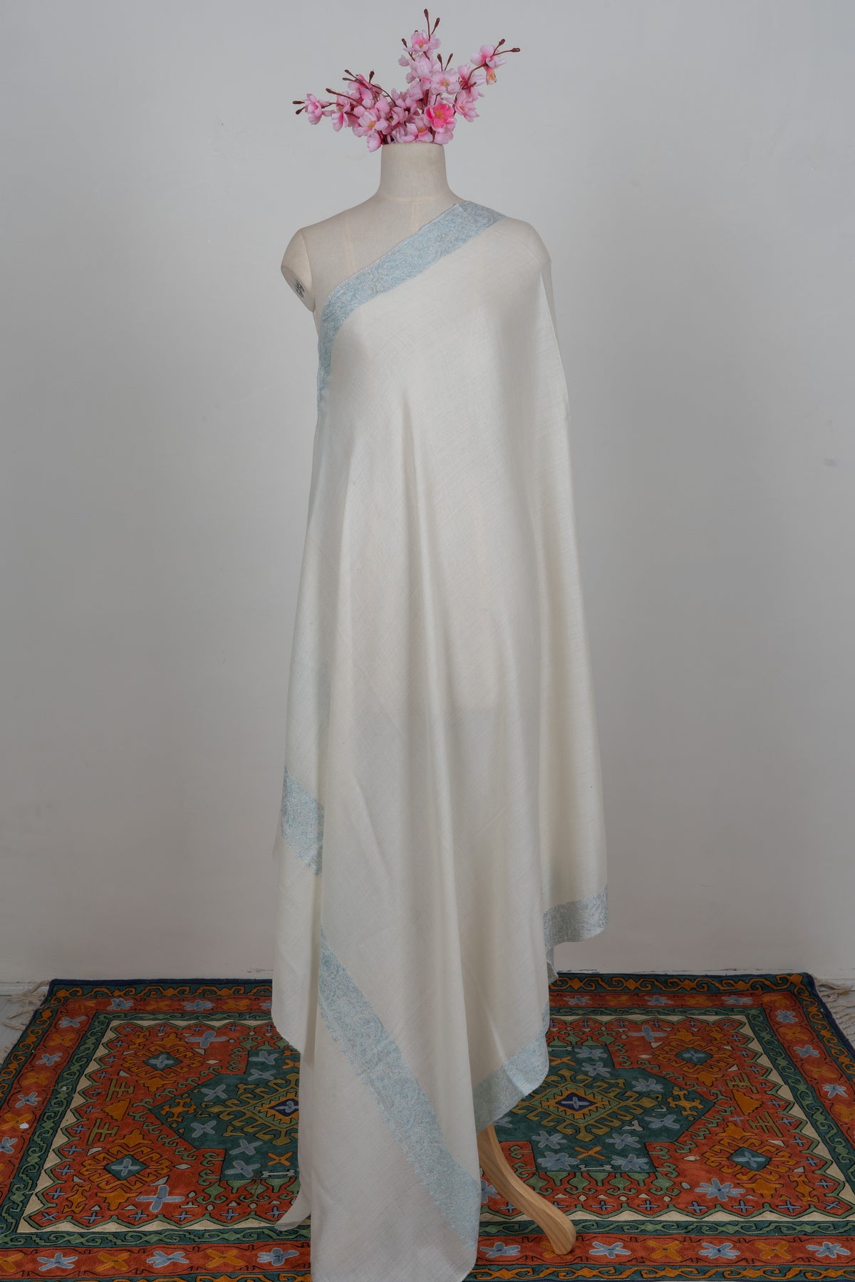Delicate and luminous, this Merino wool 2.5 Yards Sozni Hand Embroidered Shawl comes in a pristine ivory tone accented with subtle powder blue Sozni embroidery along the borders. The soft contrast gives it an airy, graceful presence ideal for refined day and evening wear.