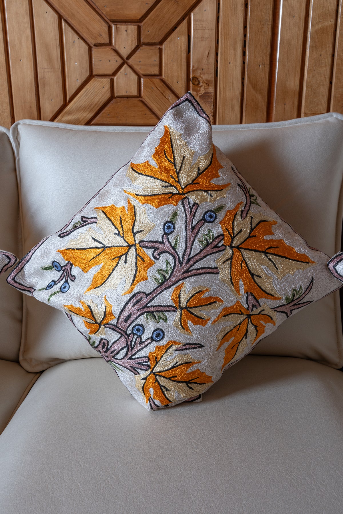 Inspired by nature, this pillow cover hand embroidered on a cotton base features flowing vines and bold maple leaves in warm shades of amber, ivory, and soft pink. Delicate berries and leafy accents add movement and charm, creating a design that feels fresh yet timeless.