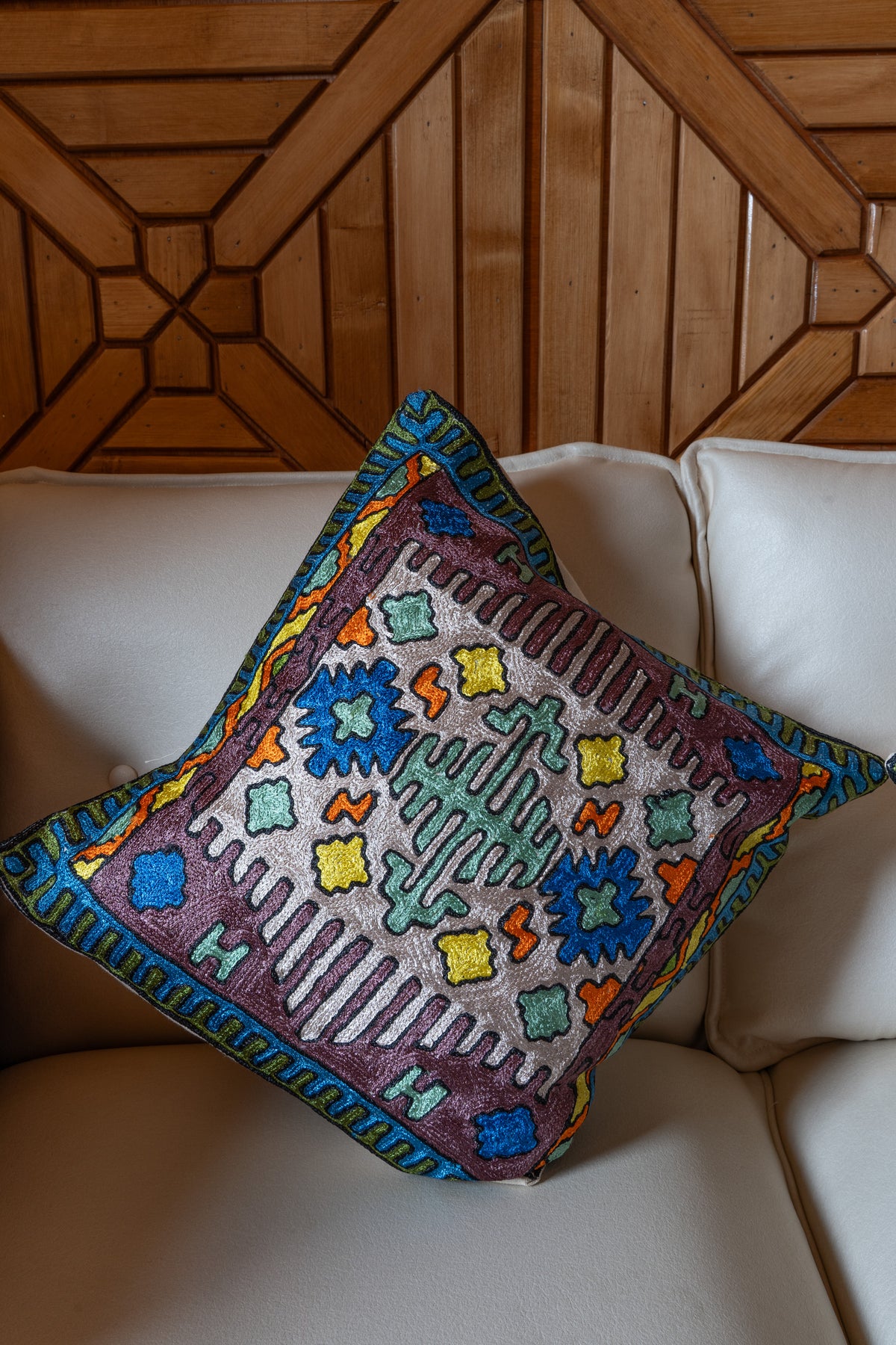 This pillow cover hand embroidered on a soft cotton base features a striking mosaic pattern inspired by traditional geometric art. Deep plum tones frame vibrant blues, greens, and warm golden accents, creating a rich interplay of color that instantly elevates any living space. The intricate central motif draws the eye, while the detailed border adds depth and balance to the overall design.