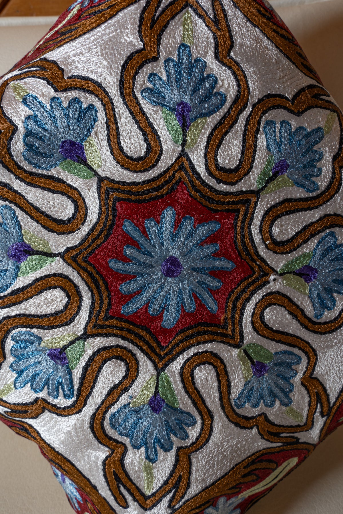 This pillow cover hand embroidered on cotton base features a stunning floral medallion in calming shades of blue, ivory, and deep red. The symmetrical bloom at the center is surrounded by graceful petal motifs and a rich border that frames the design beautifully, giving it a balanced and refined look.