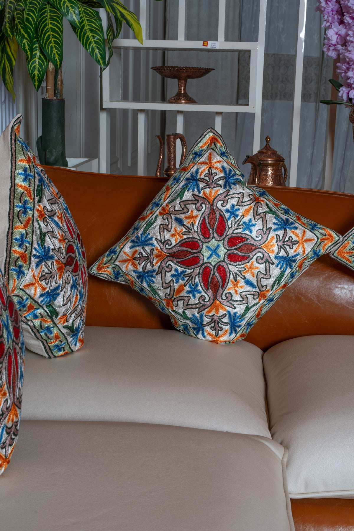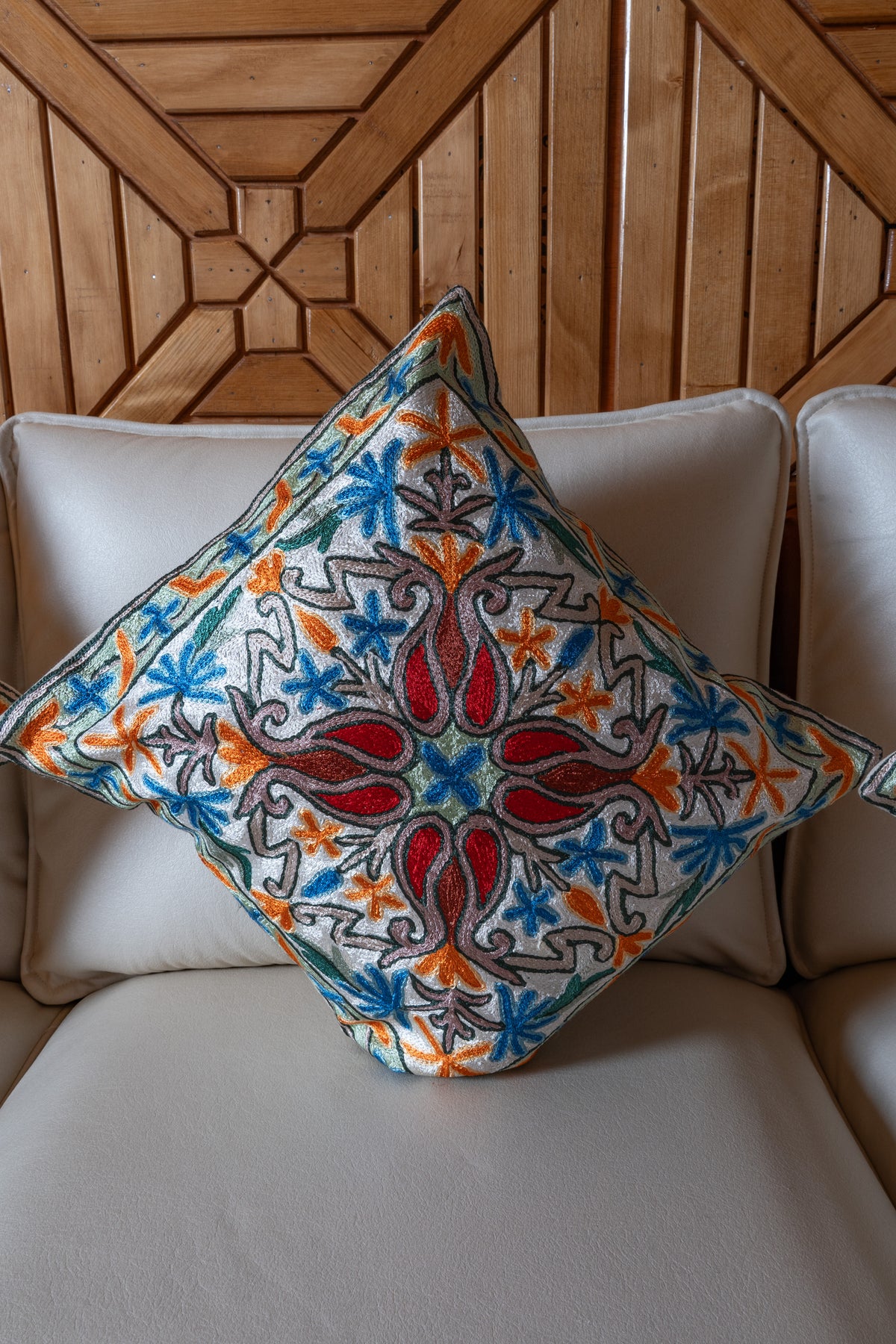 This pillow cover hand embroidered on cotton features a vibrant medallion design highlighted by bold red accents, bright orange details, and cool blue floral motifs. The intricate scrollwork and star like elements give it a lively and artistic presence.