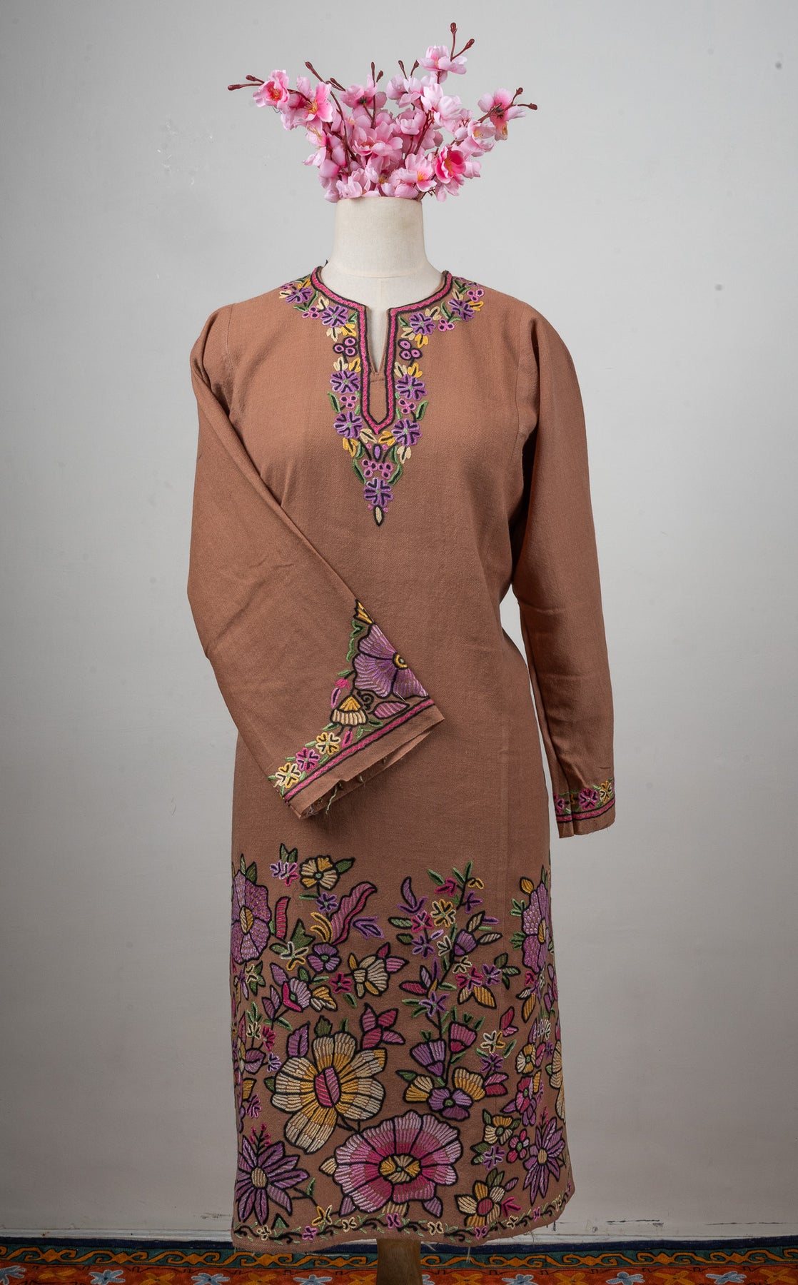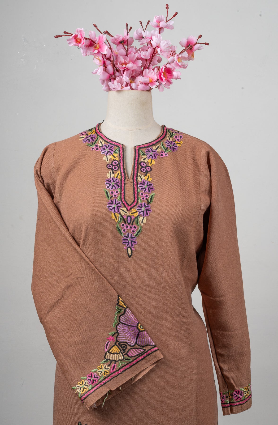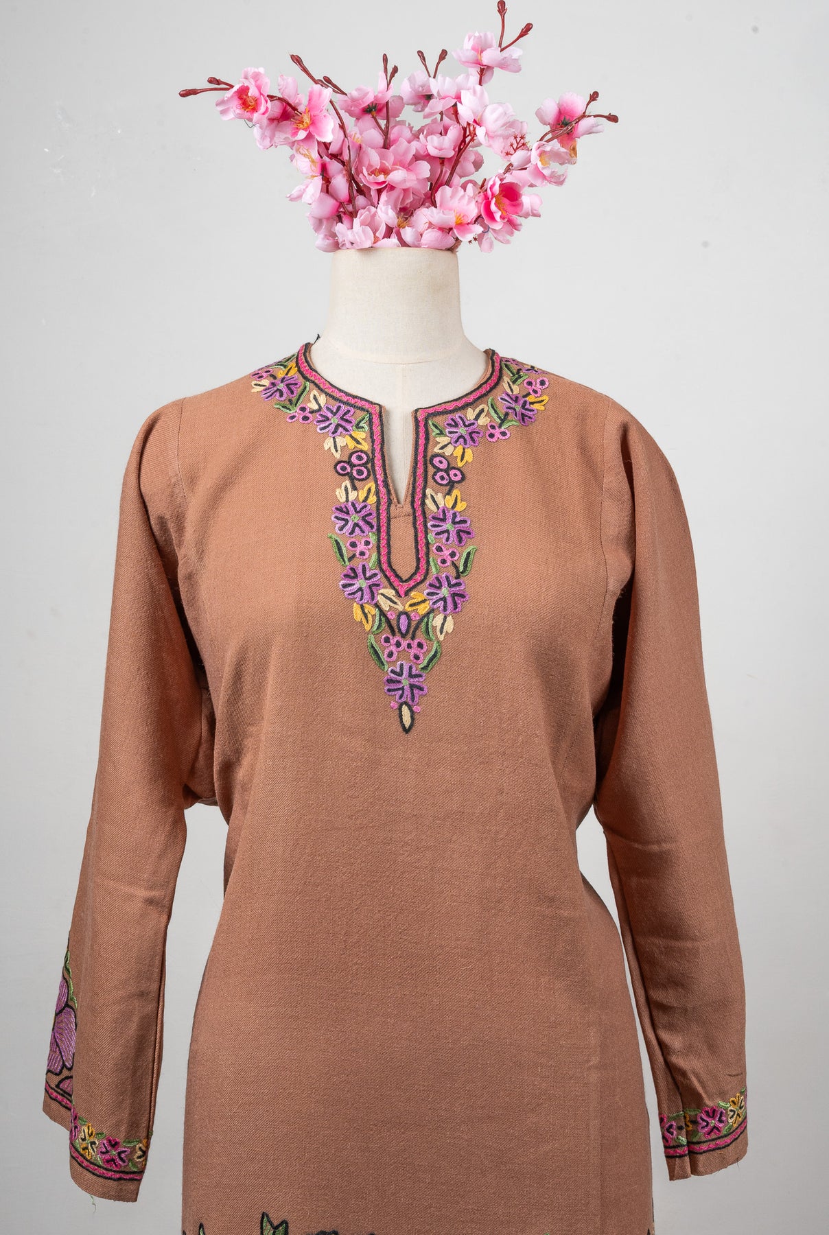 Draped in soft blush tones, this fine merino wool Pheran features stunning Sozni hand embroidery in shades of lavender, mustard, and rose pink. The bold floral motifs along the hem and cuffs bloom with grace, while the neckline embroidery adds refined detail.