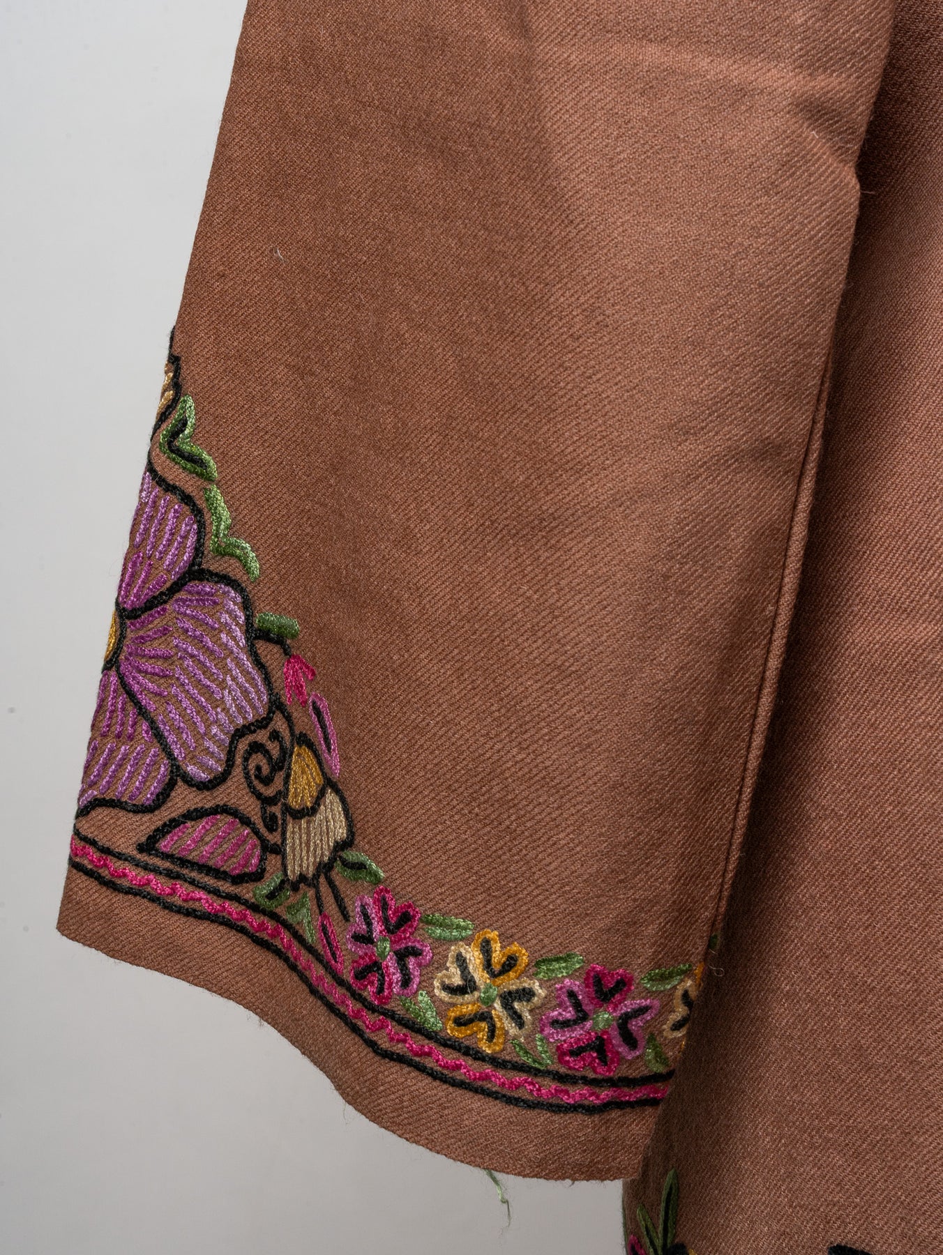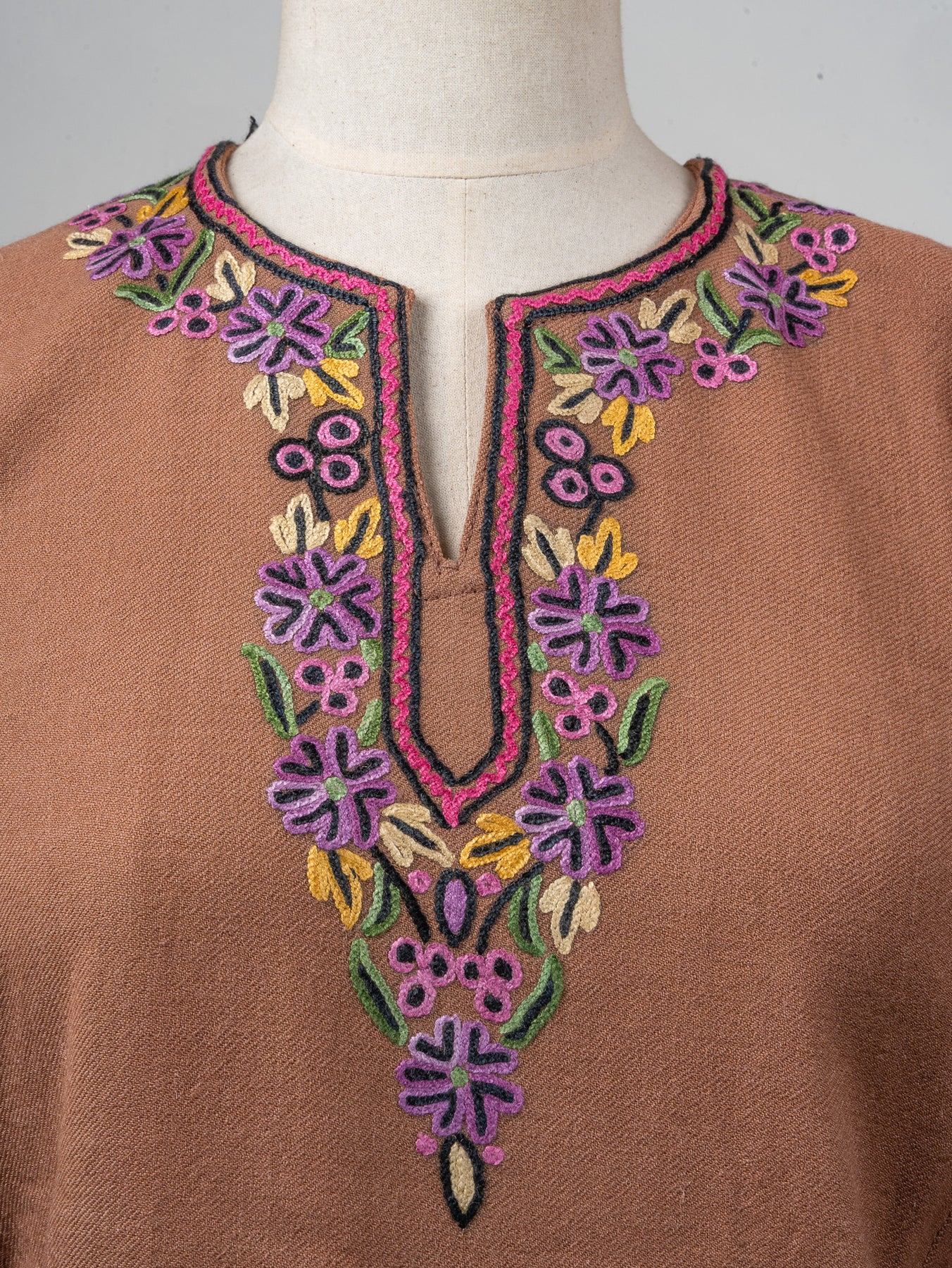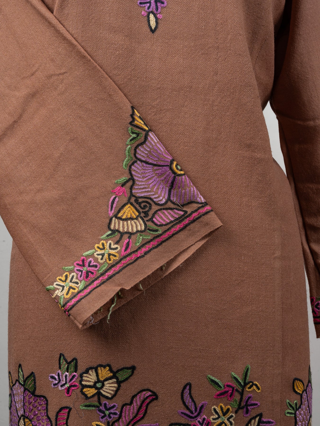 Draped in soft blush tones, this fine merino wool Pheran features stunning Sozni hand embroidery in shades of lavender, mustard, and rose pink. The bold floral motifs along the hem and cuffs bloom with grace, while the neckline embroidery adds refined detail.