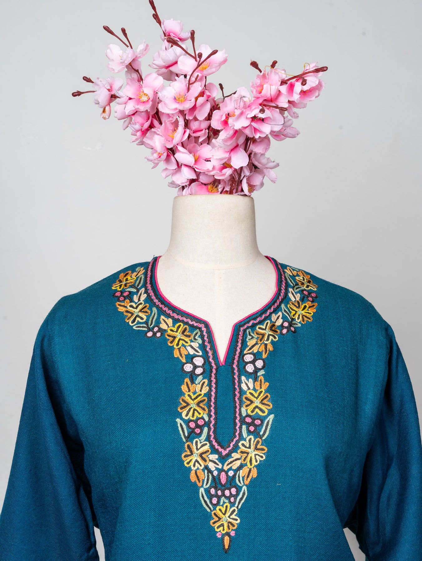 Step into the world of timeless elegance with this deep teal fine merino wool Pheran, adorned with vivid Sozni hand embroidery. The neckline, cuffs, and lower panels come alive with intricate floral motifs in warm and vibrant tones of yellow, magenta, and orange, making it a statement piece for festive or casual winter wear.