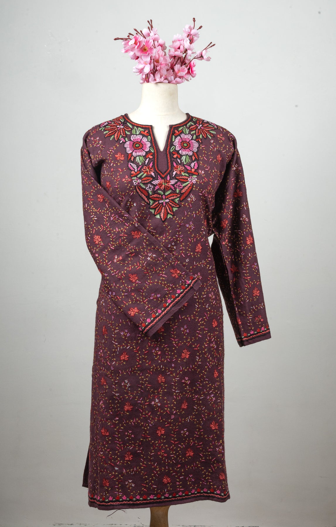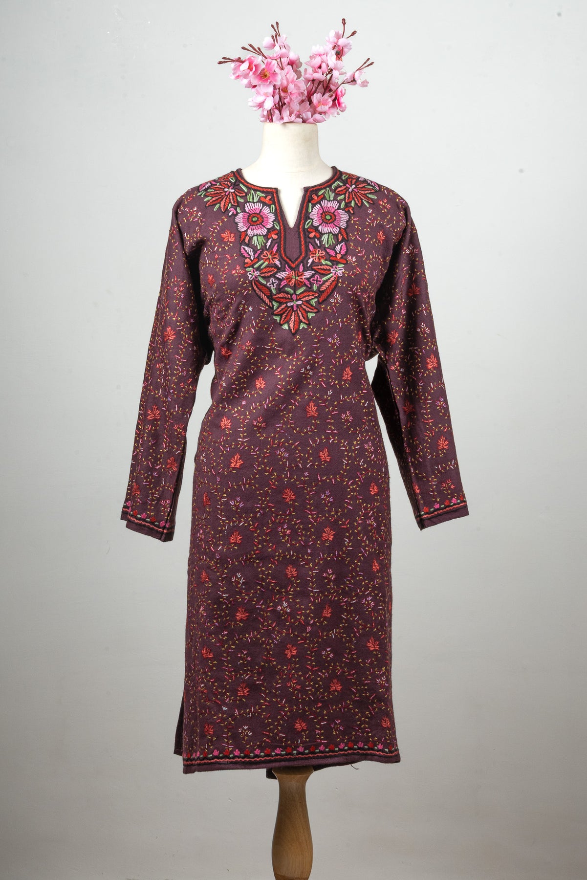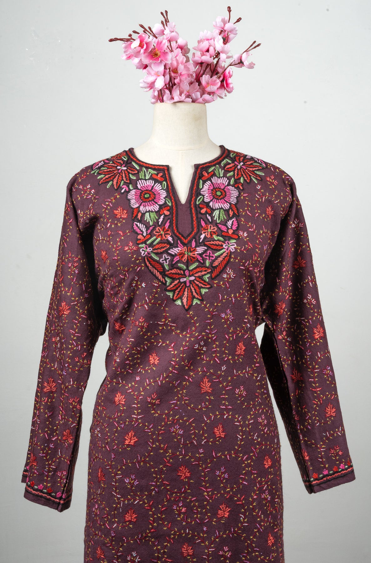 Infused with deep aubergine tones, this fine merino wool Pheran stands out with scattered floral patterns and a beautifully hand embroidered Sozni neckline. Shades of pink, green, and crimson are intricately woven to create a floral medallion effect that draws the eye to the chest.