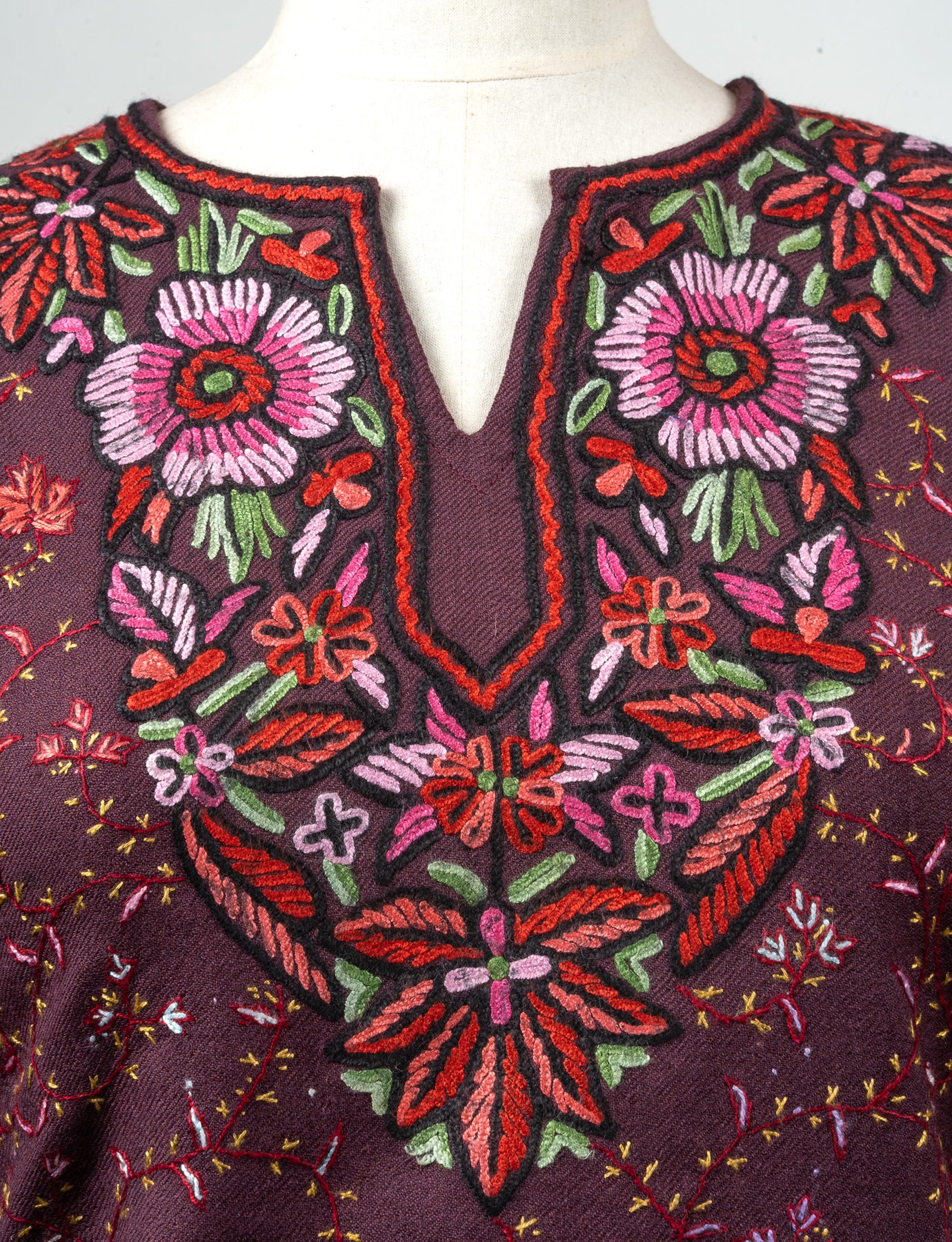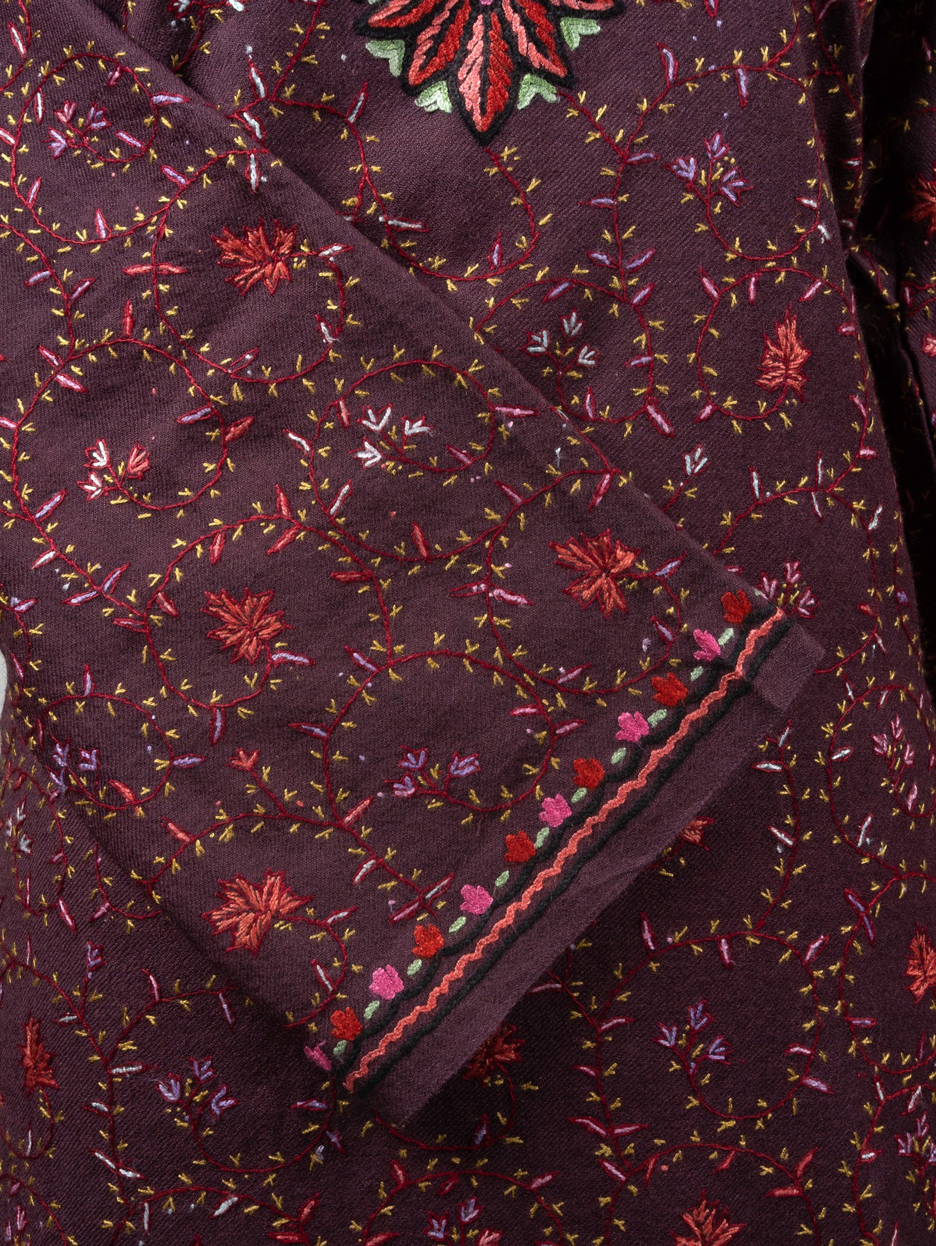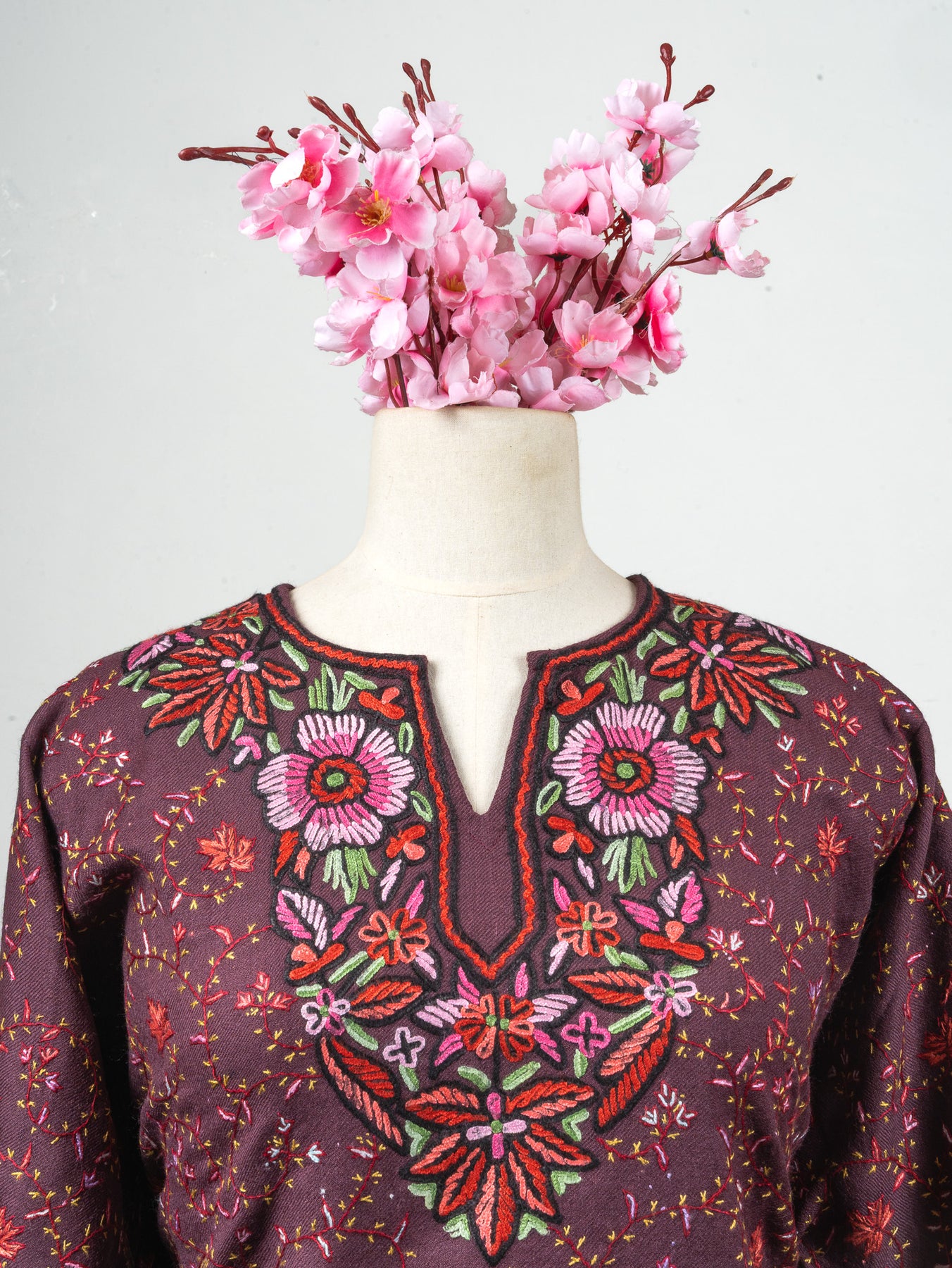 Infused with deep aubergine tones, this fine merino wool Pheran stands out with scattered floral patterns and a beautifully hand embroidered Sozni neckline. Shades of pink, green, and crimson are intricately woven to create a floral medallion effect that draws the eye to the chest.