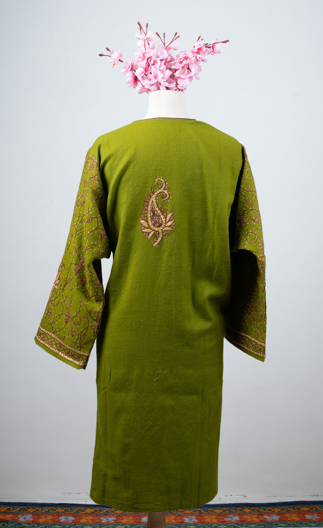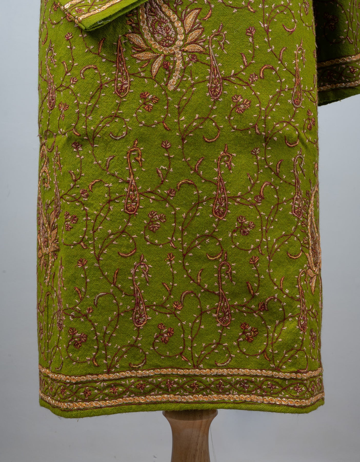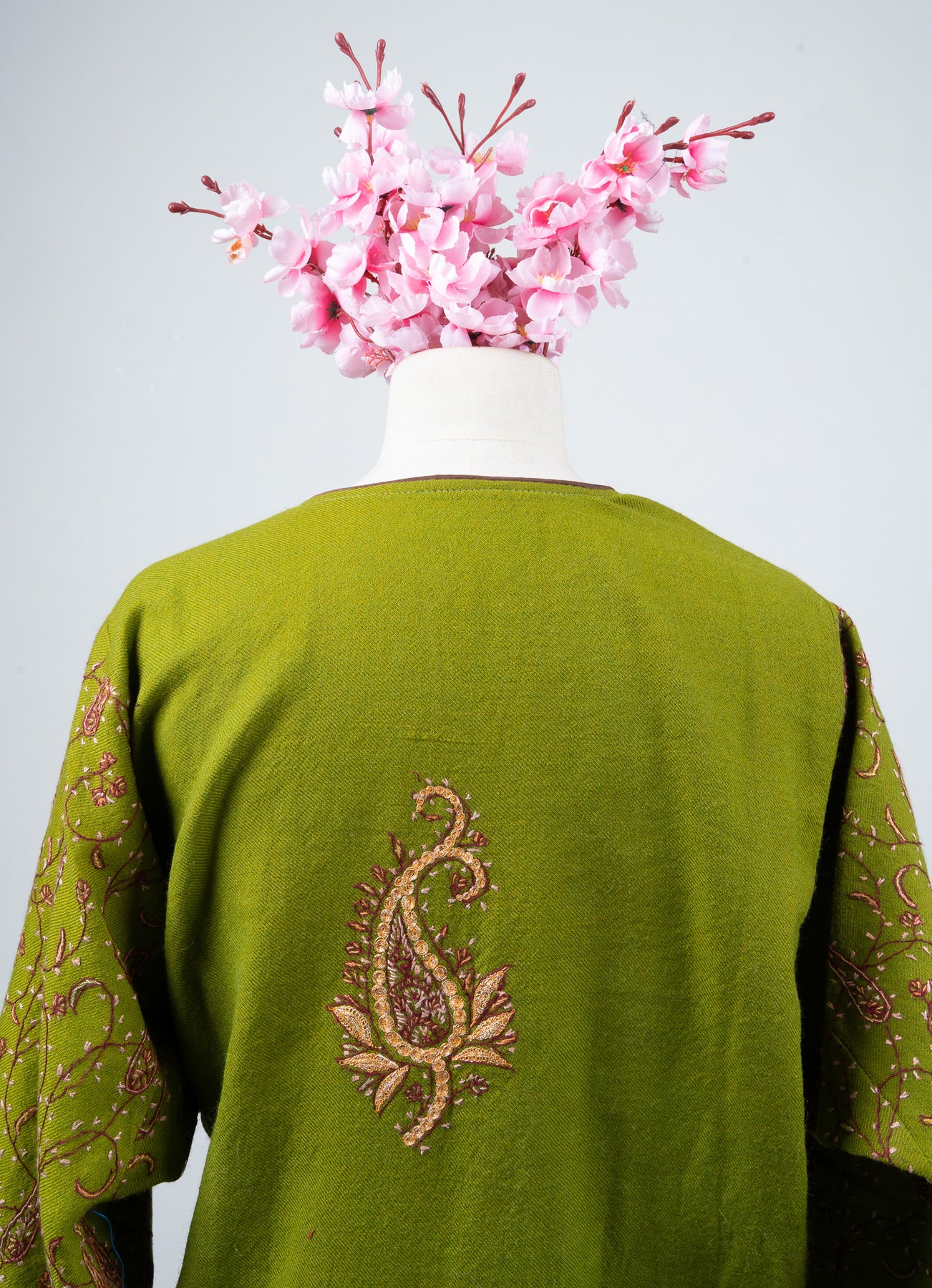 Celebrate nature in full bloom with this vibrant olive green fine merino wool Pheran, exquisitely detailed with all-over Sozni hand embroidery. Delicate vines and paisleys flow across the fabric in earthy coppery tones, creating a beautifully balanced and luxurious aesthetic.