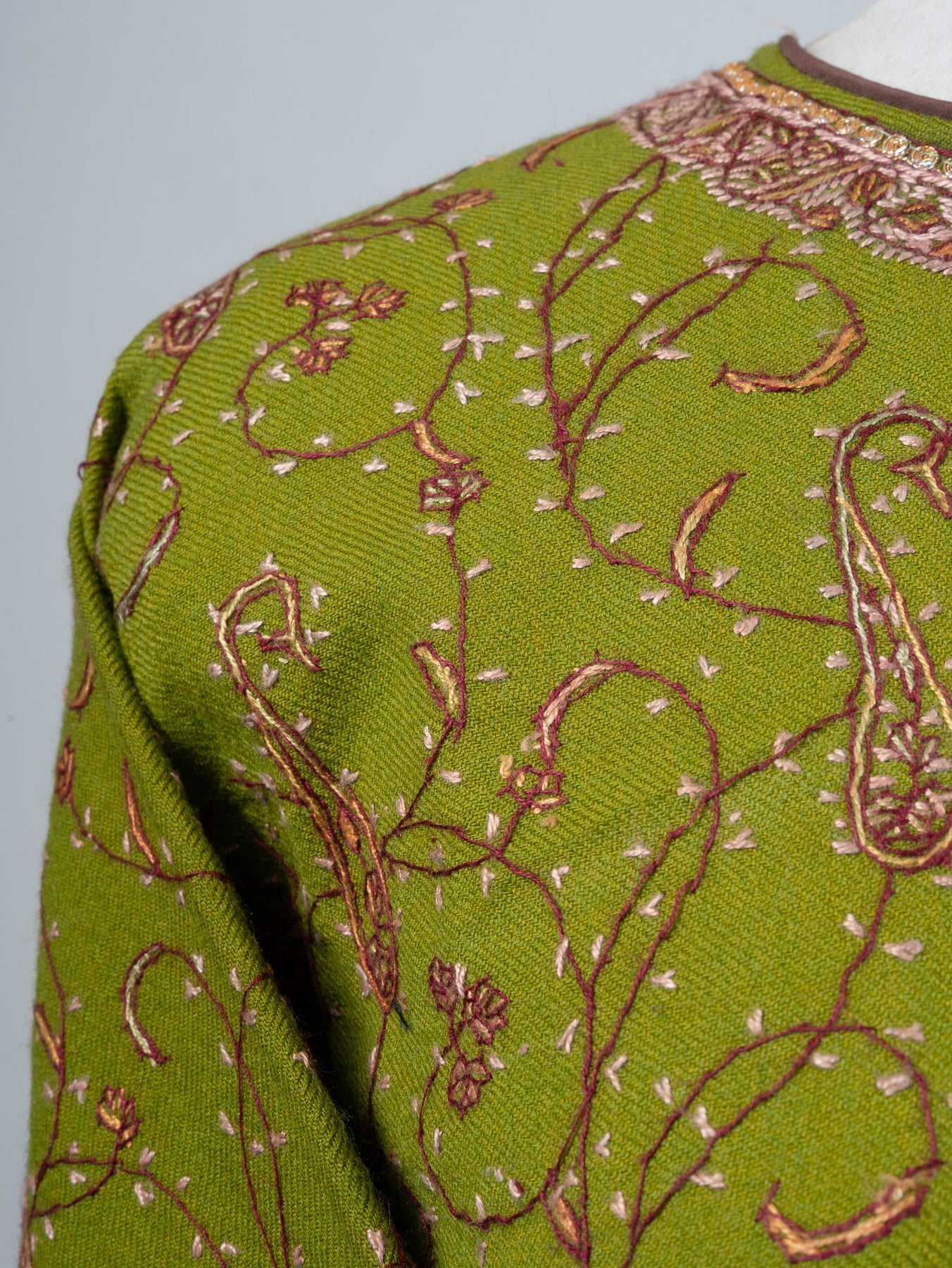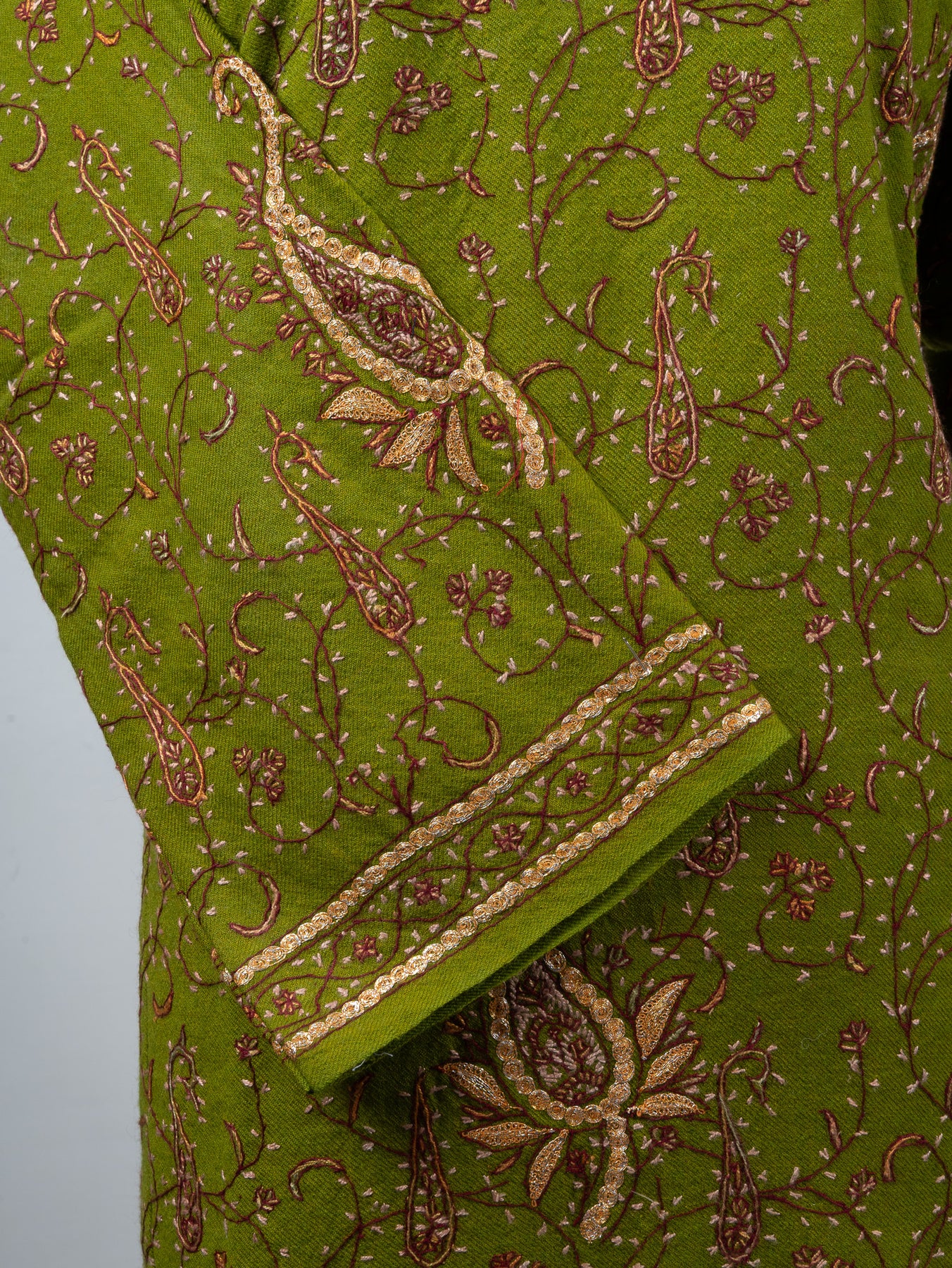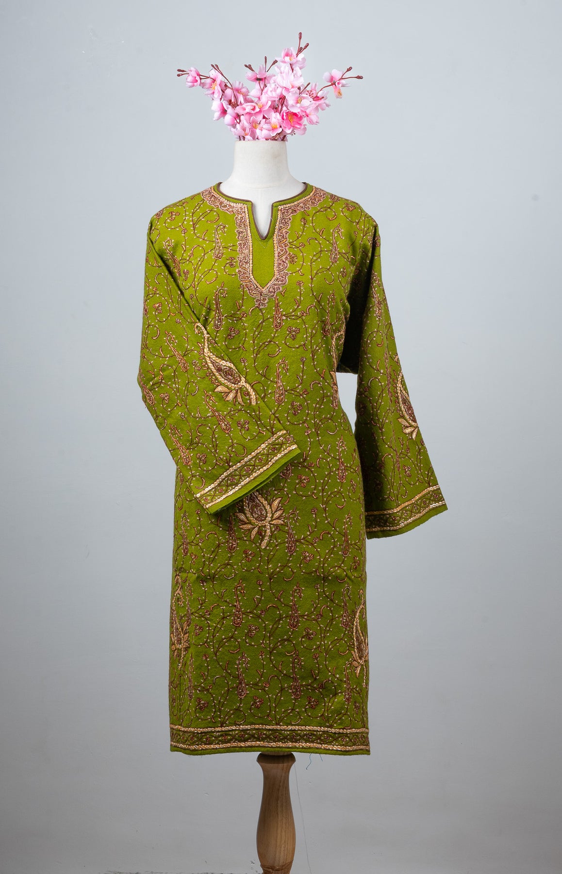Celebrate nature in full bloom with this vibrant olive green fine merino wool Pheran, exquisitely detailed with all-over Sozni hand embroidery. Delicate vines and paisleys flow across the fabric in earthy coppery tones, creating a beautifully balanced and luxurious aesthetic.