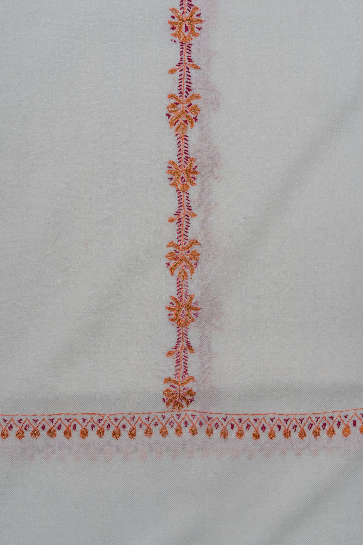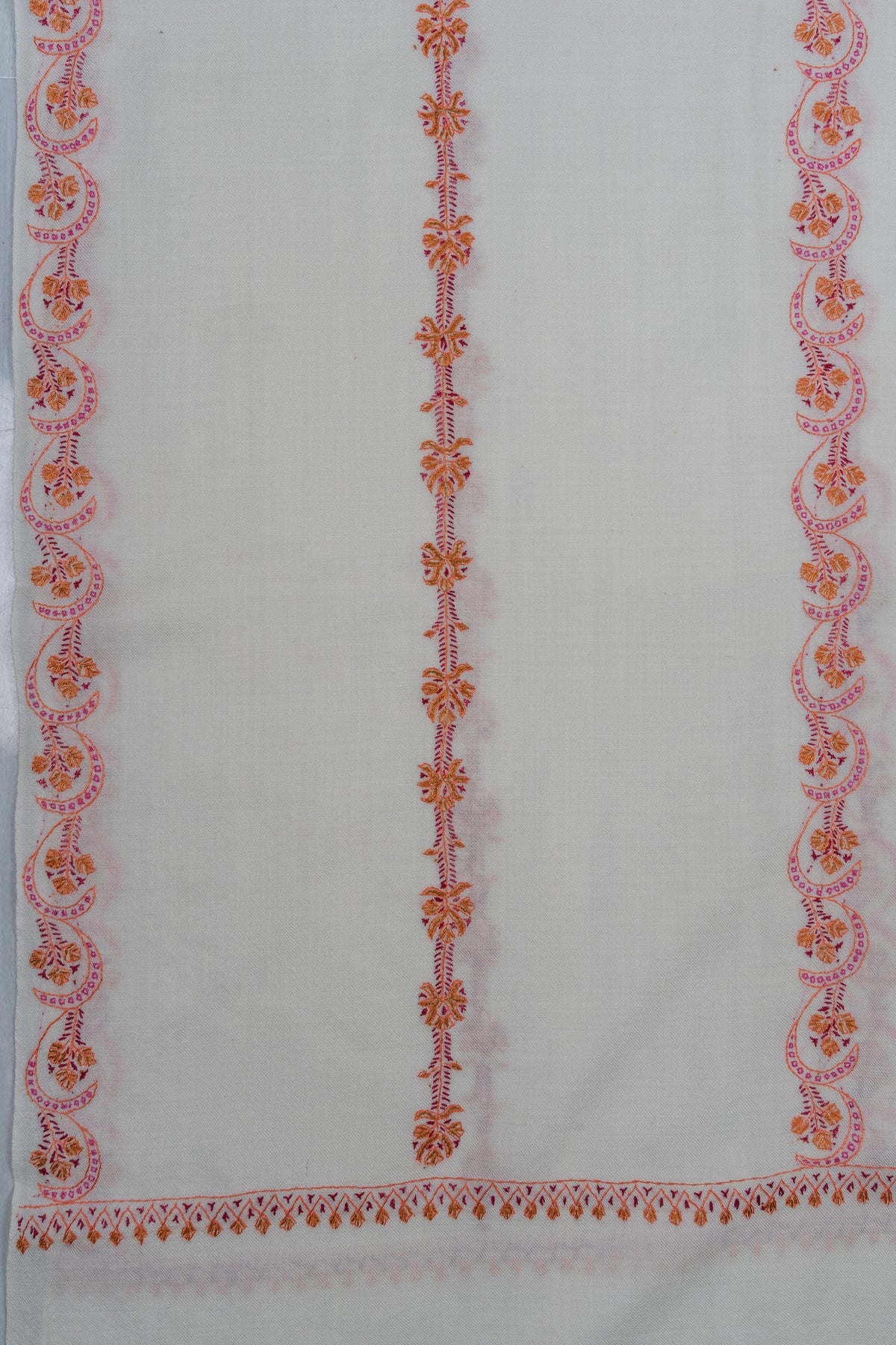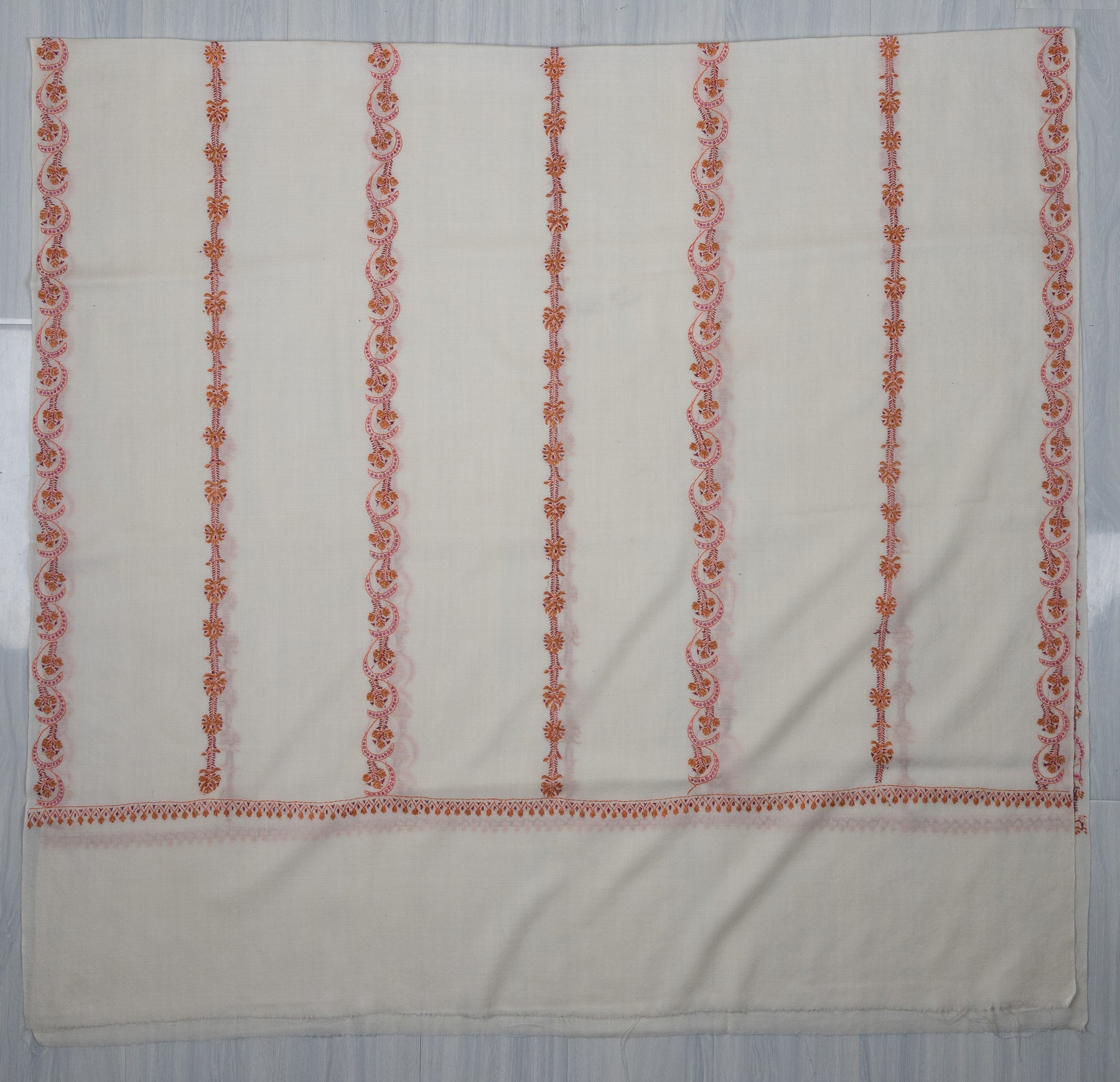 Radiant in its soft ivory base, this shawl features warm coral-toned Sozni hand embroidery flowing in gentle diagonal lines. The floral and circular motifs bring an inviting charm, adding a touch of brightness without overpowering the simplicity of the fabric.