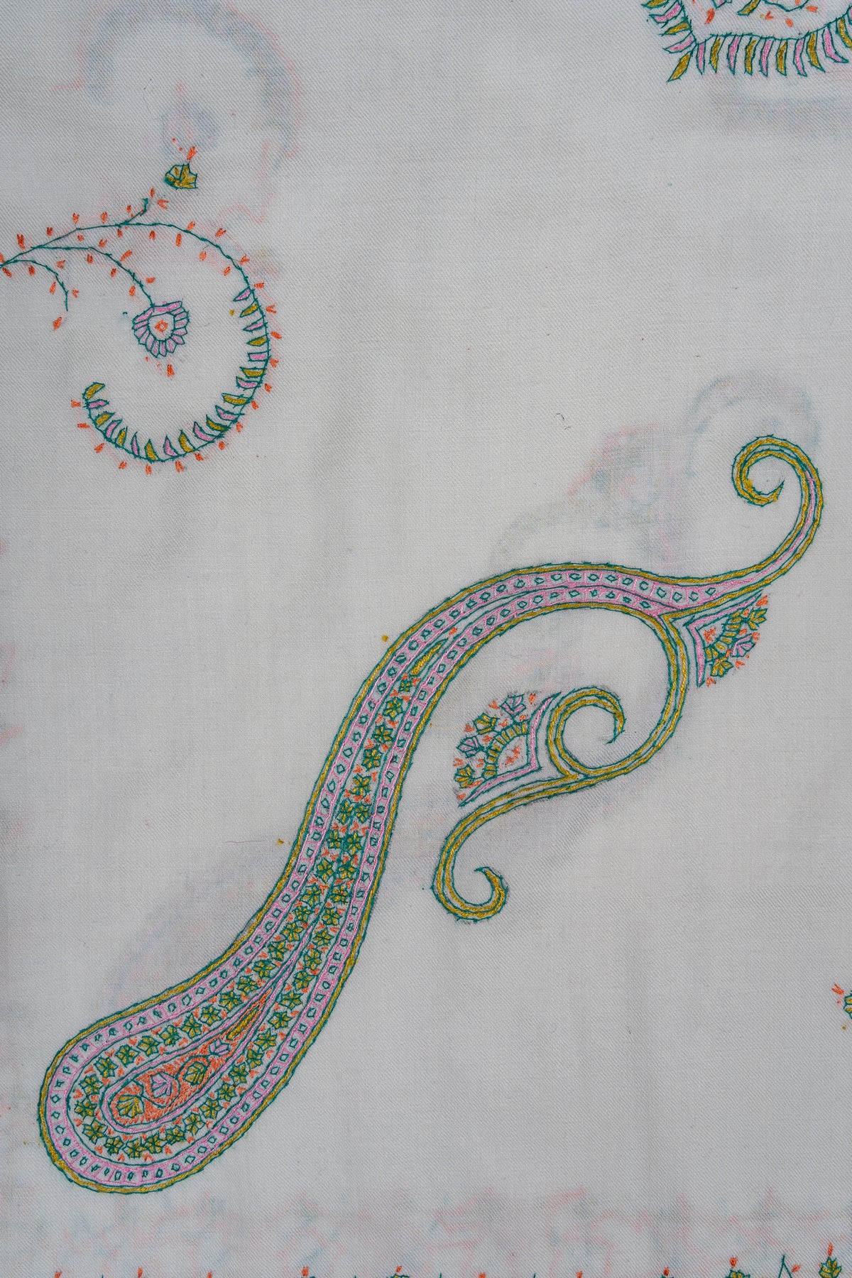 This elegant ivory shawl features beautifully arranged Sozni hand embroidery in soft green, peach, and subtle blue tones. Delicate trellis borders and paisley motifs flow across the fabric, giving it a serene, garden-inspired charm that feels both graceful and timeless.
