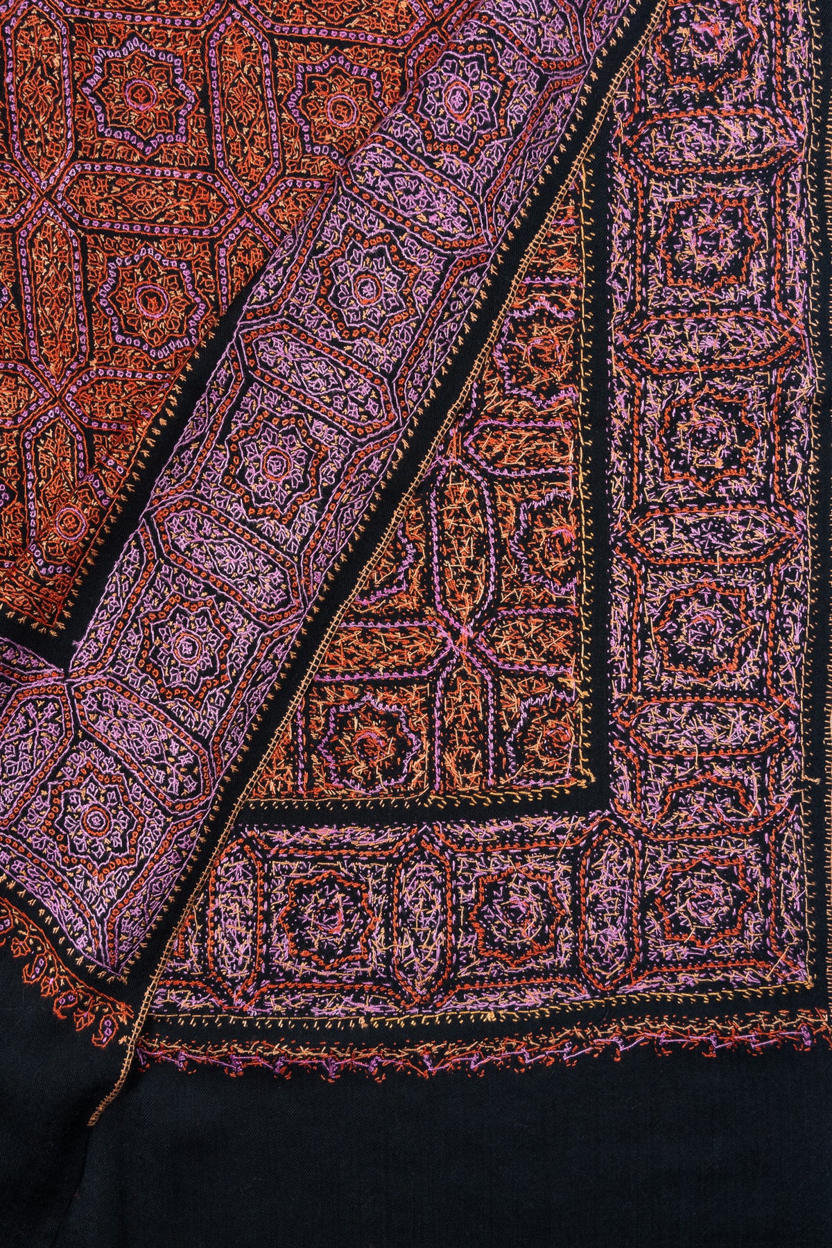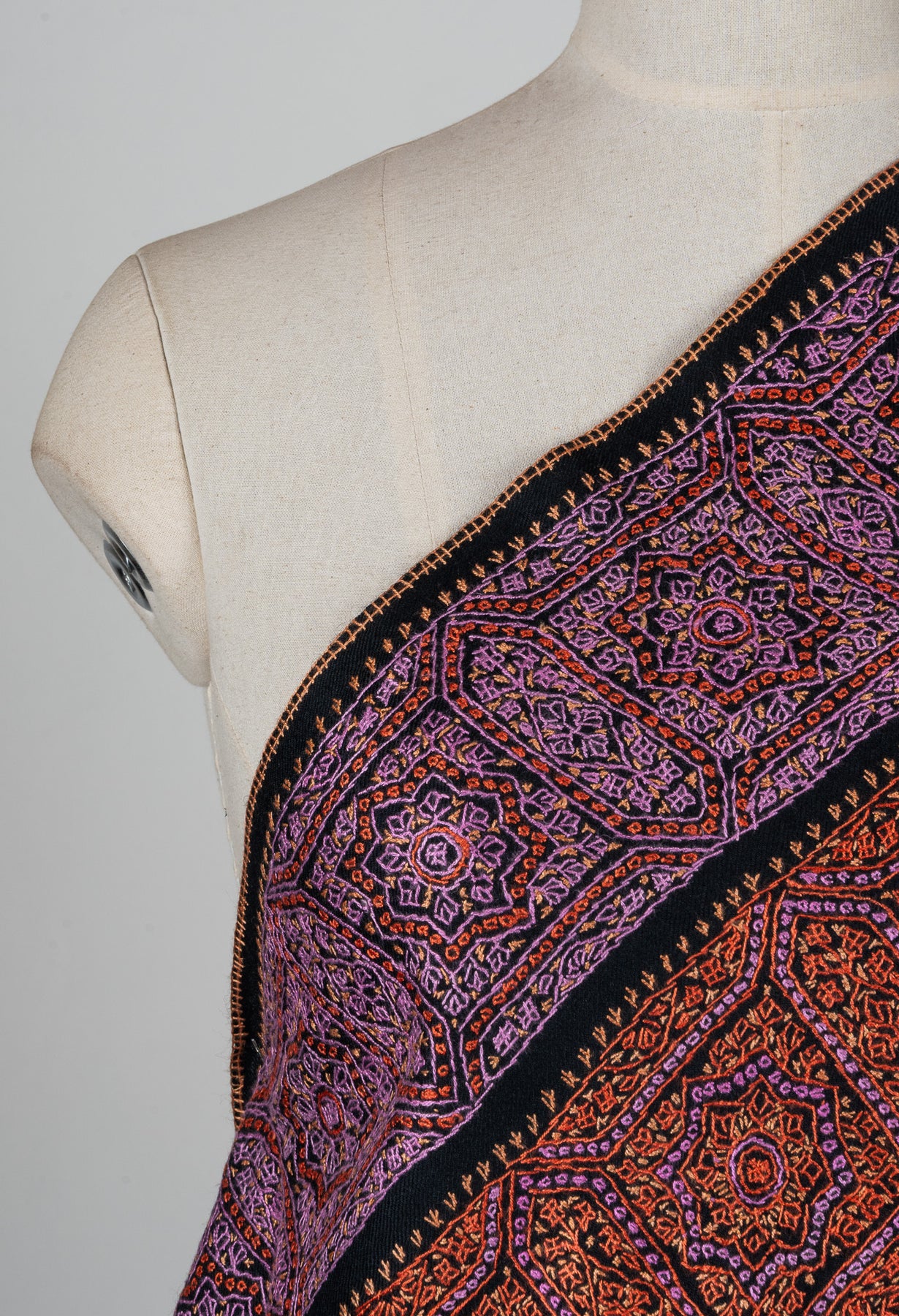 An arresting combination of deep black and jewel-toned embroidery defines this statement shawl. The Sozni hand-embroidered mosaic features intricate geometric florals in shades of amber, lilac, rose, and rust, forming a captivating tapestry framed by detailed borders.