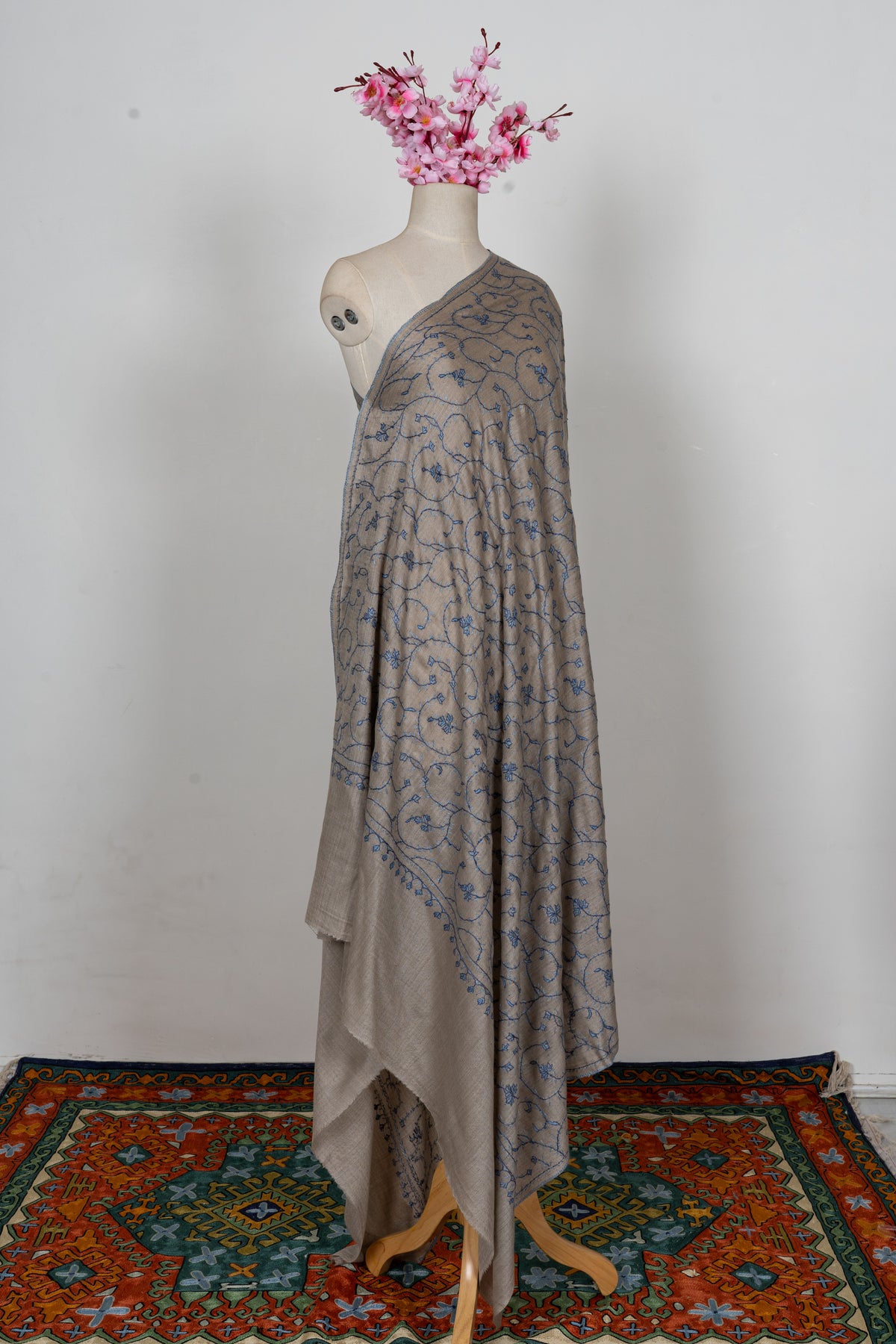 Set against a soft mist grey backdrop, this shawl is beautifully enhanced with flowing hand embroidered floral vines in calming blue tones. The continuous pattern creates a sense of movement, giving the piece an ethereal and graceful appeal.