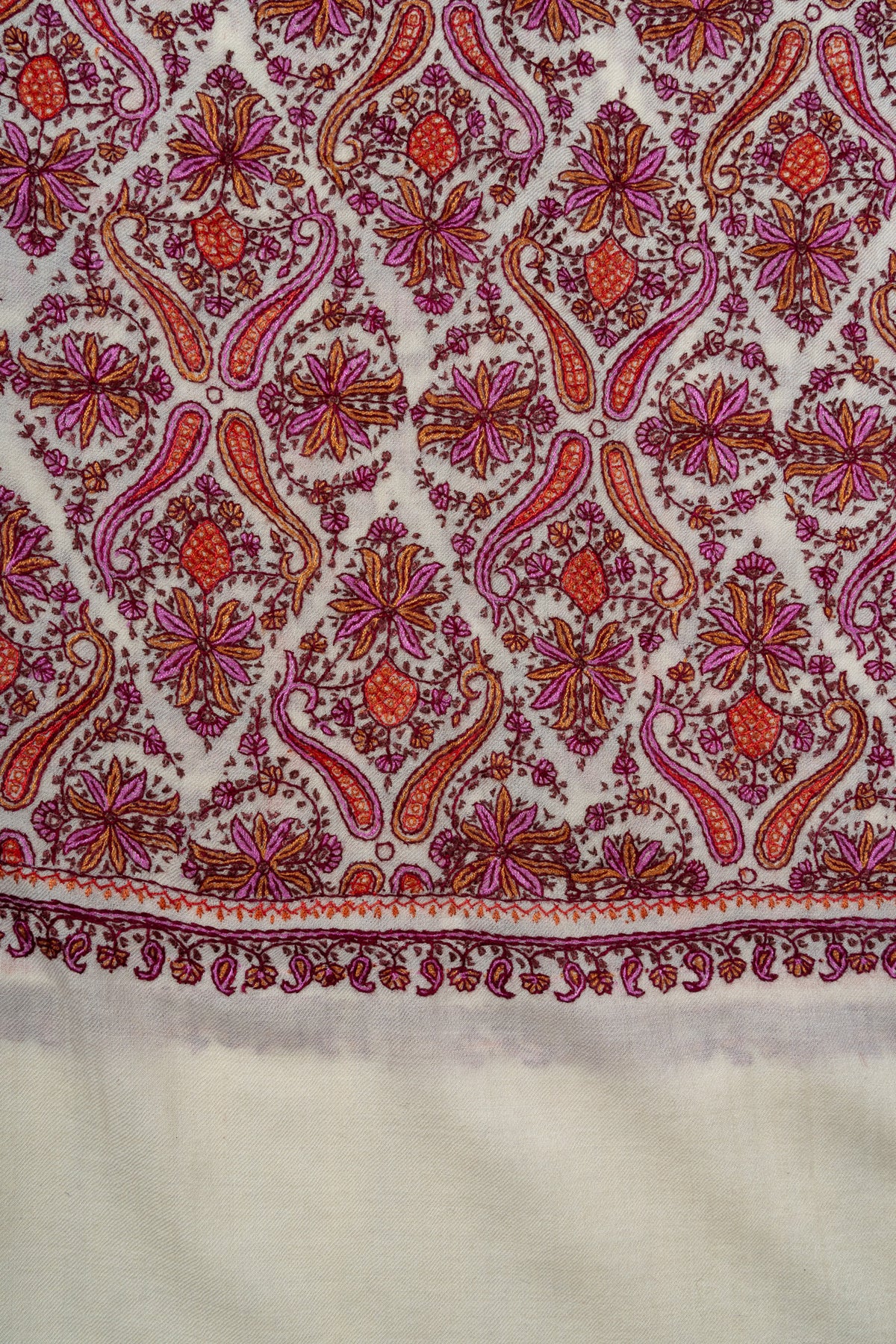 This cream-toned scarf features an enchanting mosaic of Sozni hand embroidery in shades of raspberry, tangerine, olive, and soft plum. The repeating floral and paisley motifs create a beautiful patchwork-like effect, bringing vibrance and tradition together in an effortlessly elegant composition.