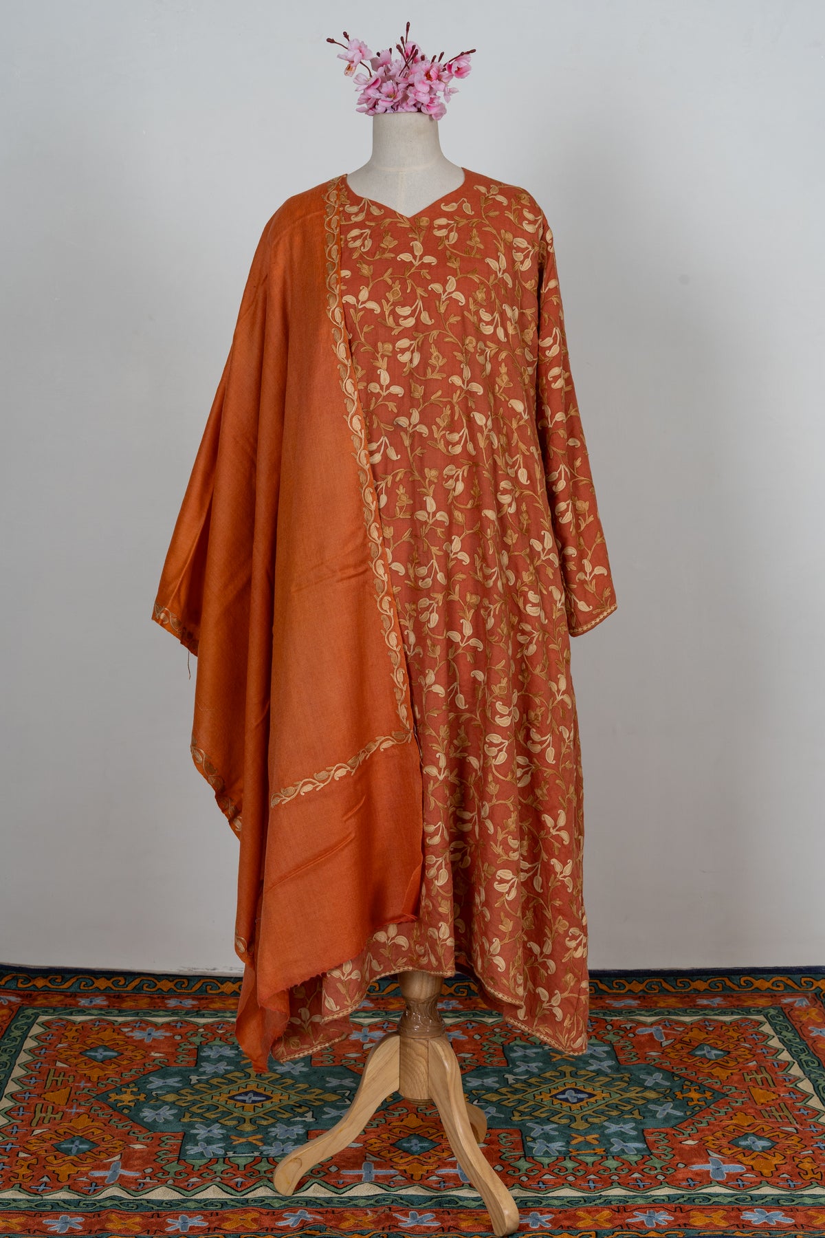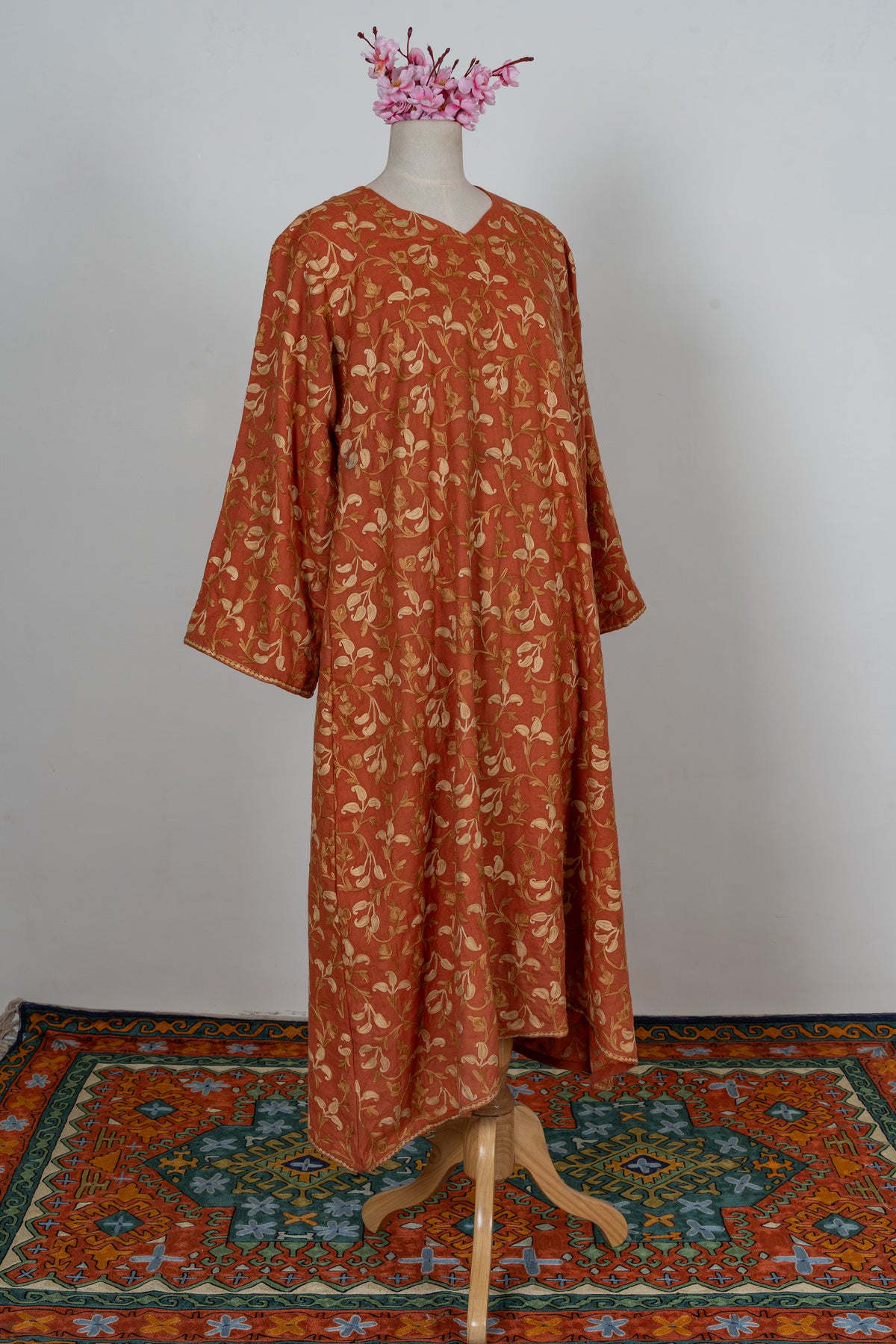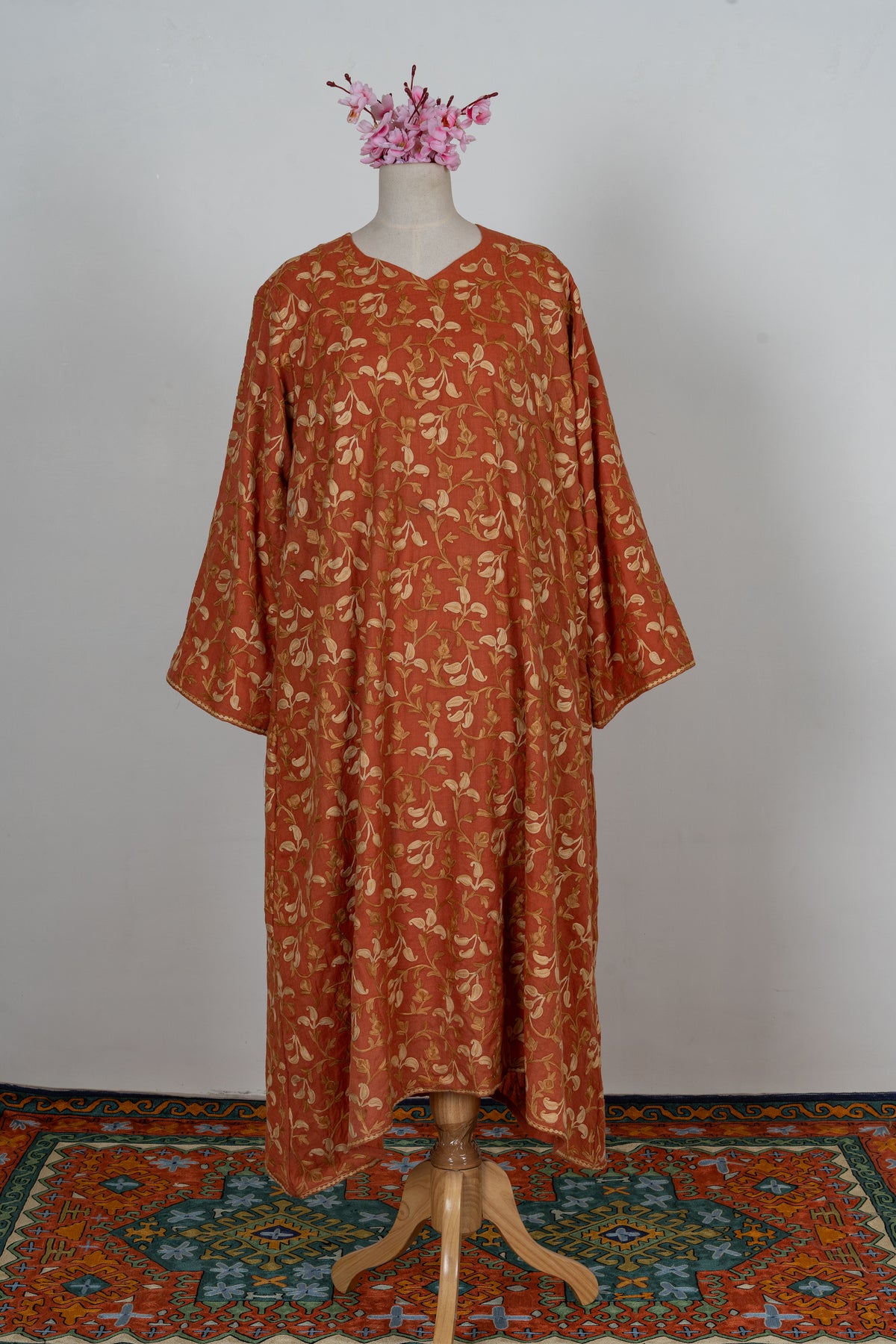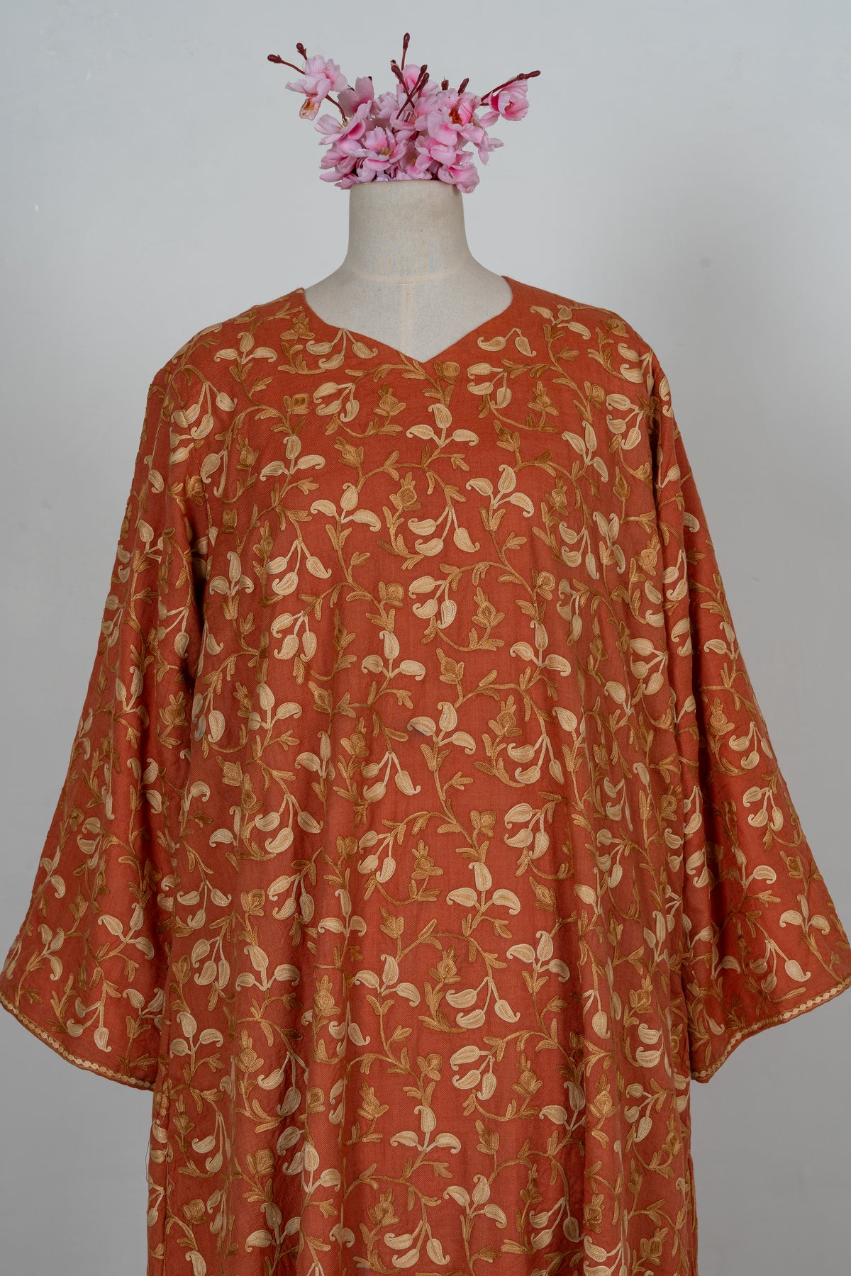 A rich burnt saffron base sets the tone for this full-length Aari Embroidered Abaya, featuring intricate floral vines in soft gold thread. The flowing silhouette paired with the all-over embroidery creates a look that feels both regal and grounded, perfect for making a subtle yet sophisticated statement.