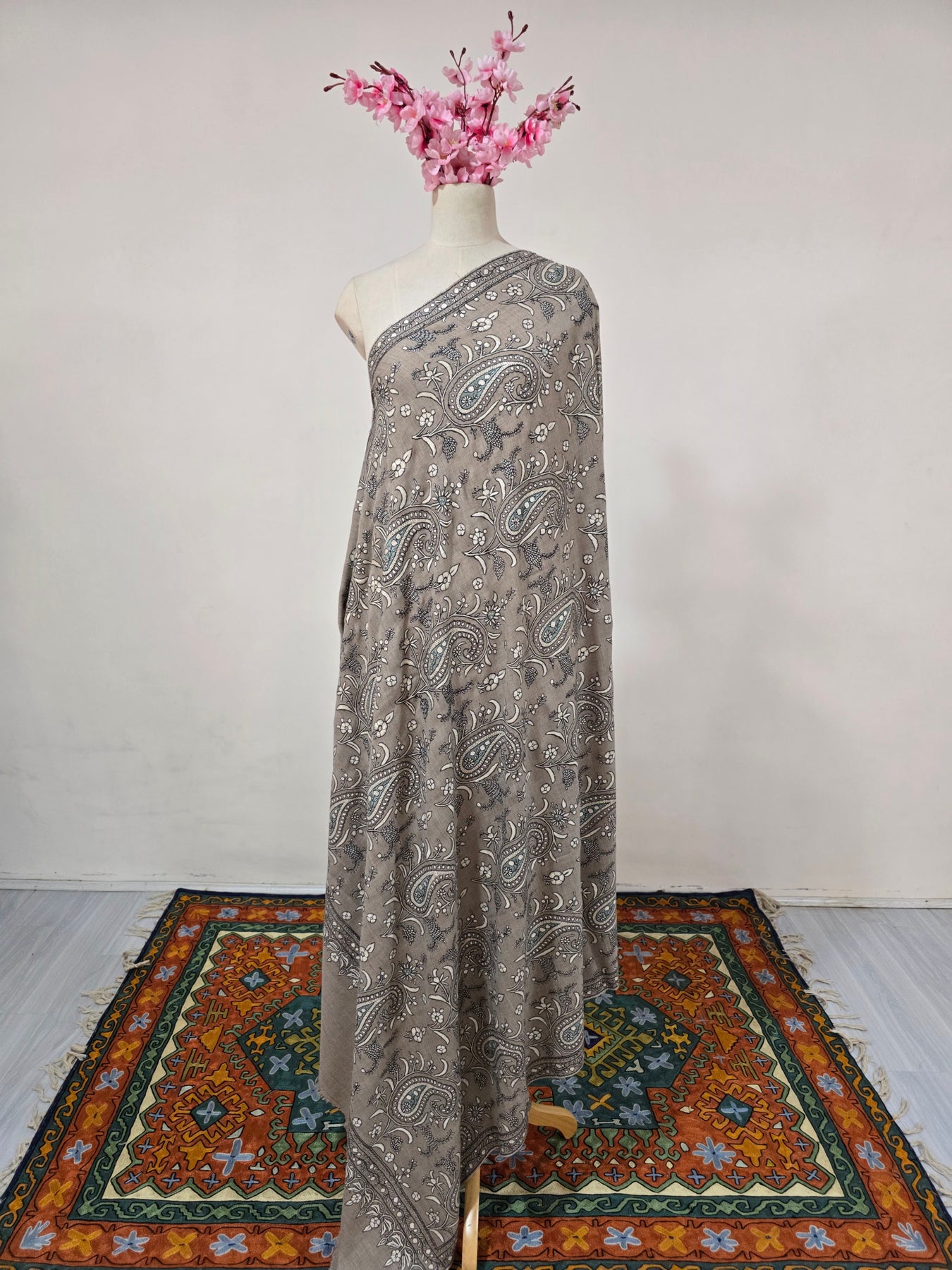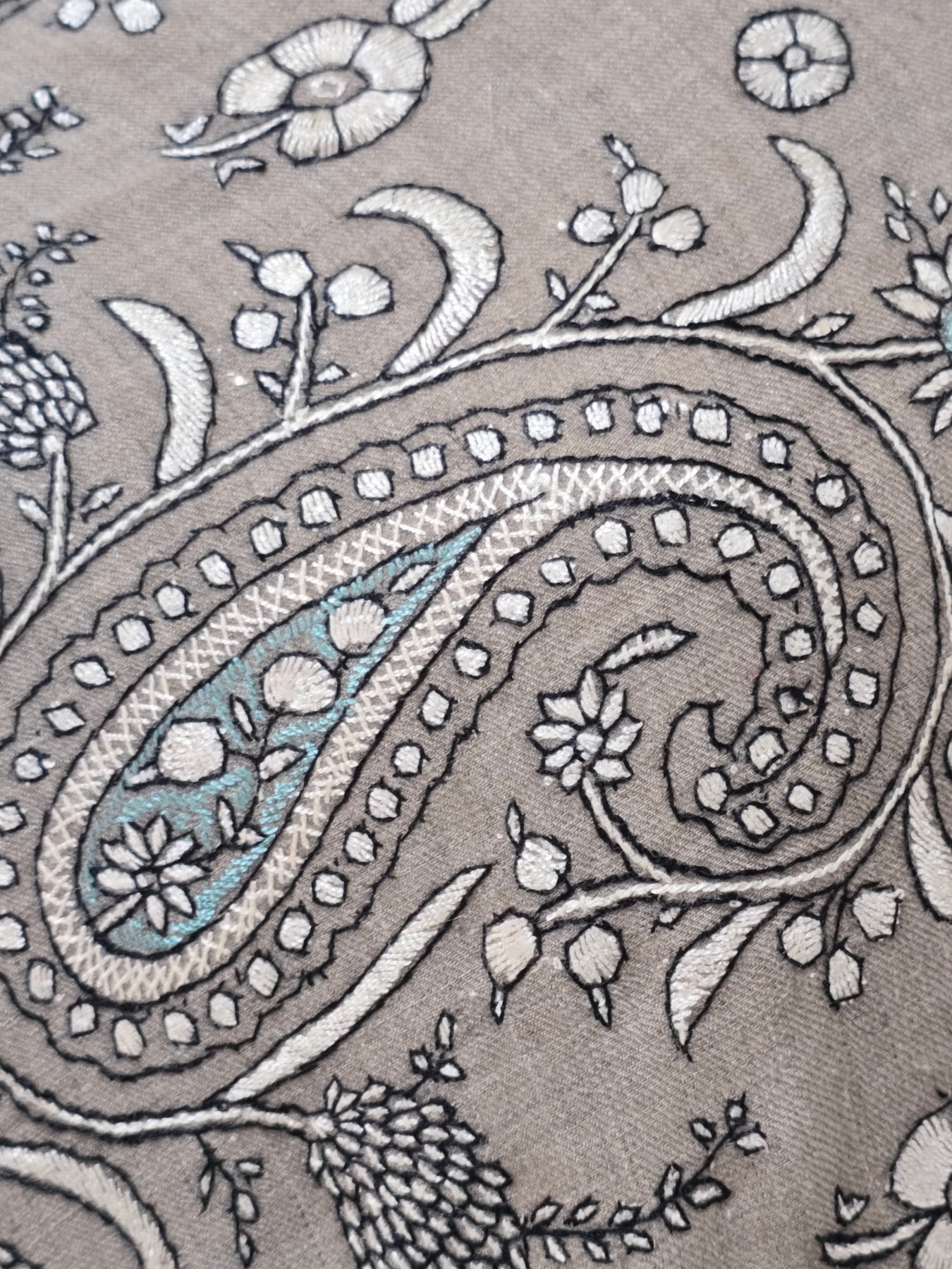 Set against a soft taupe base, this shawl features delicate Sozni embroidery in subtle tones of ivory and muted blues, forming graceful paisley and floral motifs. The refined detailing gives it a calm, sophisticated charm ideal for understated luxury.