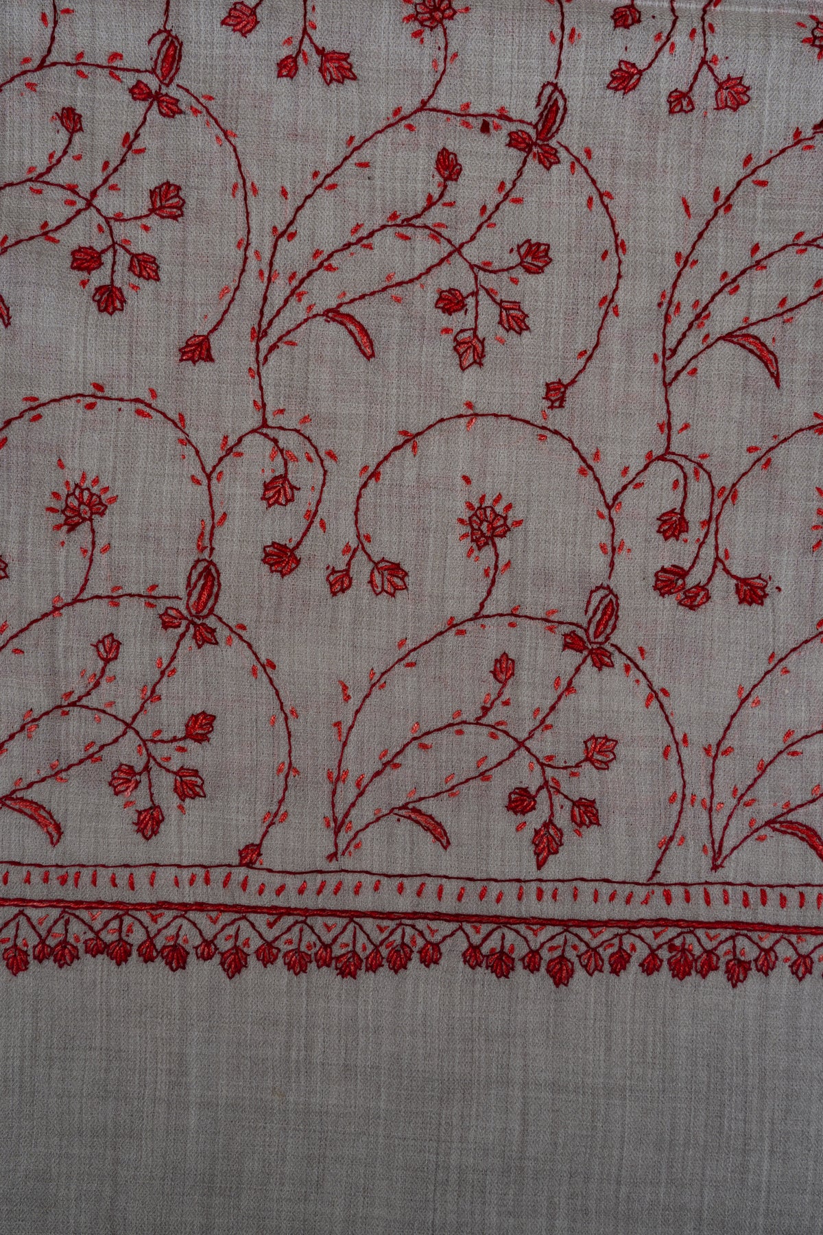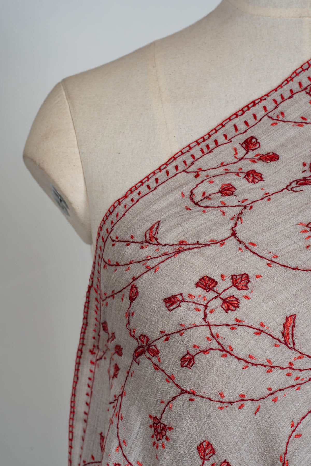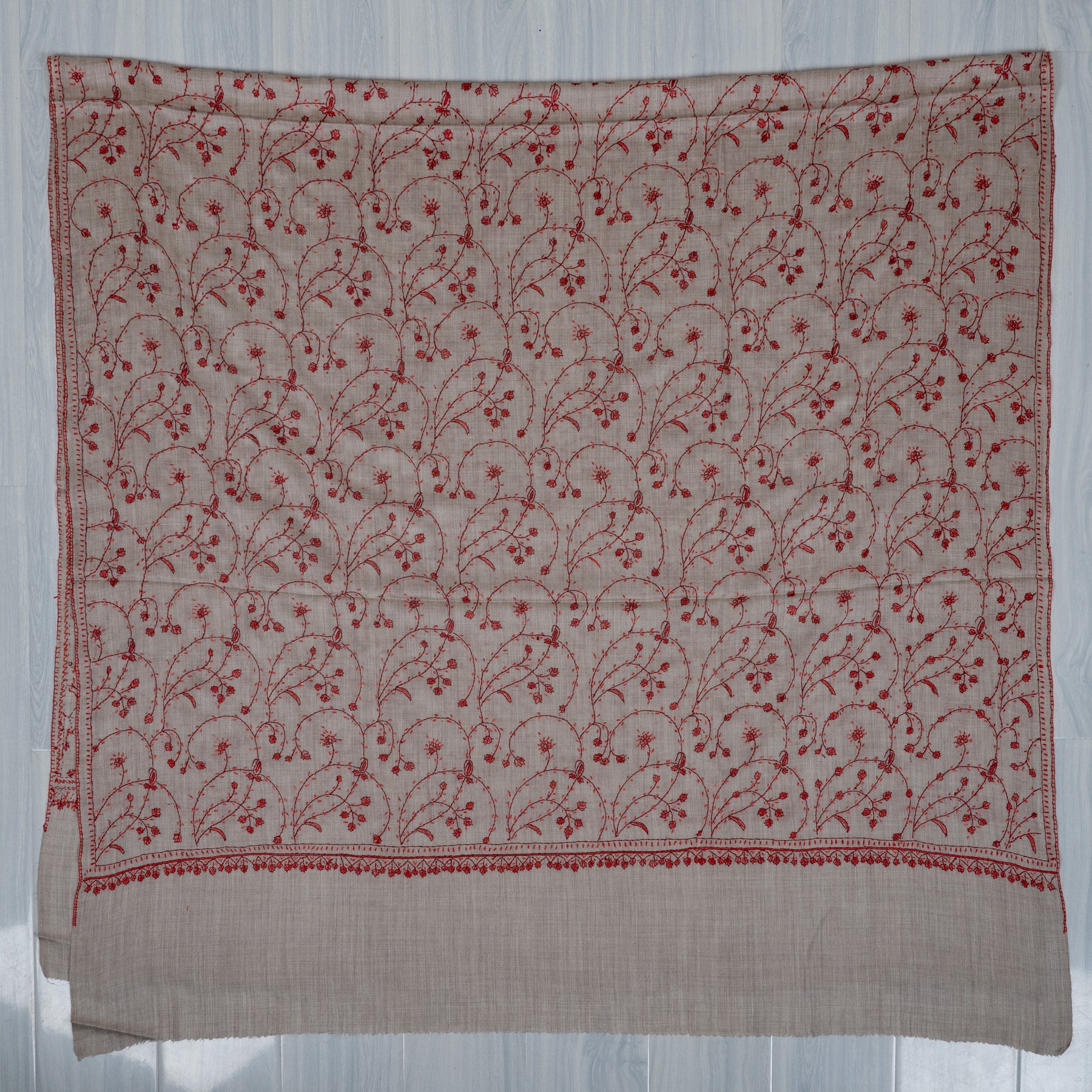 This Merino wool 2.5 Yards Sozni Hand Embroidered Shawl features a soft ivory base enriched with intricate crimson vine embroidery flowing gracefully across the fabric. The delicate floral detailing creates a striking yet refined contrast, giving the shawl a timeless festive charm.