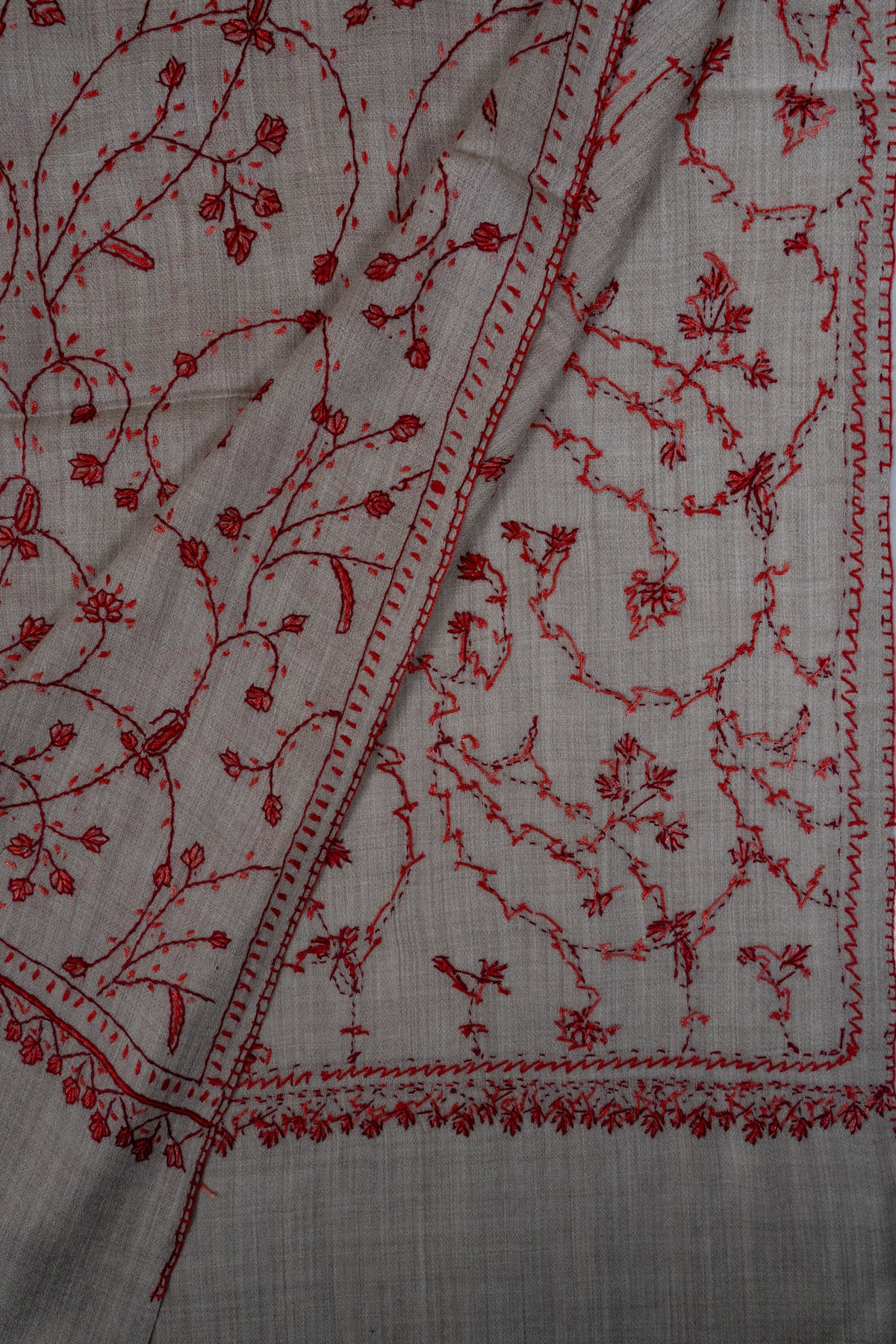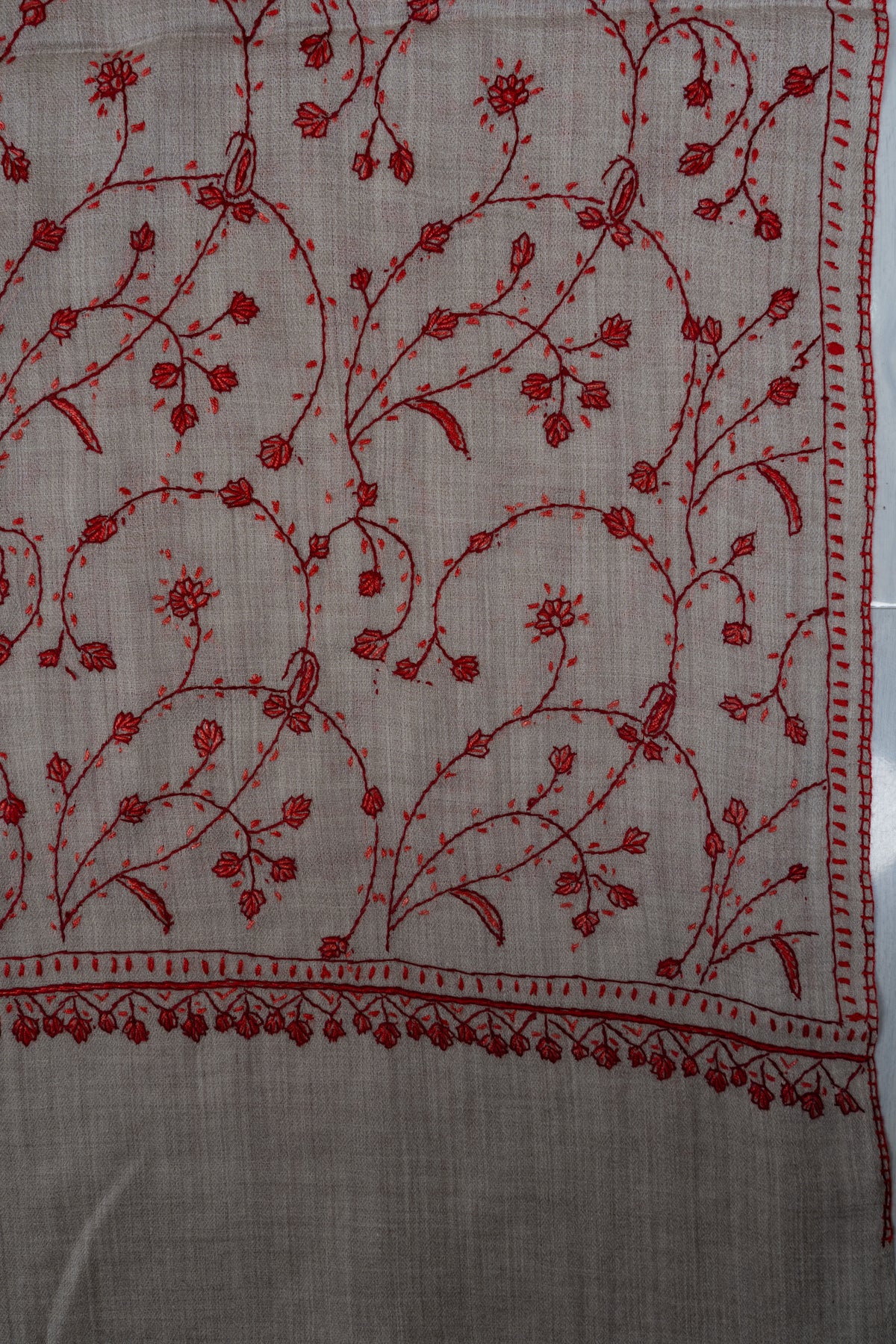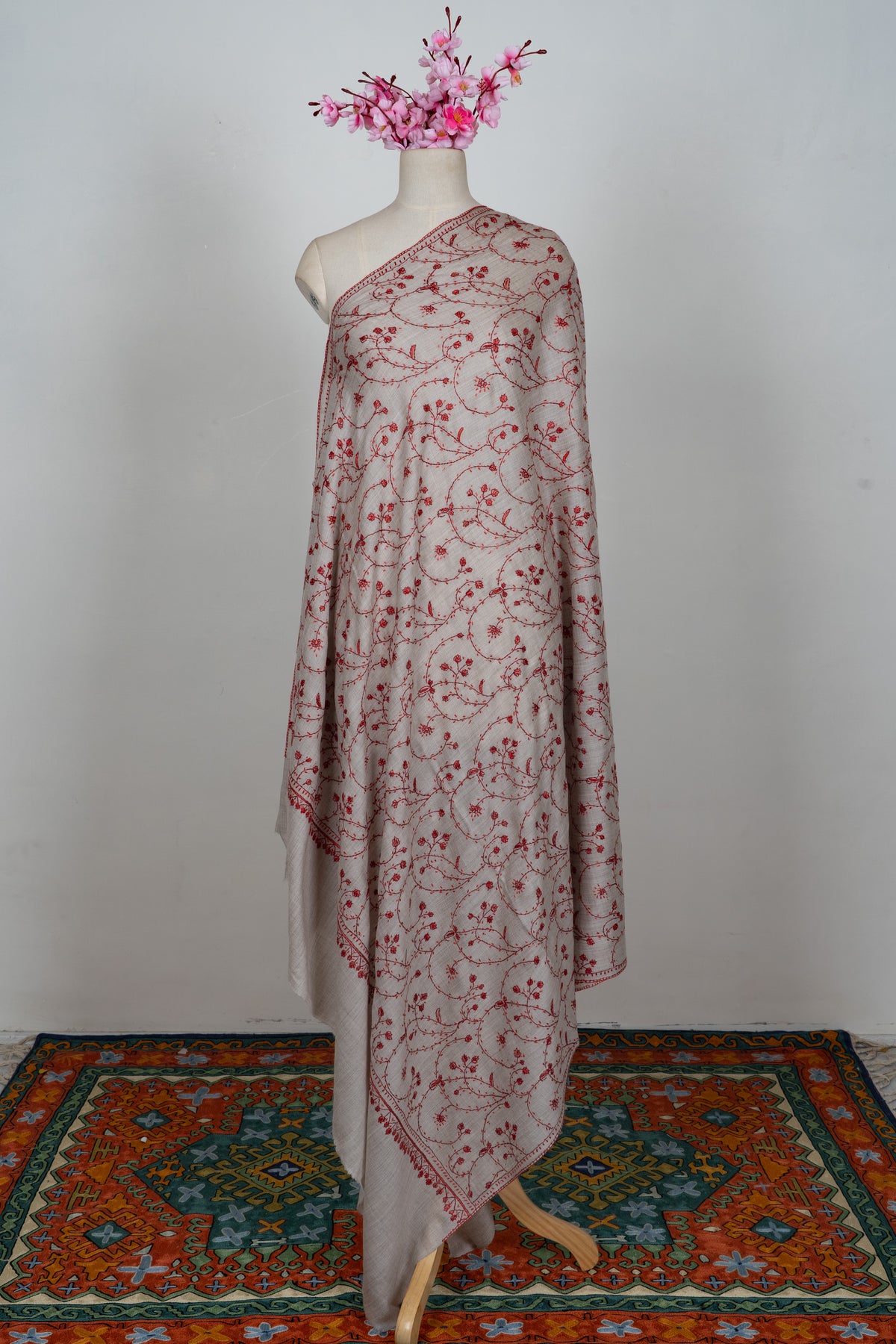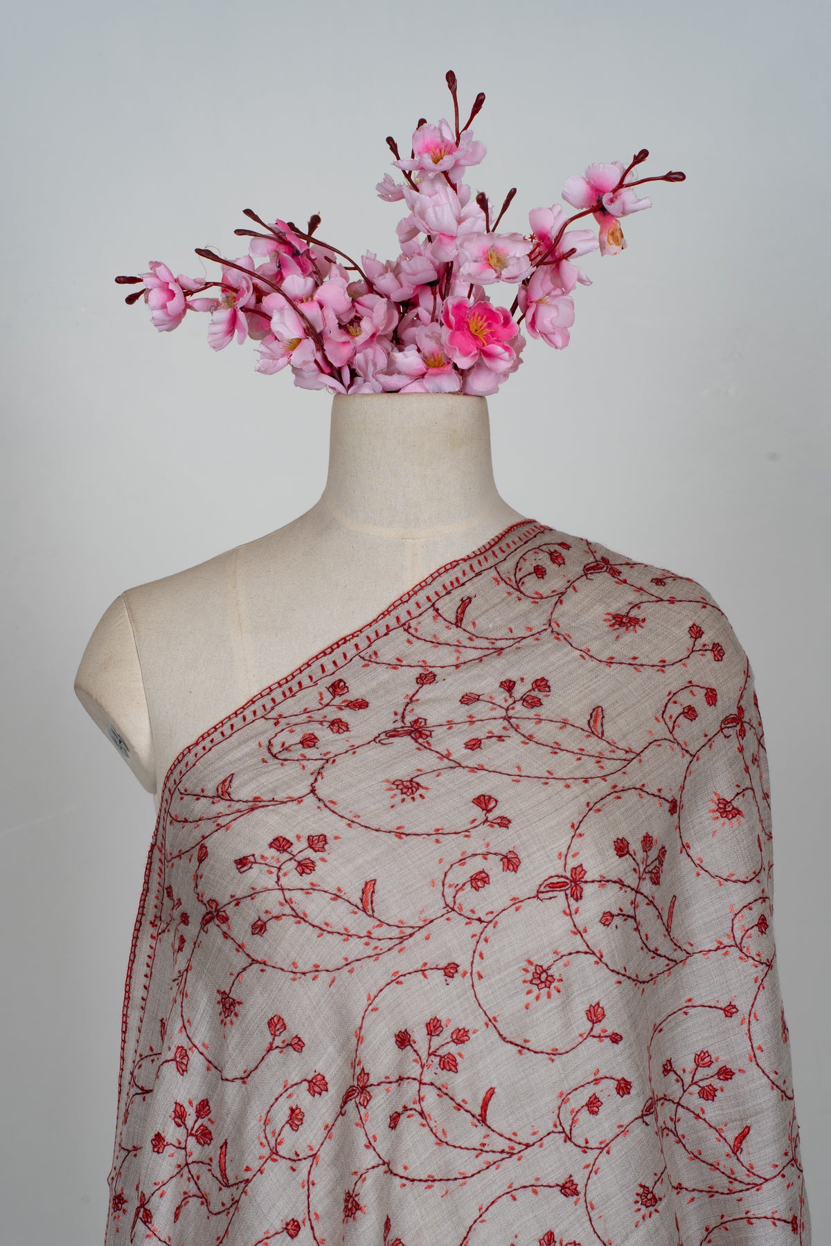 This Merino wool 2.5 Yards Sozni Hand Embroidered Shawl features a soft ivory base enriched with intricate crimson vine embroidery flowing gracefully across the fabric. The delicate floral detailing creates a striking yet refined contrast, giving the shawl a timeless festive charm.