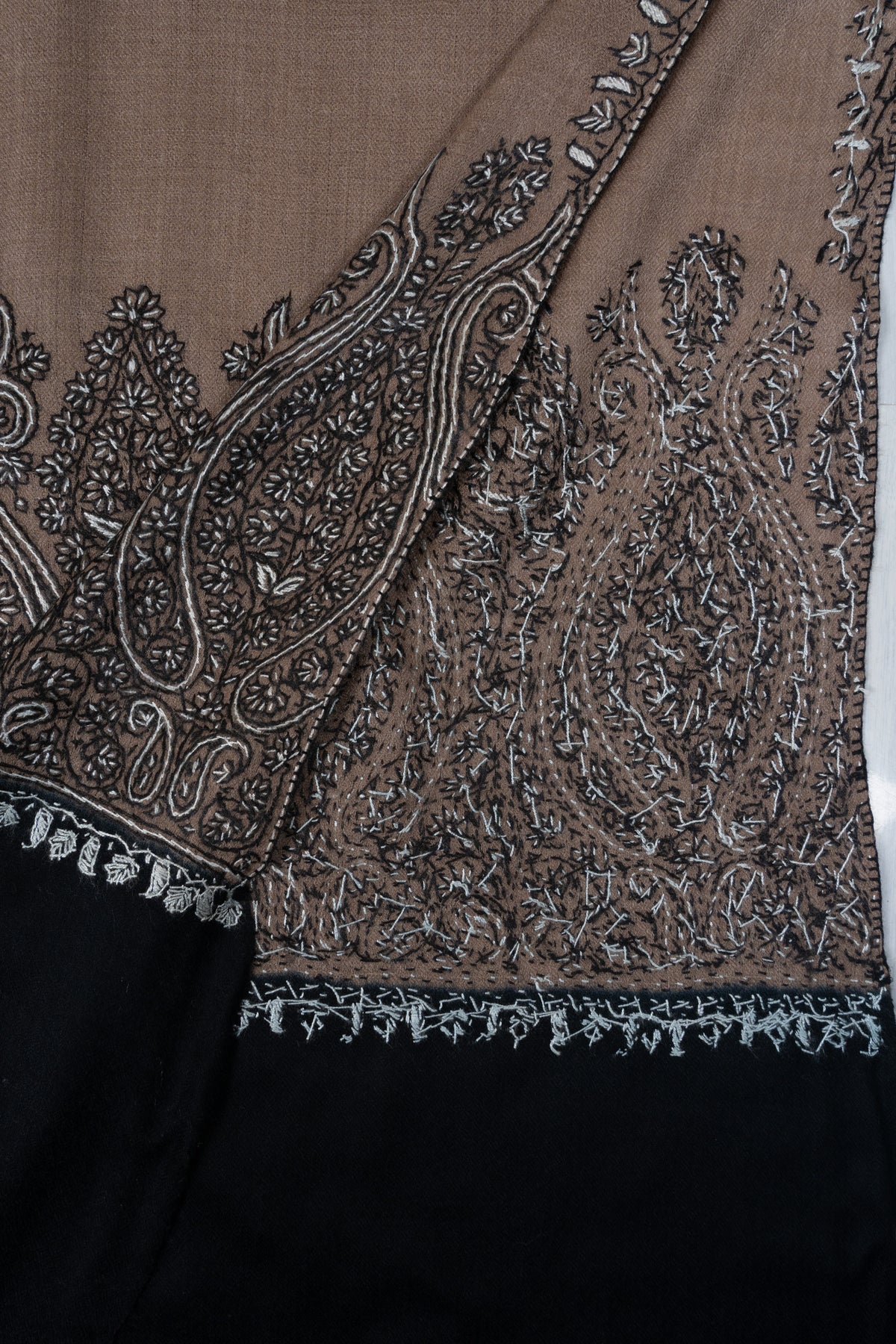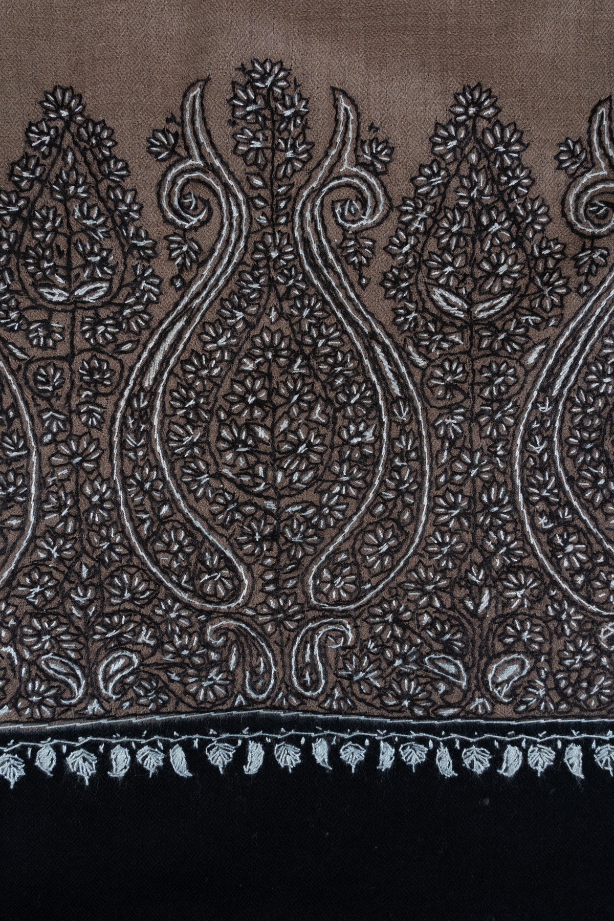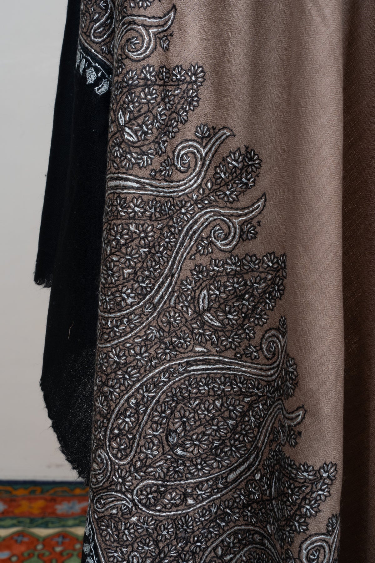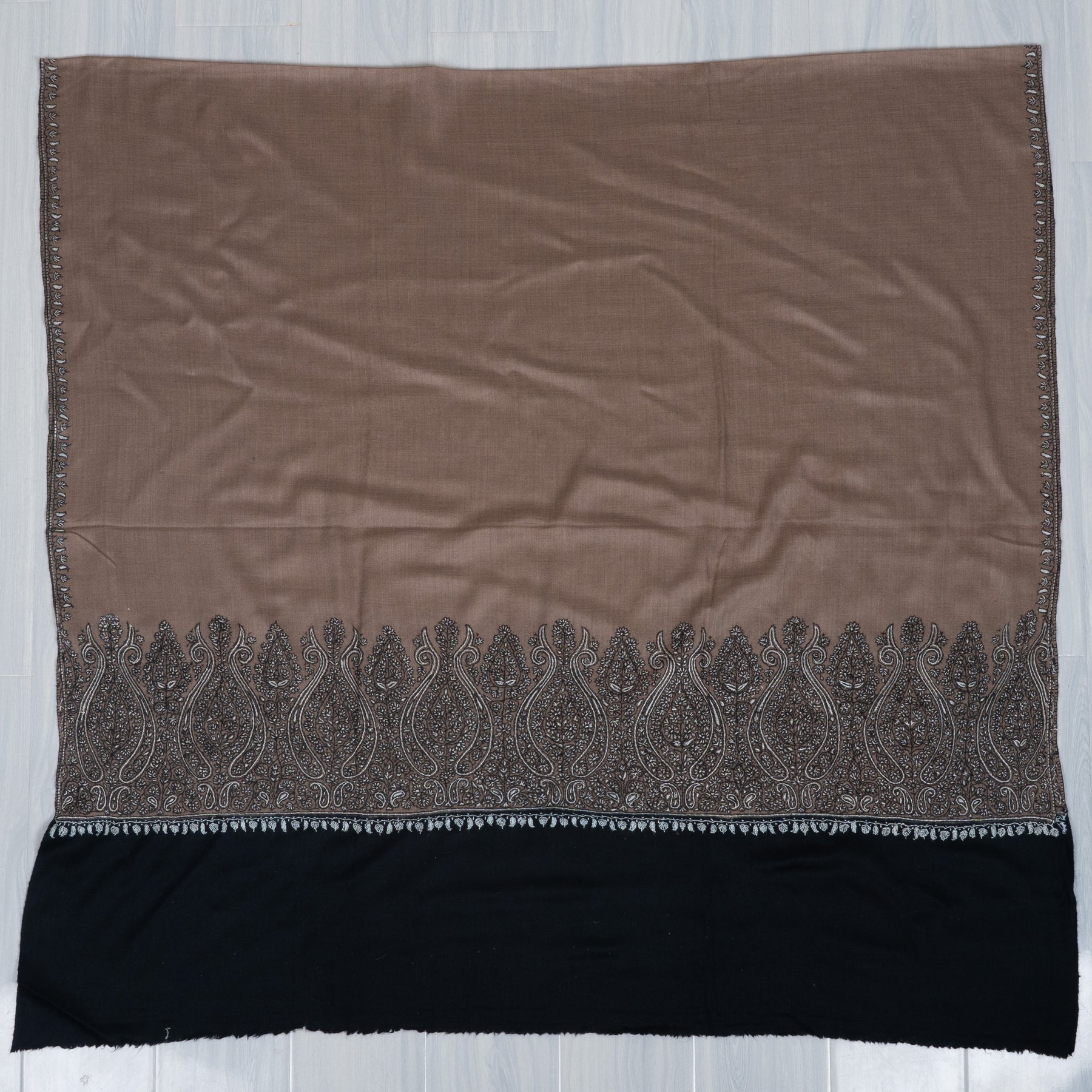 This Merino wool 2.5 Yards Sozni Hand Embroidered Shawl showcases a warm desert taupe base accented with intricate black and silver paisley Sozni embroidery along the border. The bold paisley detailing adds dramatic contrast and visual depth to the muted foundation.