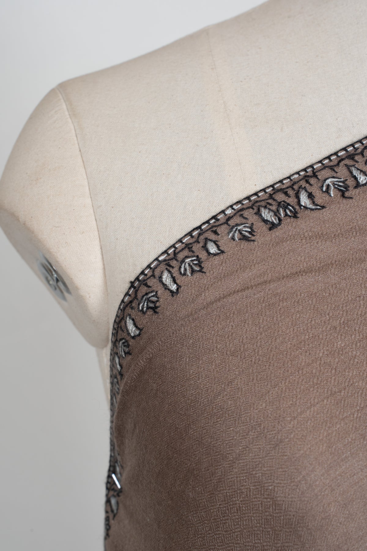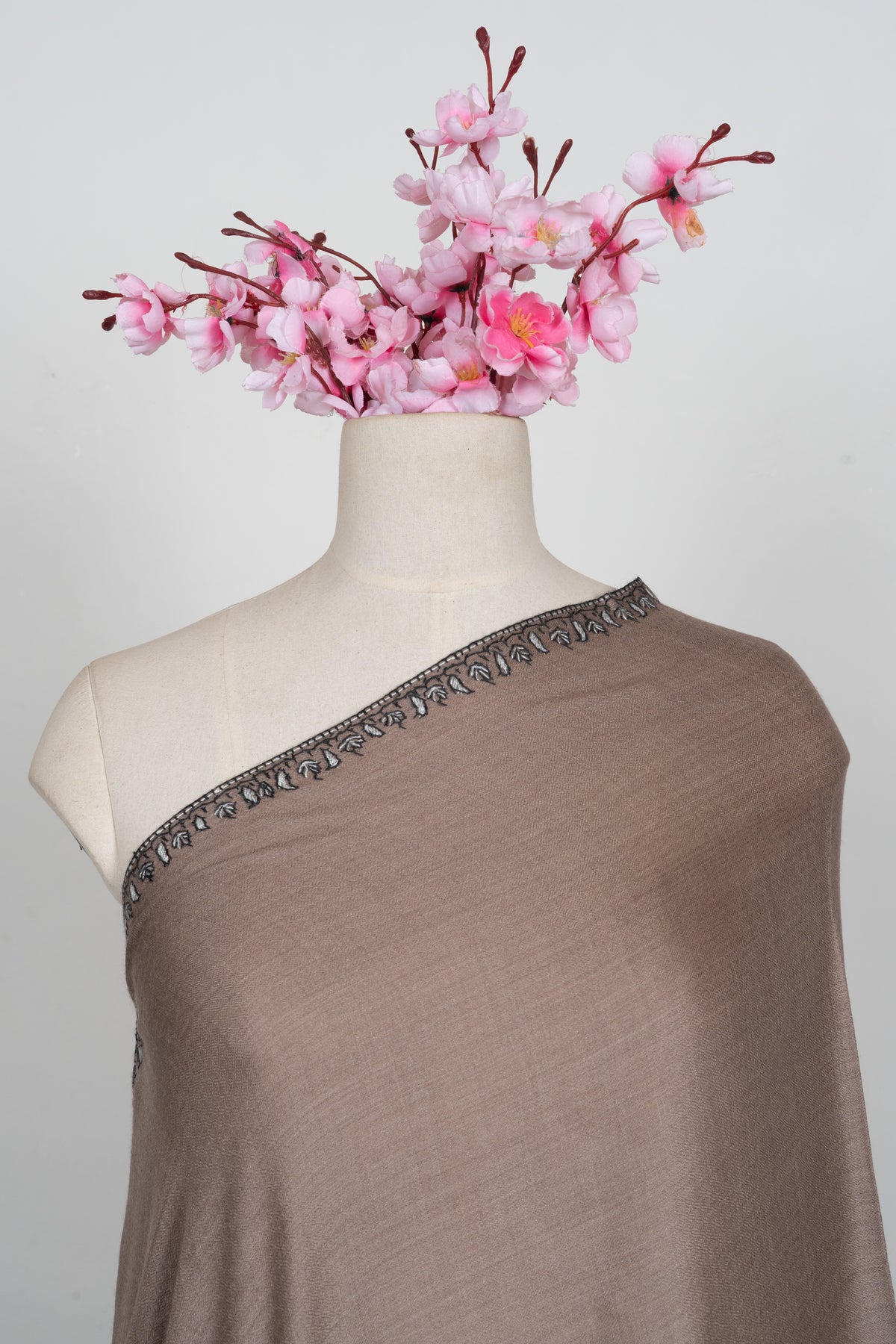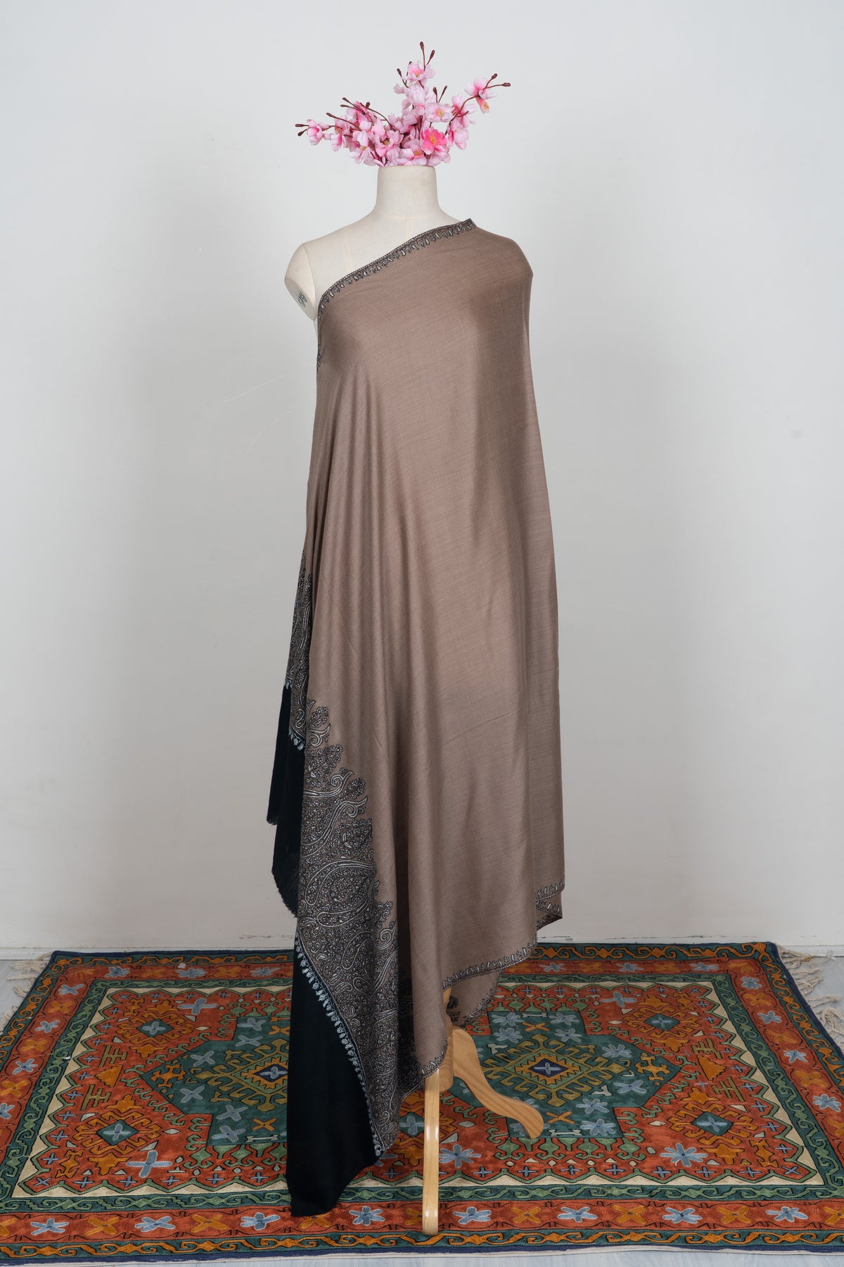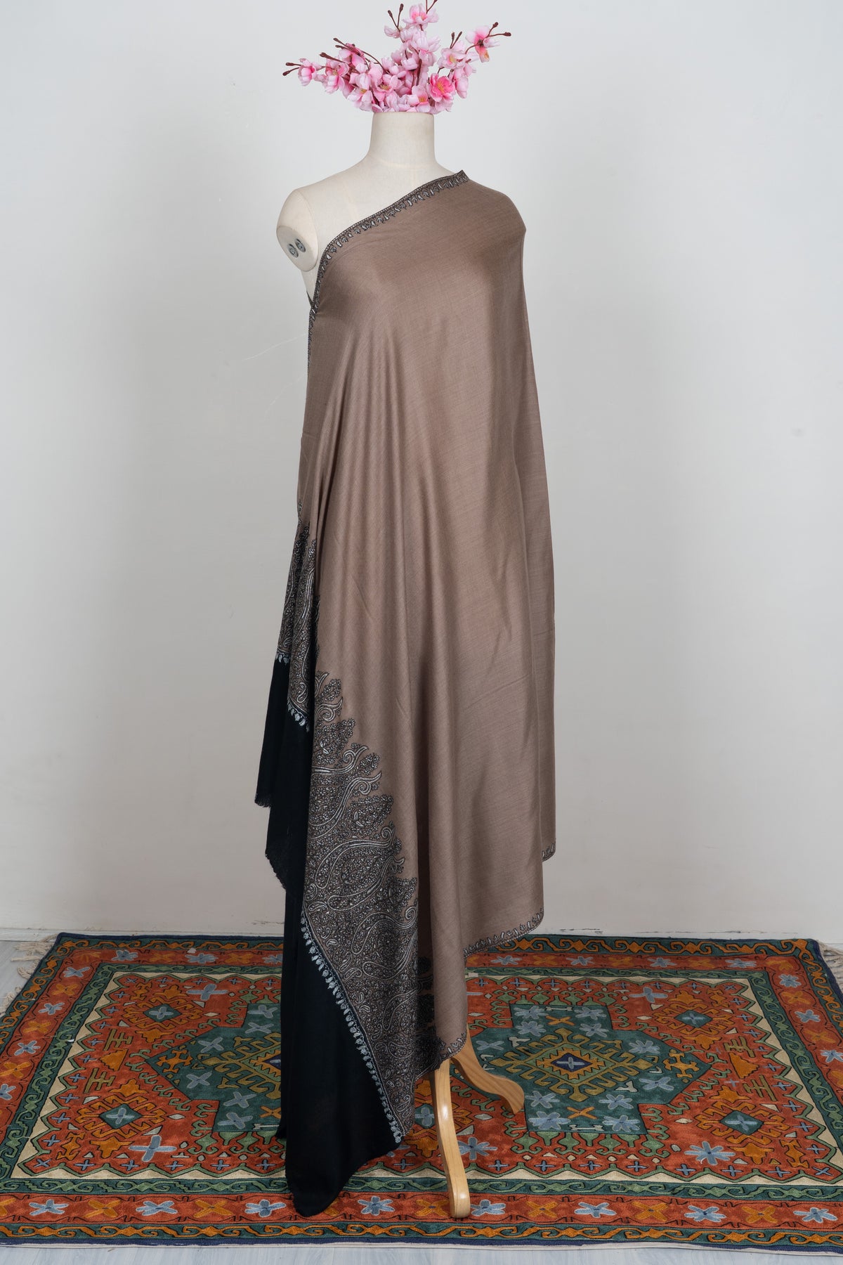 This Merino wool 2.5 Yards Sozni Hand Embroidered Shawl showcases a warm desert taupe base accented with intricate black and silver paisley Sozni embroidery along the border. The bold paisley detailing adds dramatic contrast and visual depth to the muted foundation.