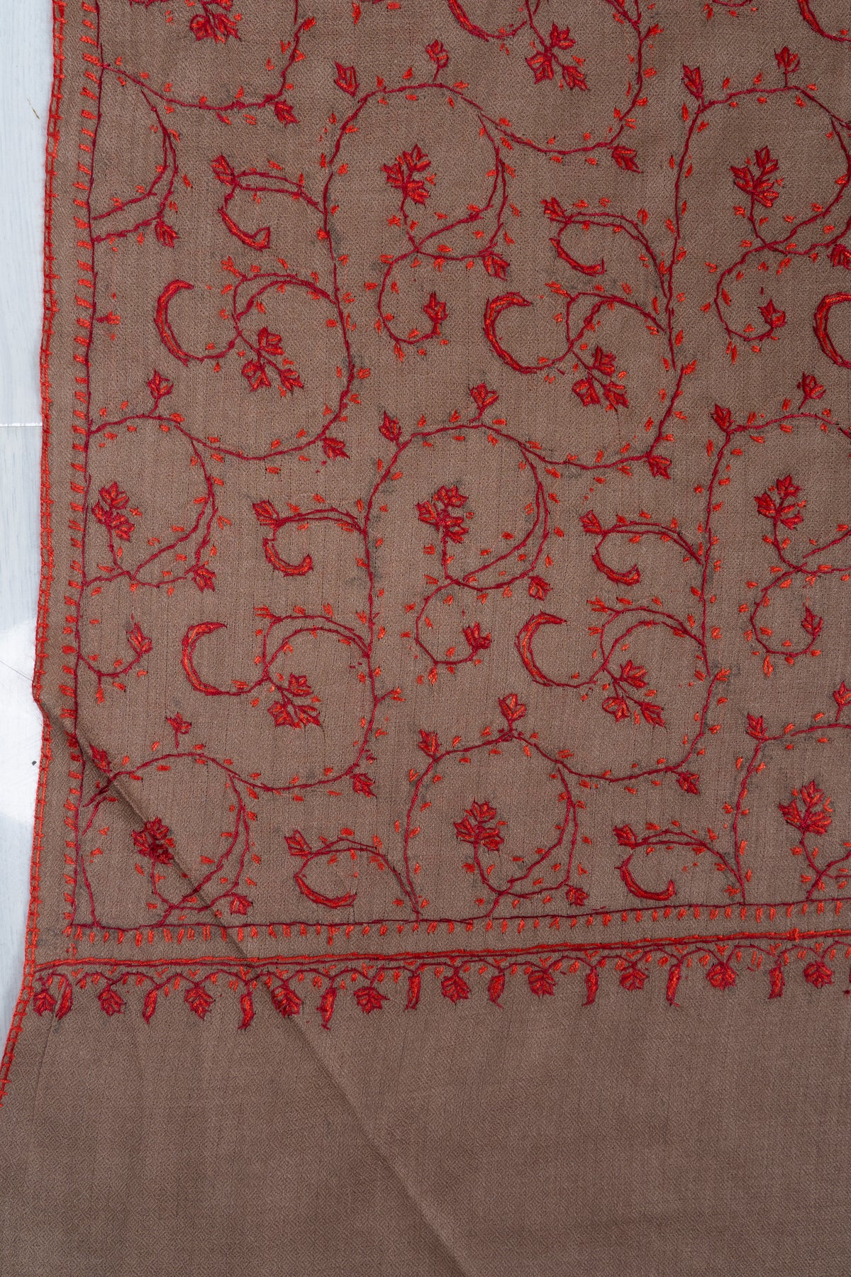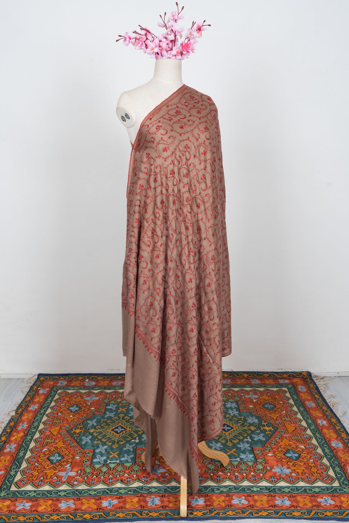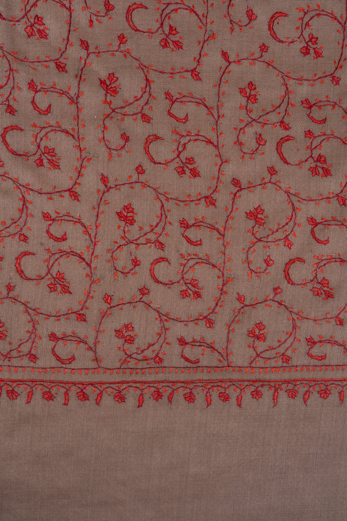 This Merino wool 2.5 Yards Sozni Hand Embroidered Shawl showcases a warm taupe base enriched with intricate red Sozni vine embroidery throughout. The tonal contrast enhances the depth of the fabric, giving it a graceful yet striking presence.