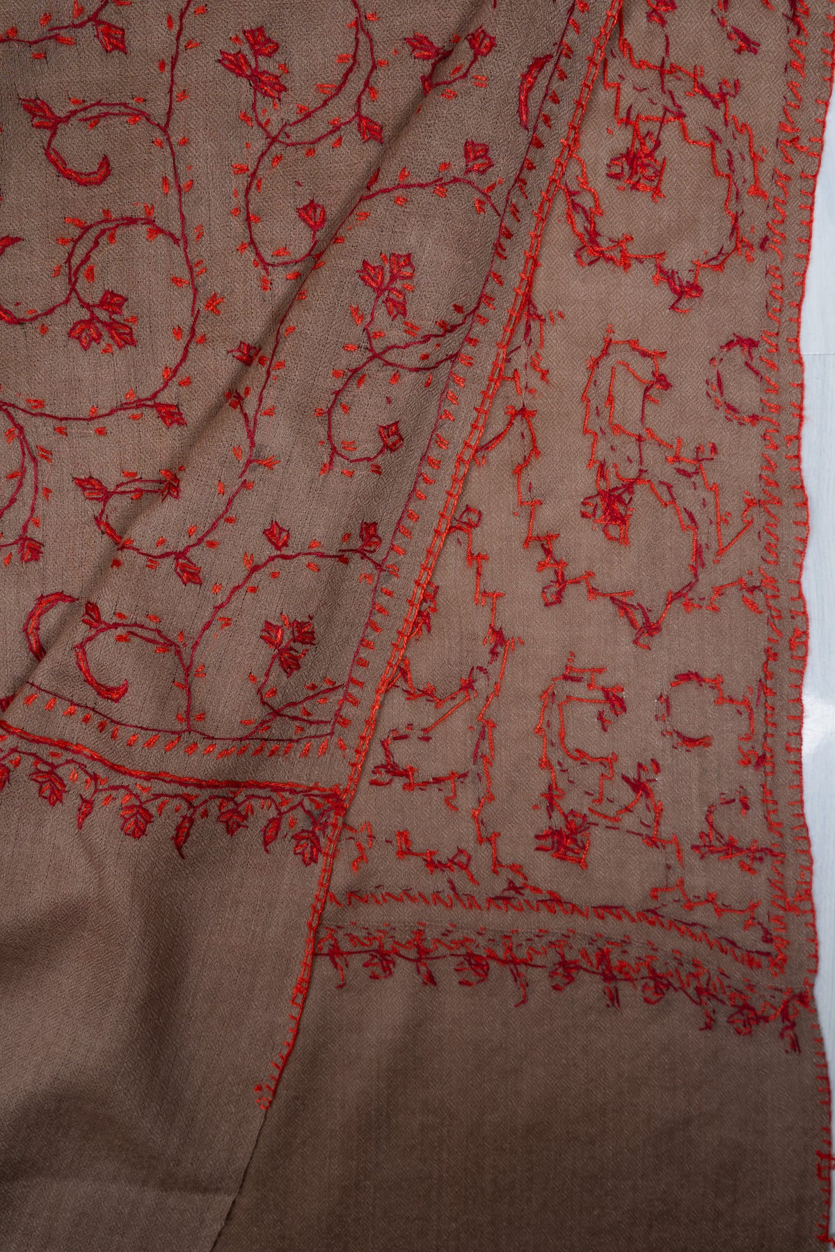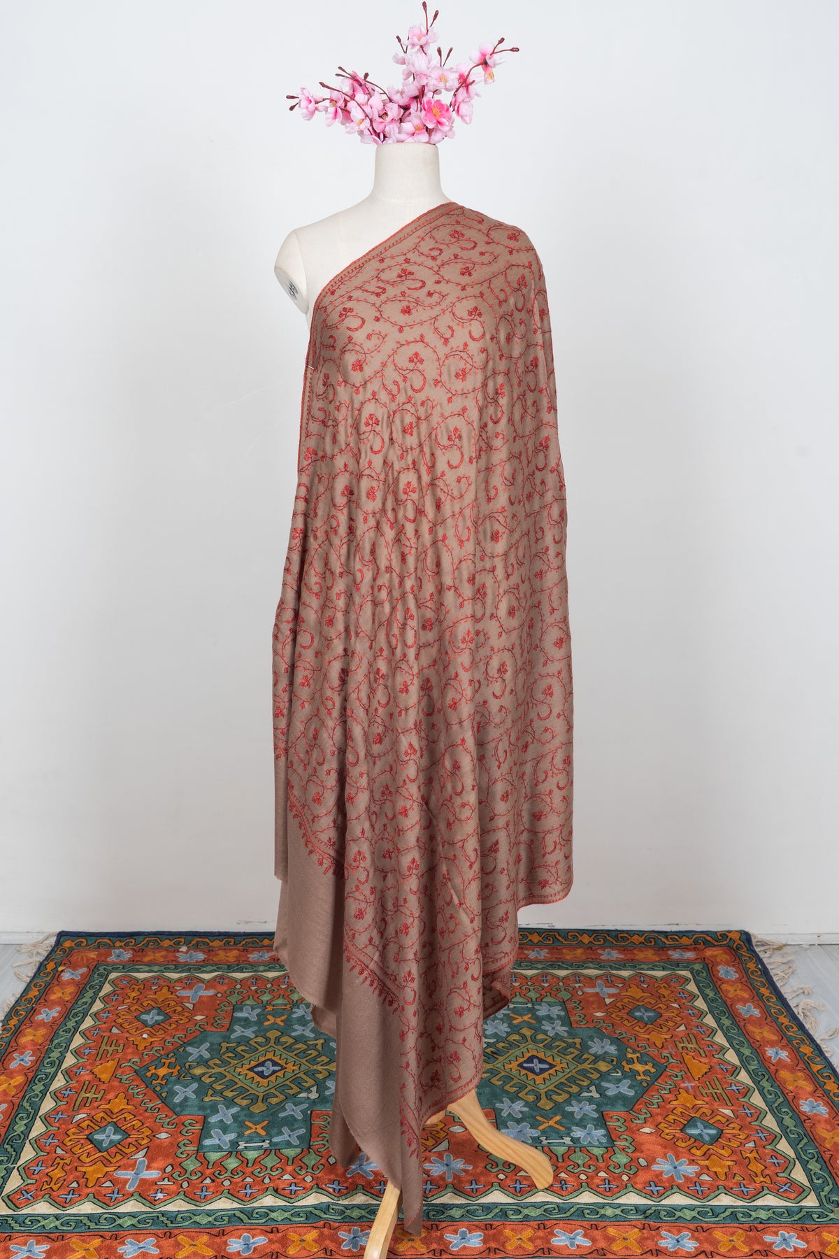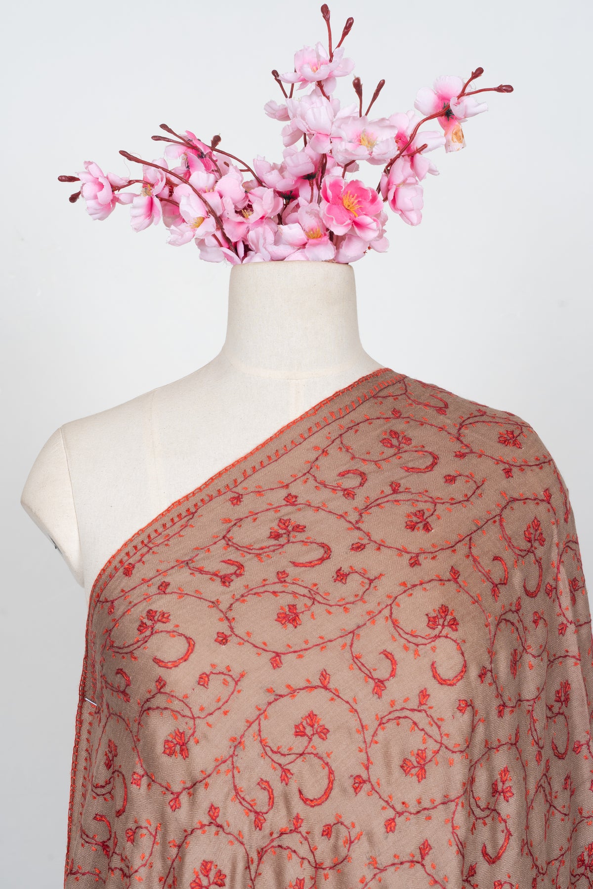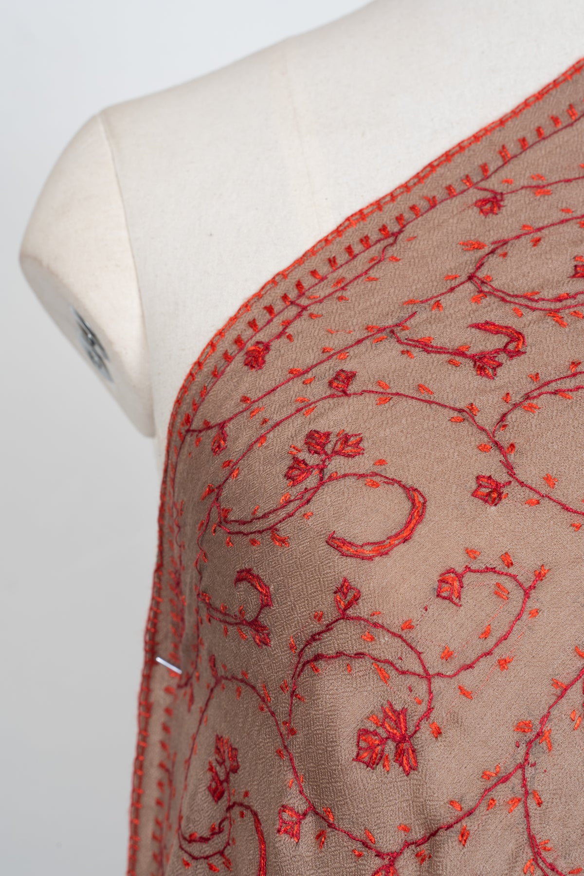 This Merino wool 2.5 Yards Sozni Hand Embroidered Shawl showcases a warm taupe base enriched with intricate red Sozni vine embroidery throughout. The tonal contrast enhances the depth of the fabric, giving it a graceful yet striking presence.