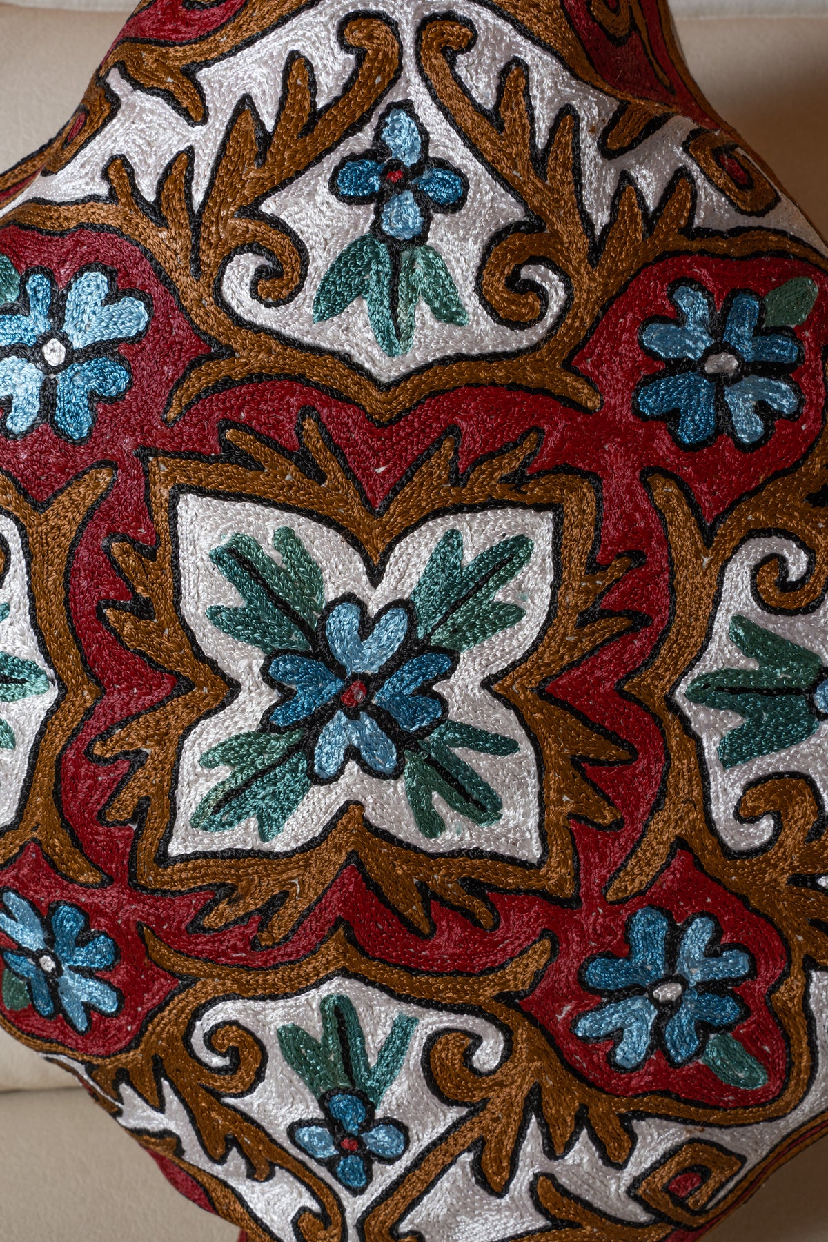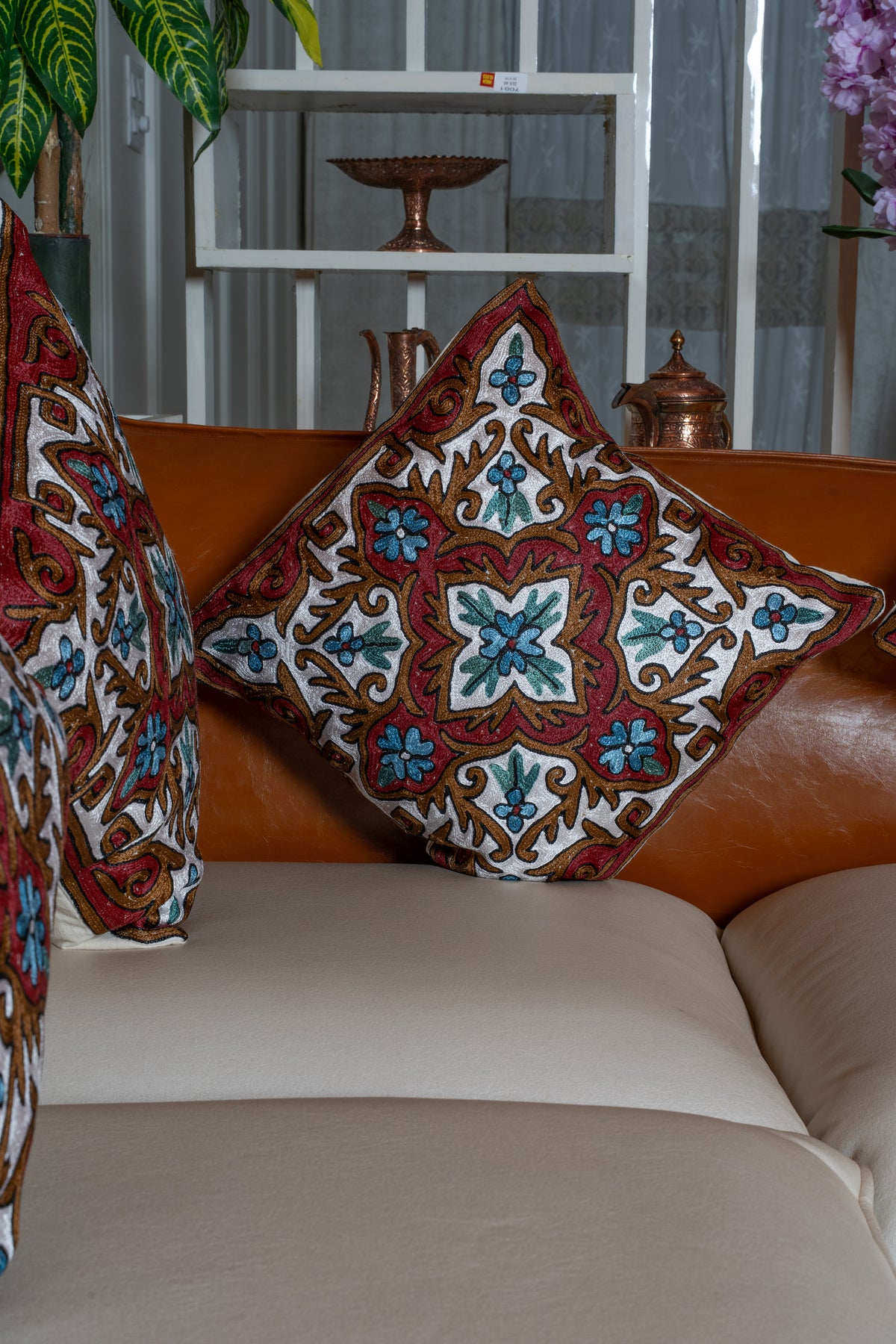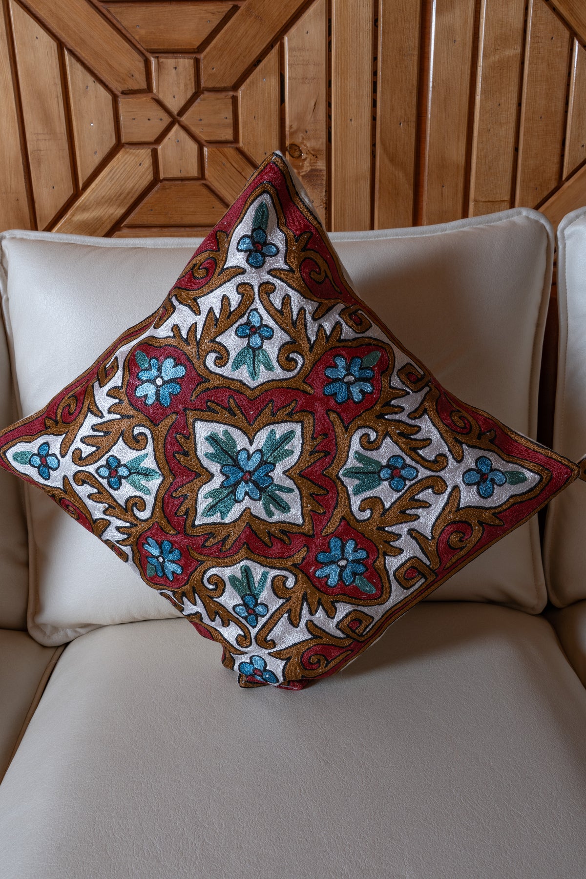 This pillow cover hand embroidered on soft cotton showcases intricate floral patterns in warm crimson, teal, and earthy brown tones. The flowing vine like motifs and detailed blossoms create a dynamic yet harmonious composition that feels rich and inviting.