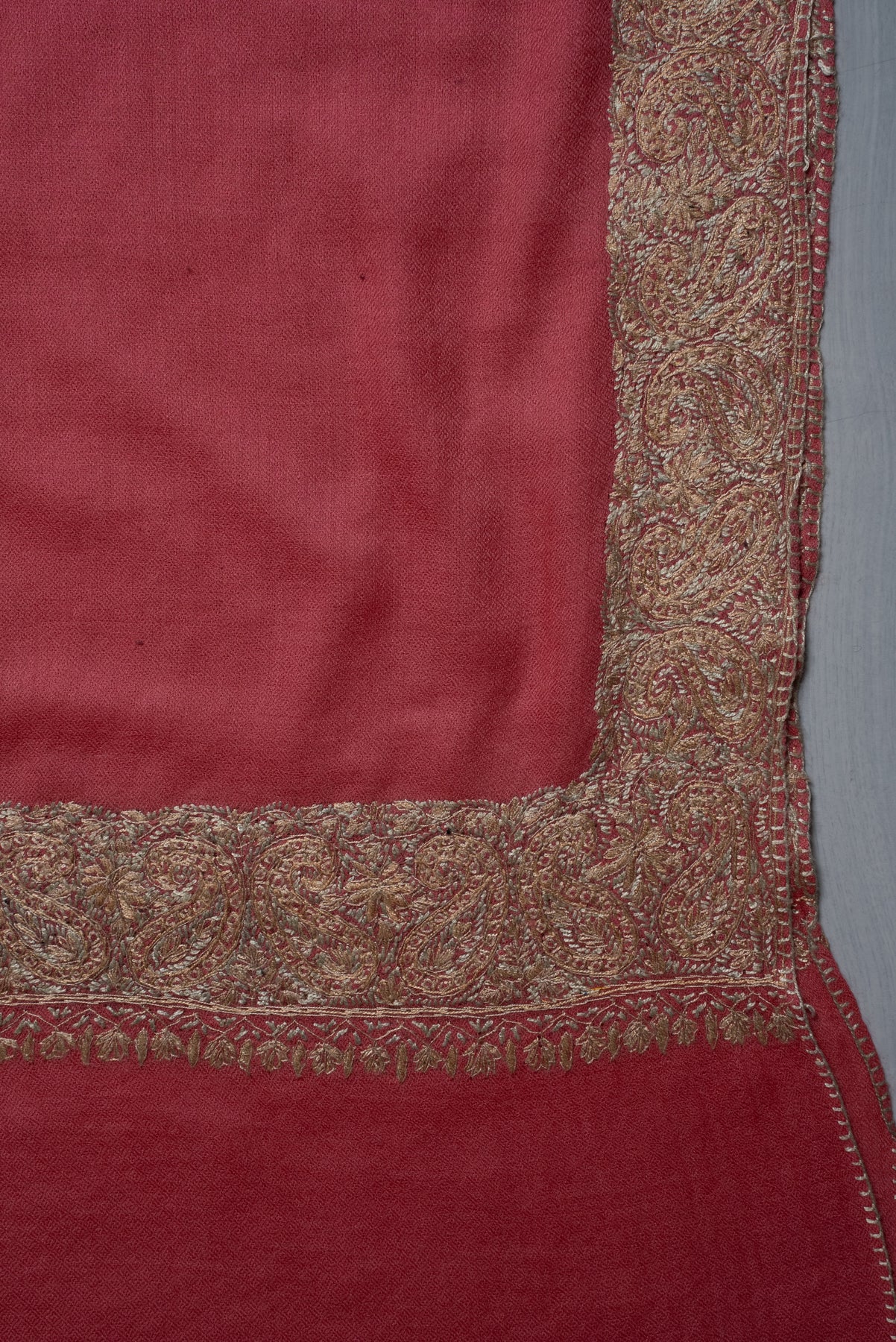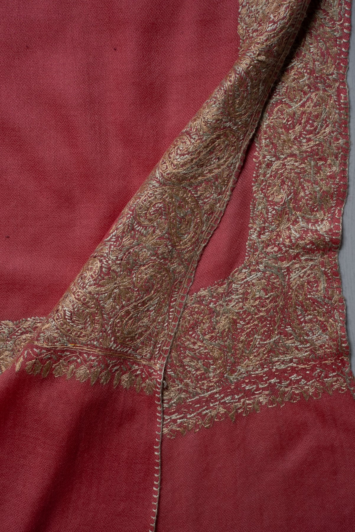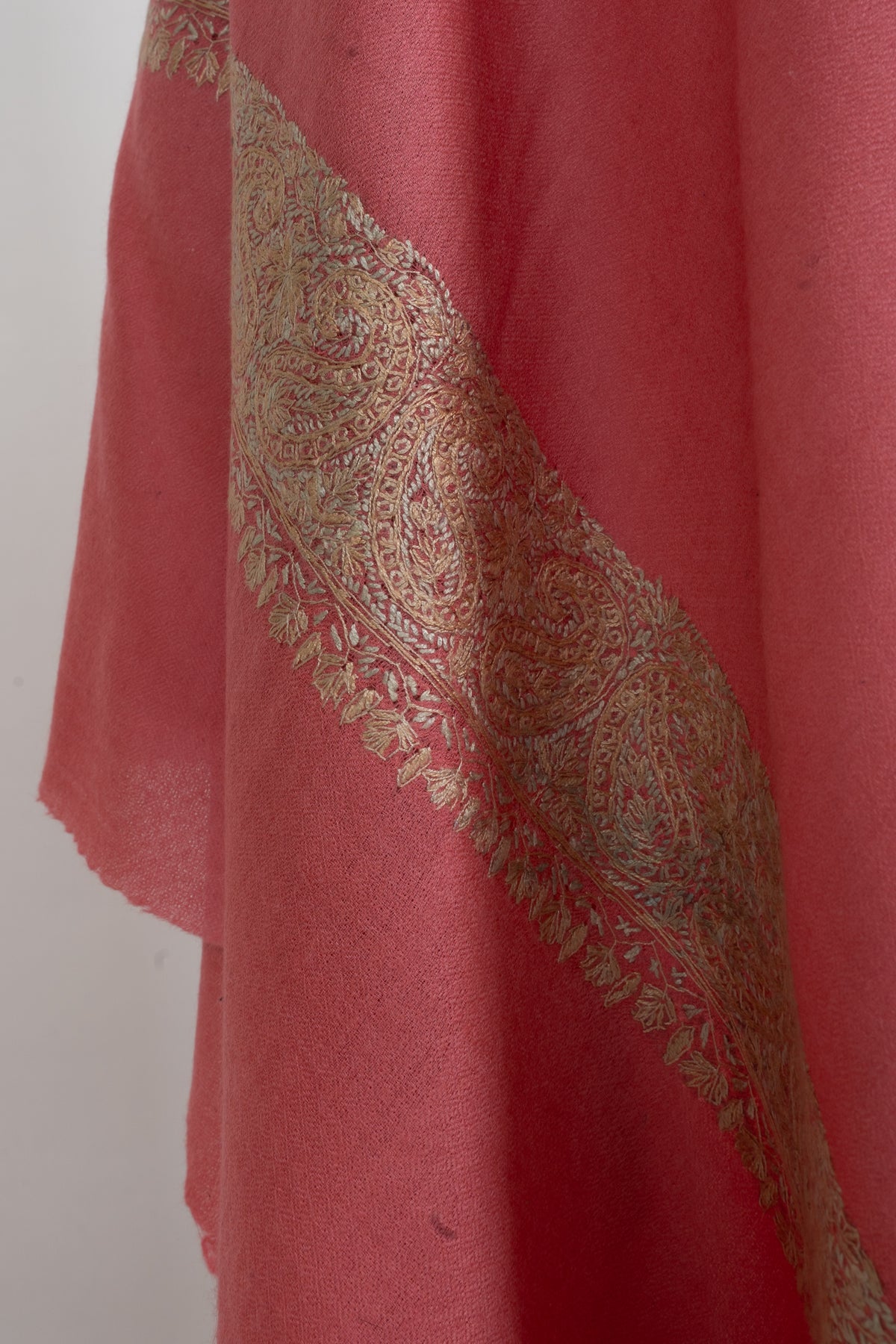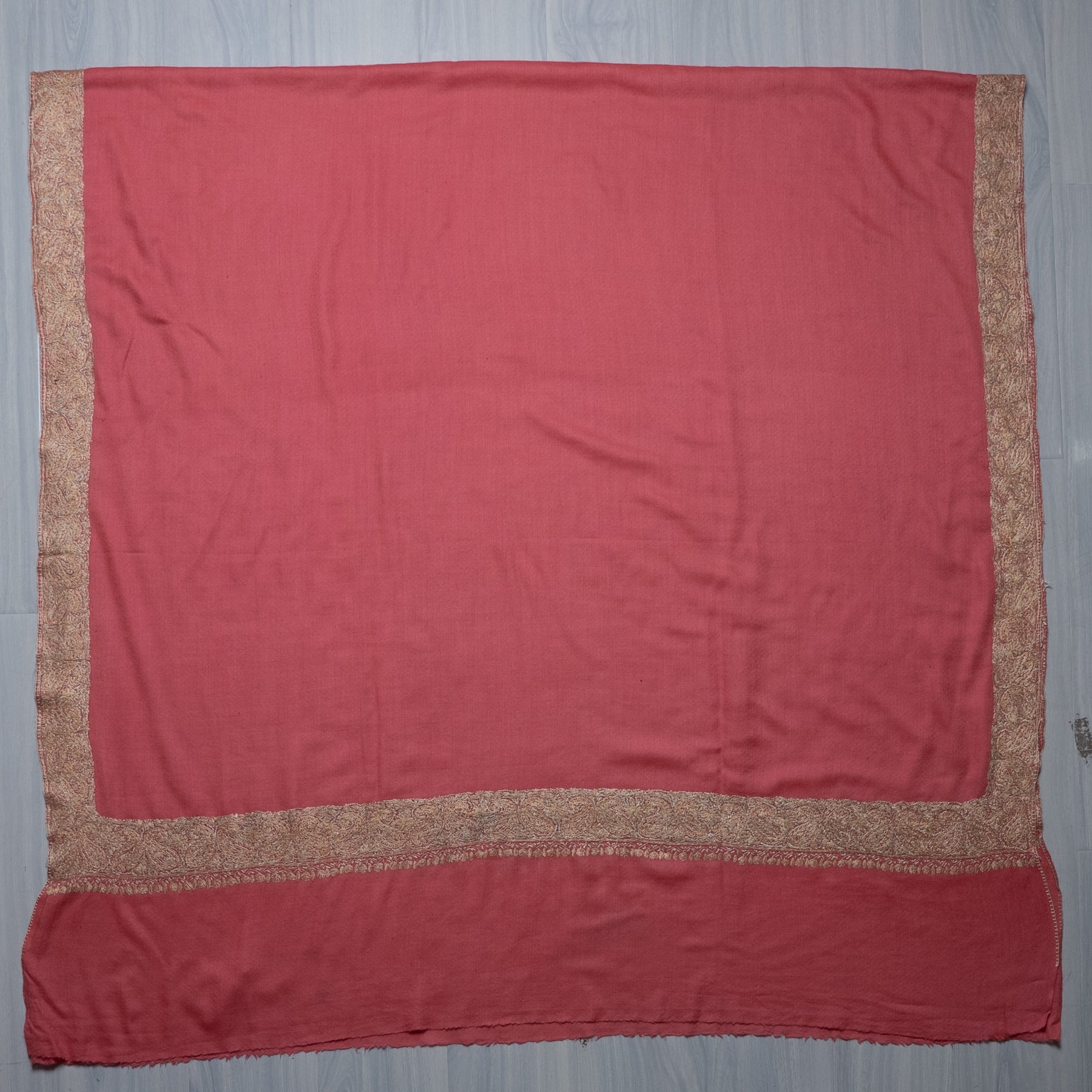 Coral Gold Classic Edge: Merino Wool Hand Embroidered 2.5 Yards Shawl