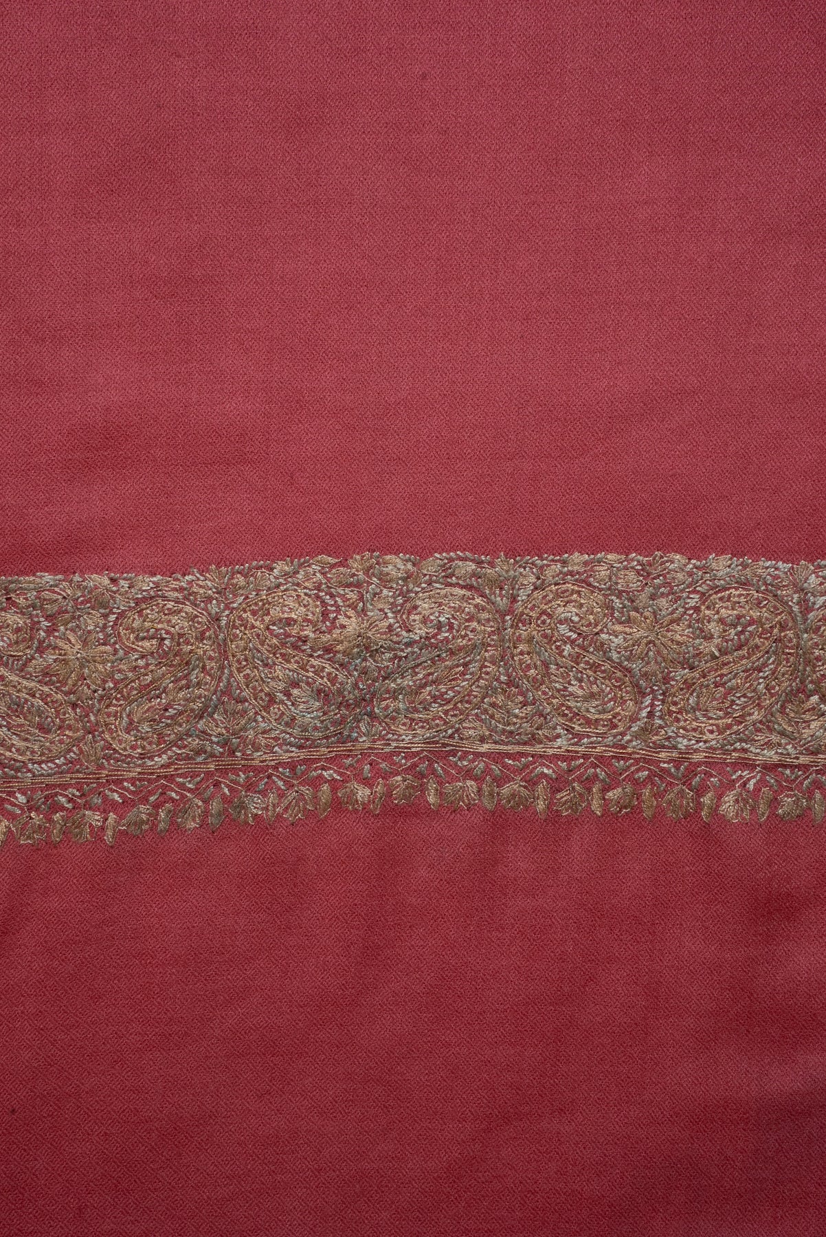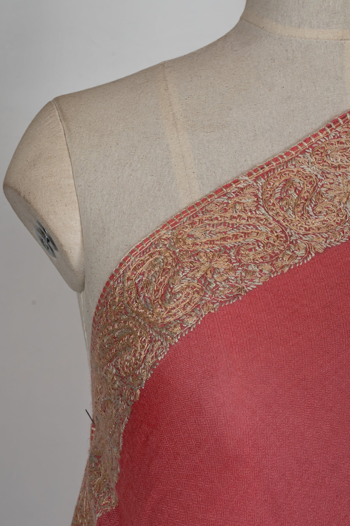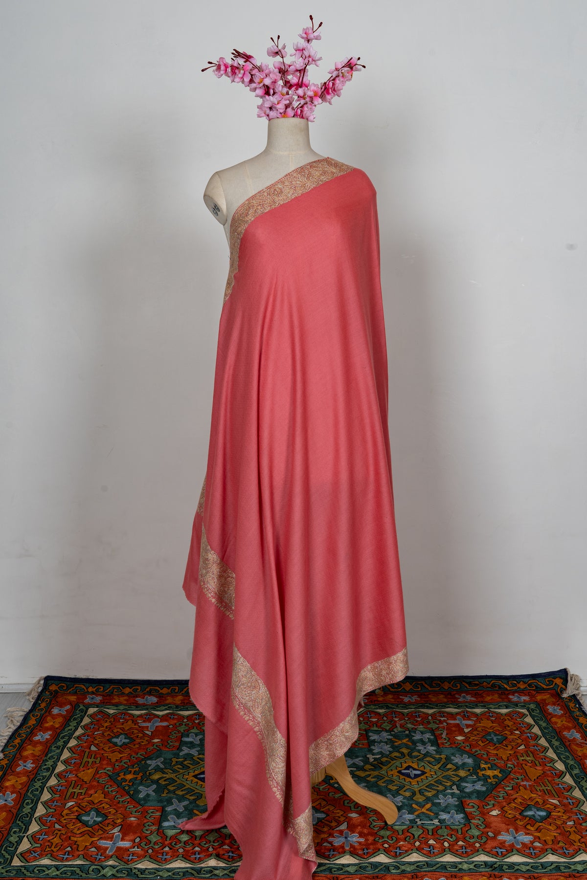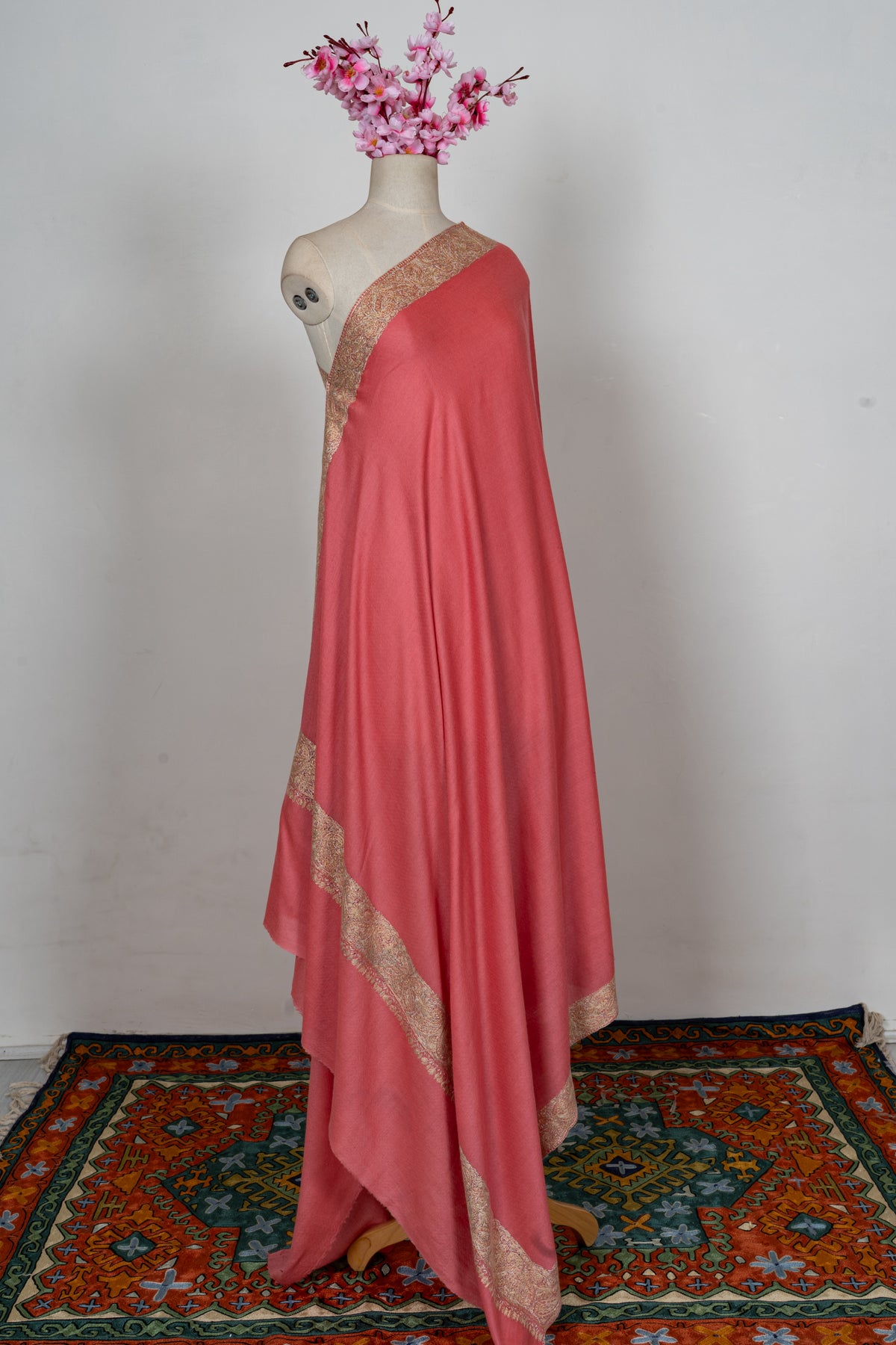 Coral Gold Classic Edge: Merino Wool Hand Embroidered 2.5 Yards Shawl