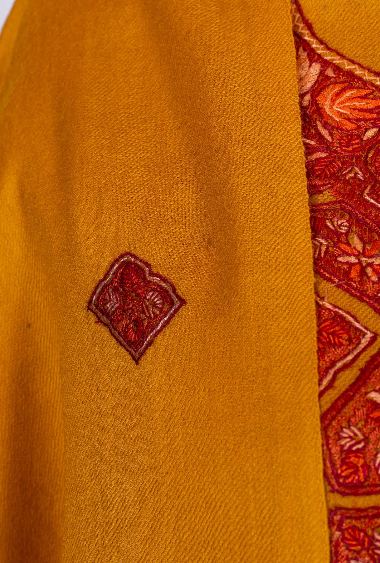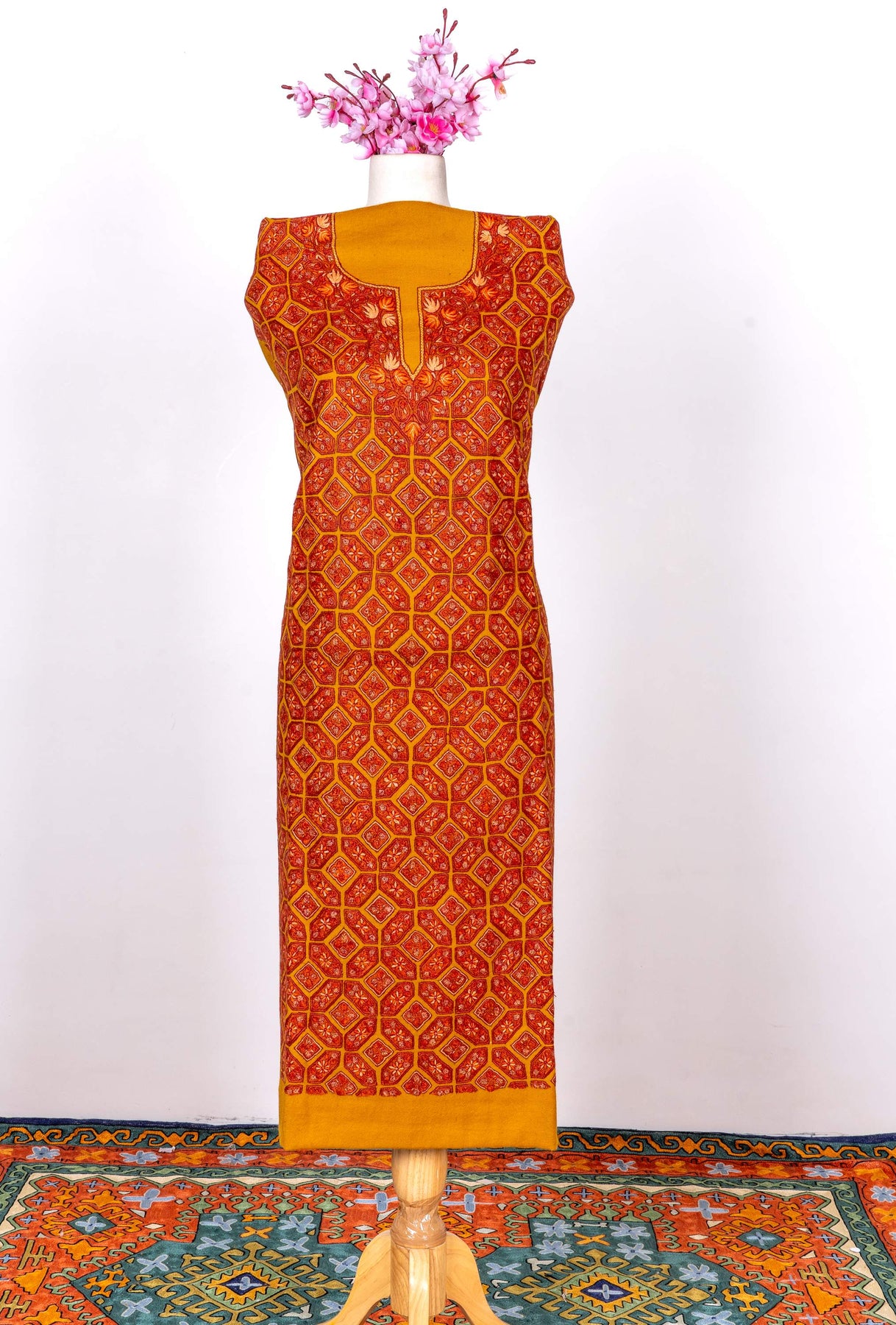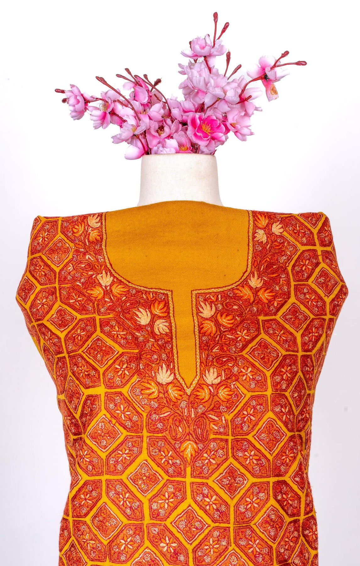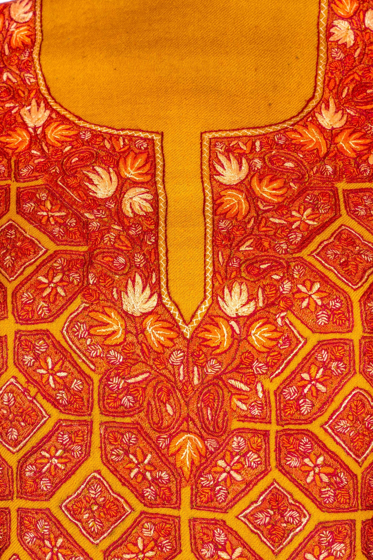 This Sozni Hand Embroidered Suit in fine merino wool features a rich marigold base paired with a striking geometric embroidered panel across the front. The detailed neckline and bold patterning create a vibrant yet traditional aesthetic rooted in classic design.