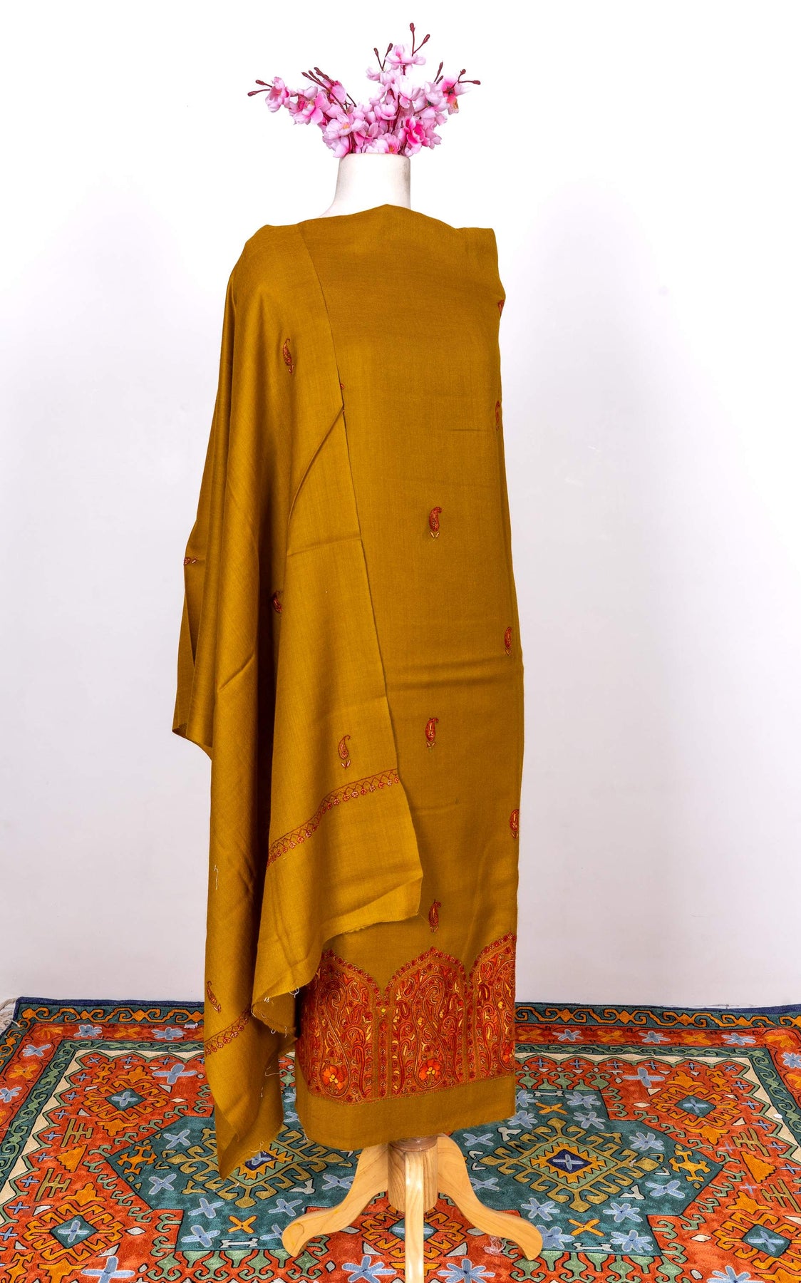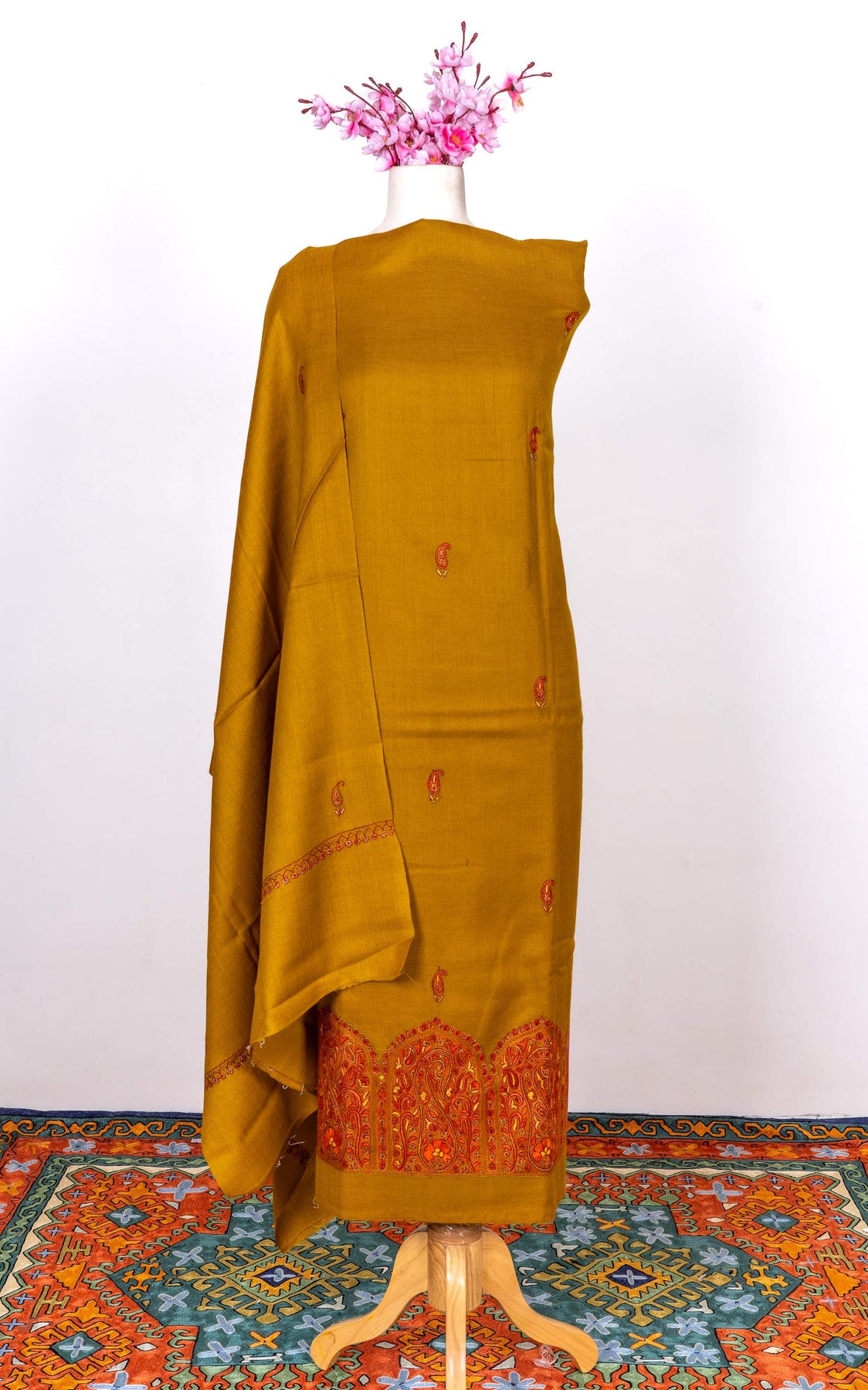 This Sozni Hand Embroidered Suit in fine merino wool is presented in a luminous saffron gold shade, enriched with traditional Sozni motifs and a richly detailed lower border. The color radiates warmth and sophistication, making it a standout piece for special occasions.