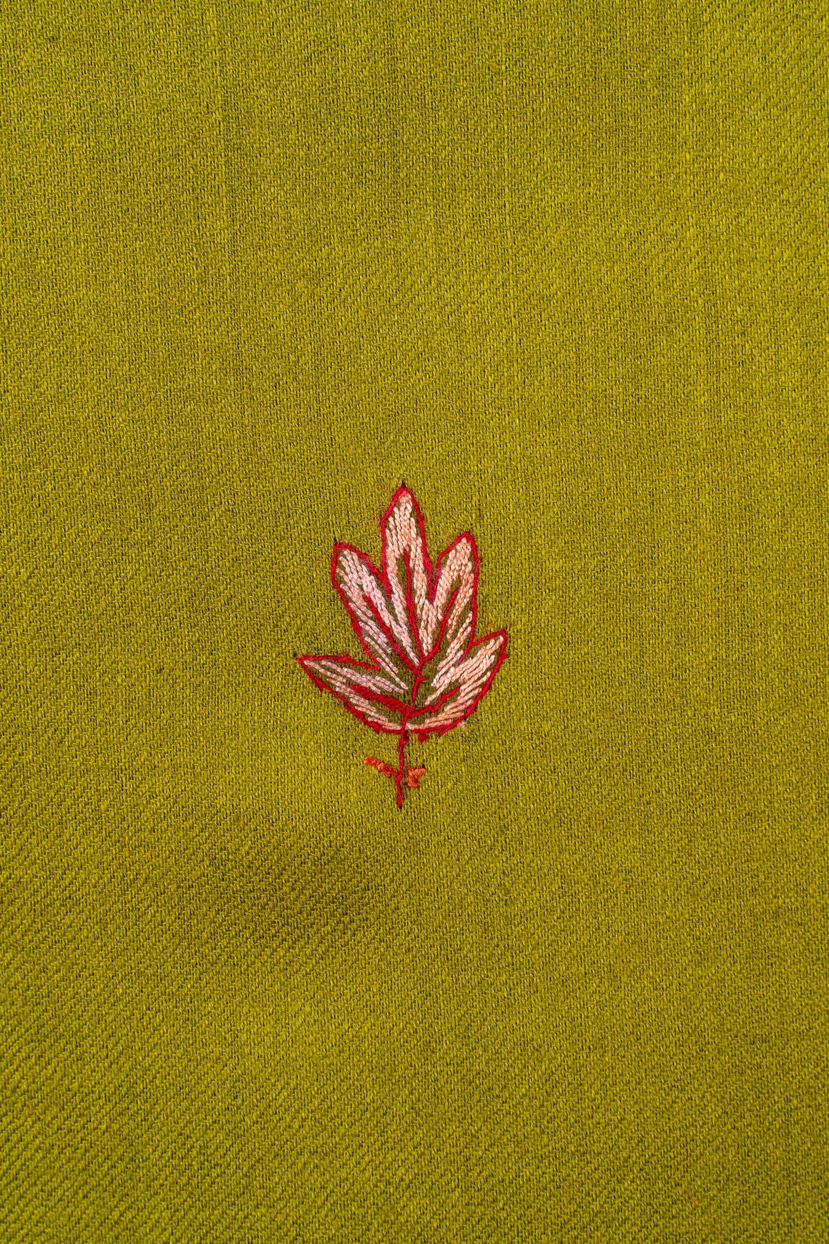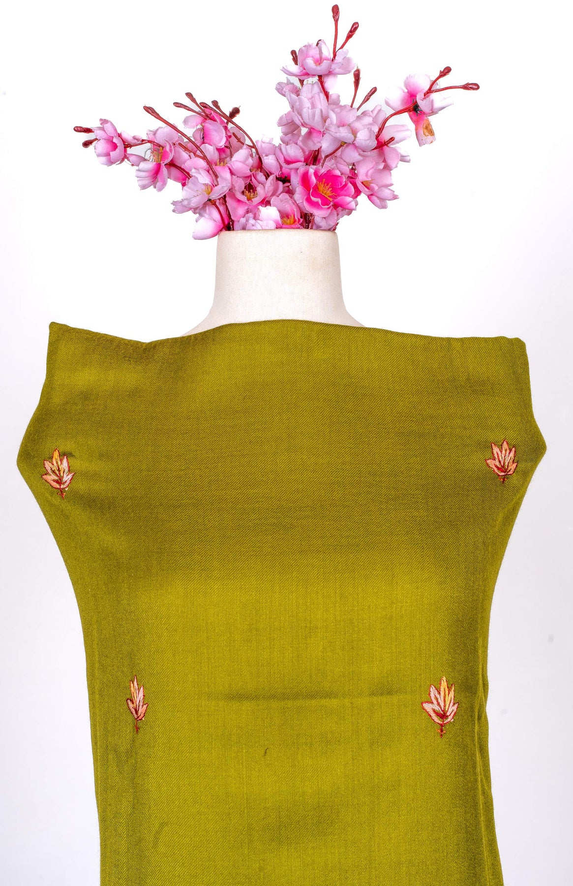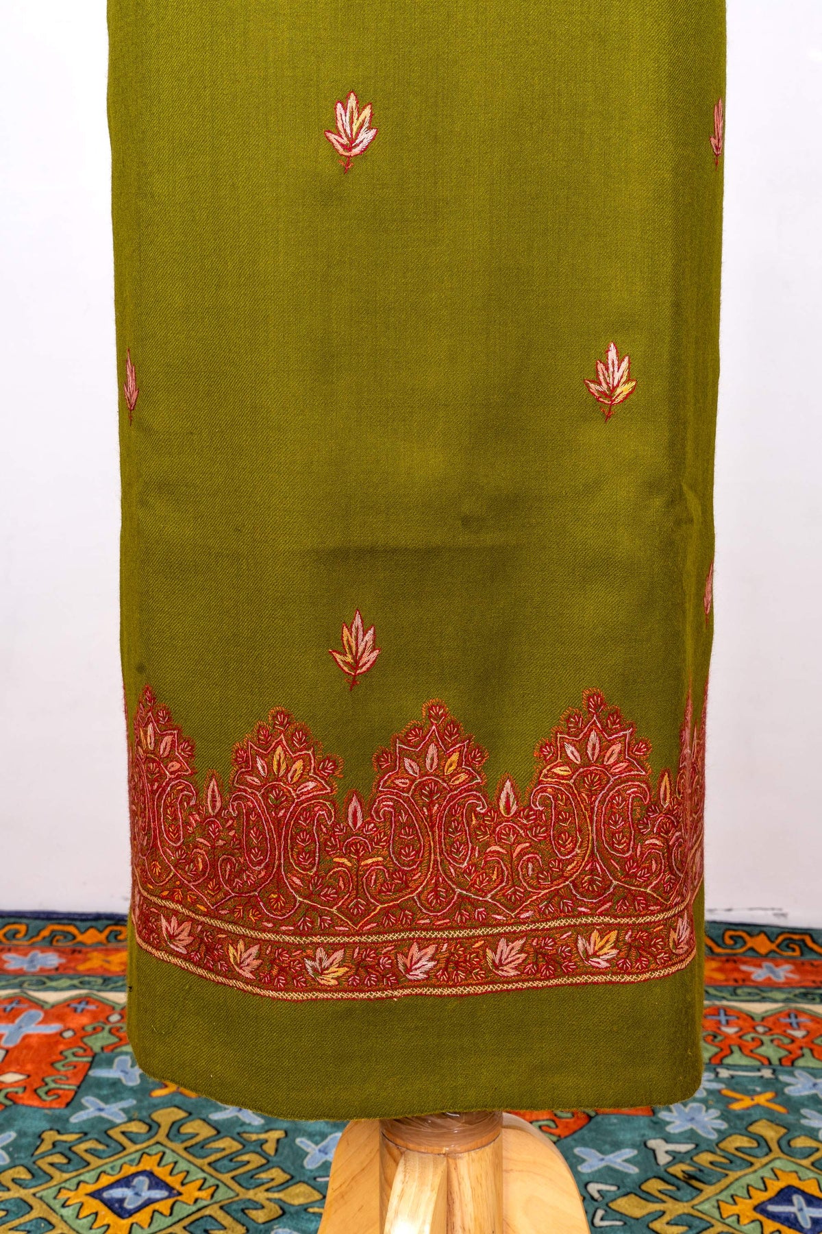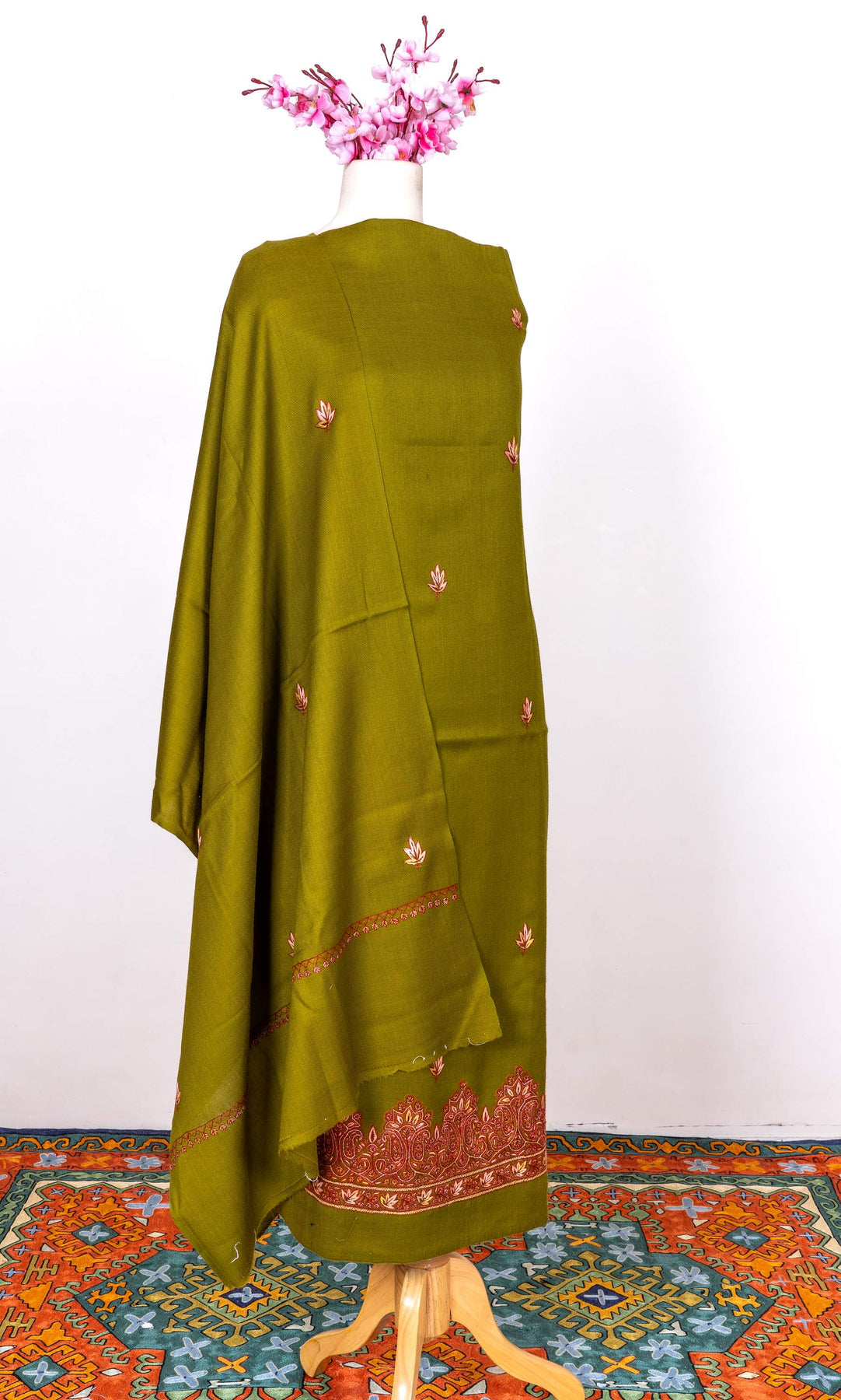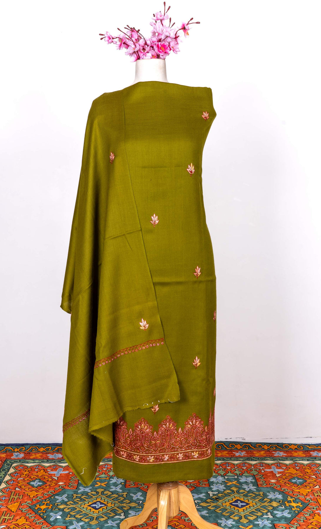 This Sozni Hand Embroidered Suit in Fine Merino Wool showcases a serene olive tone adorned with finely detailed Sozni motifs. The embroidery is thoughtfully placed, adding richness without overpowering the natural elegance of the fabric.