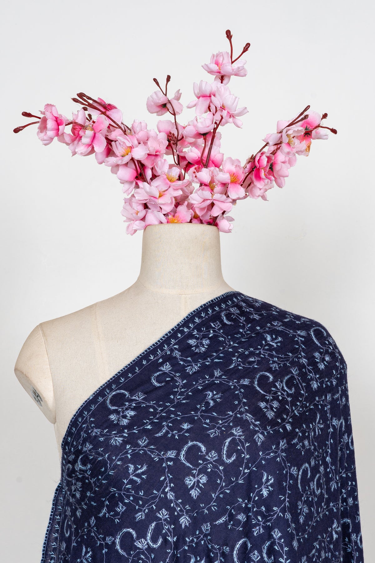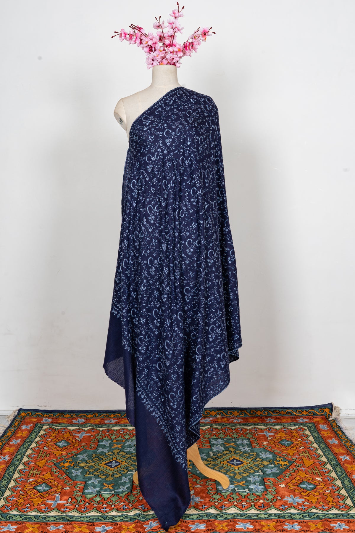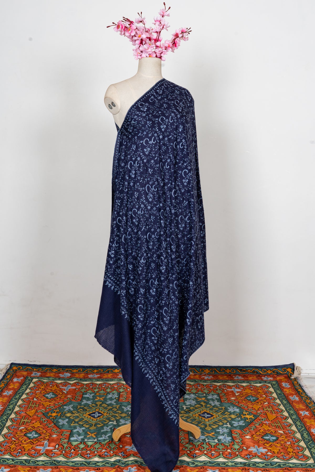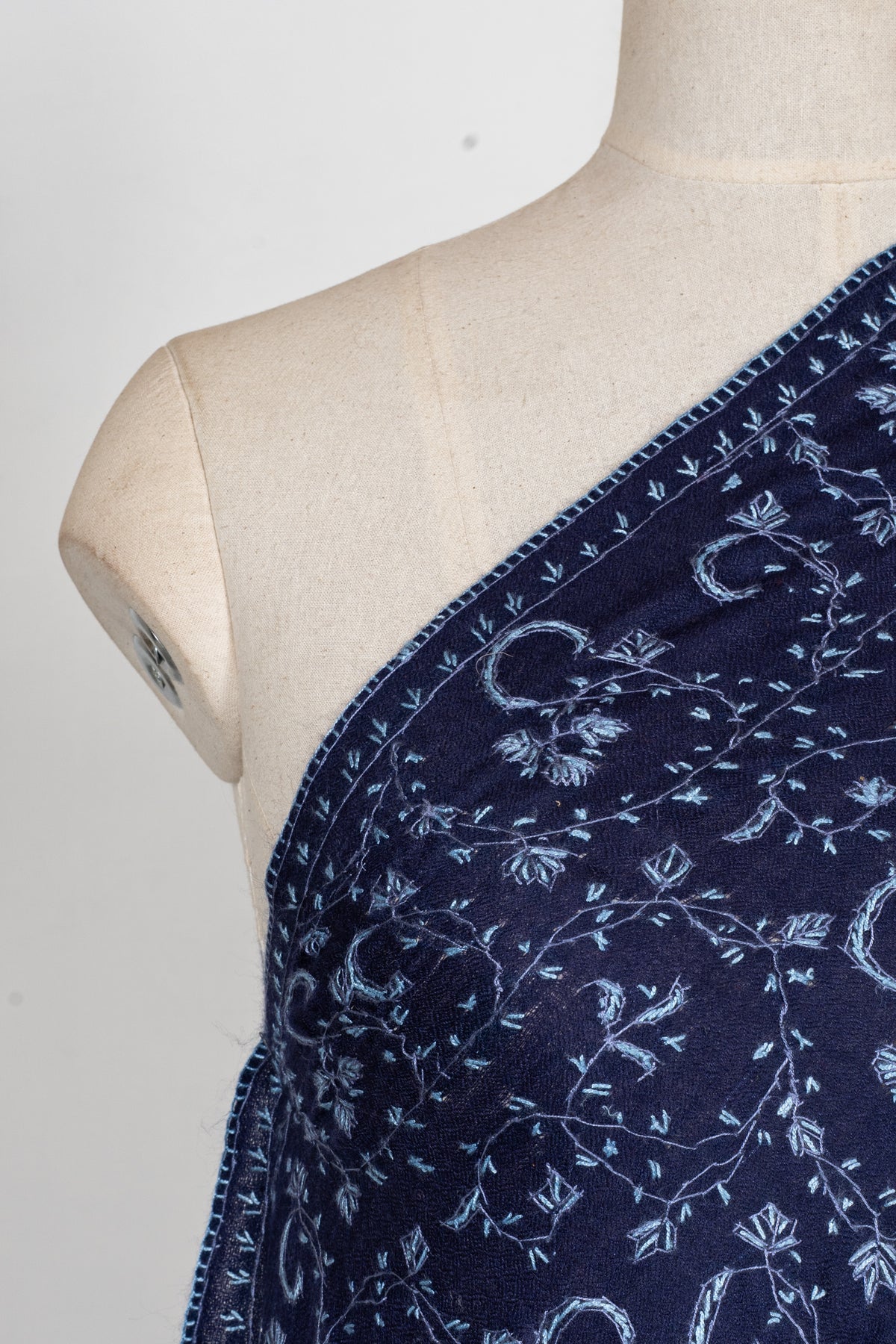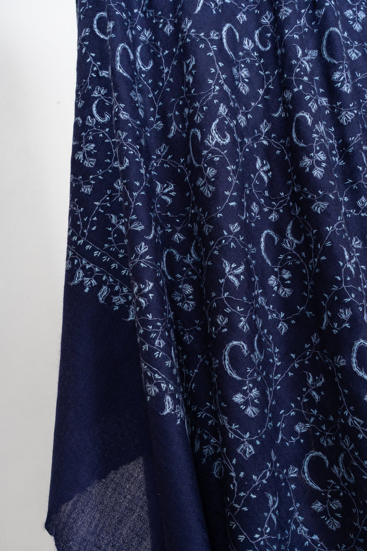Set in a rich indigo tone, this shawl features finely embroidered vine patterns that spread gracefully across the fabric. The depth of the color combined with the delicate detailing creates a refined and regal aesthetic.